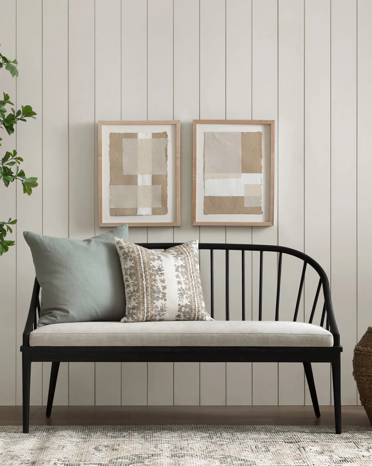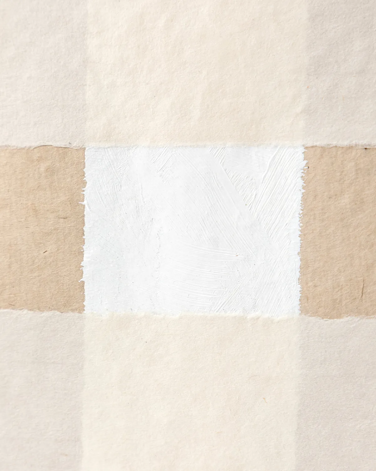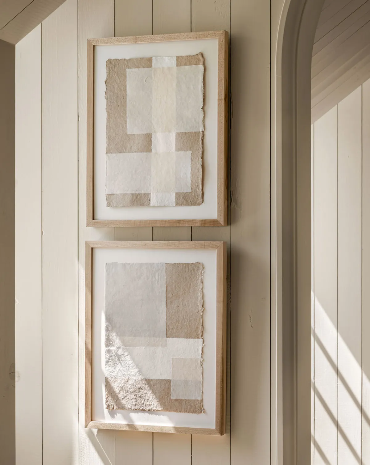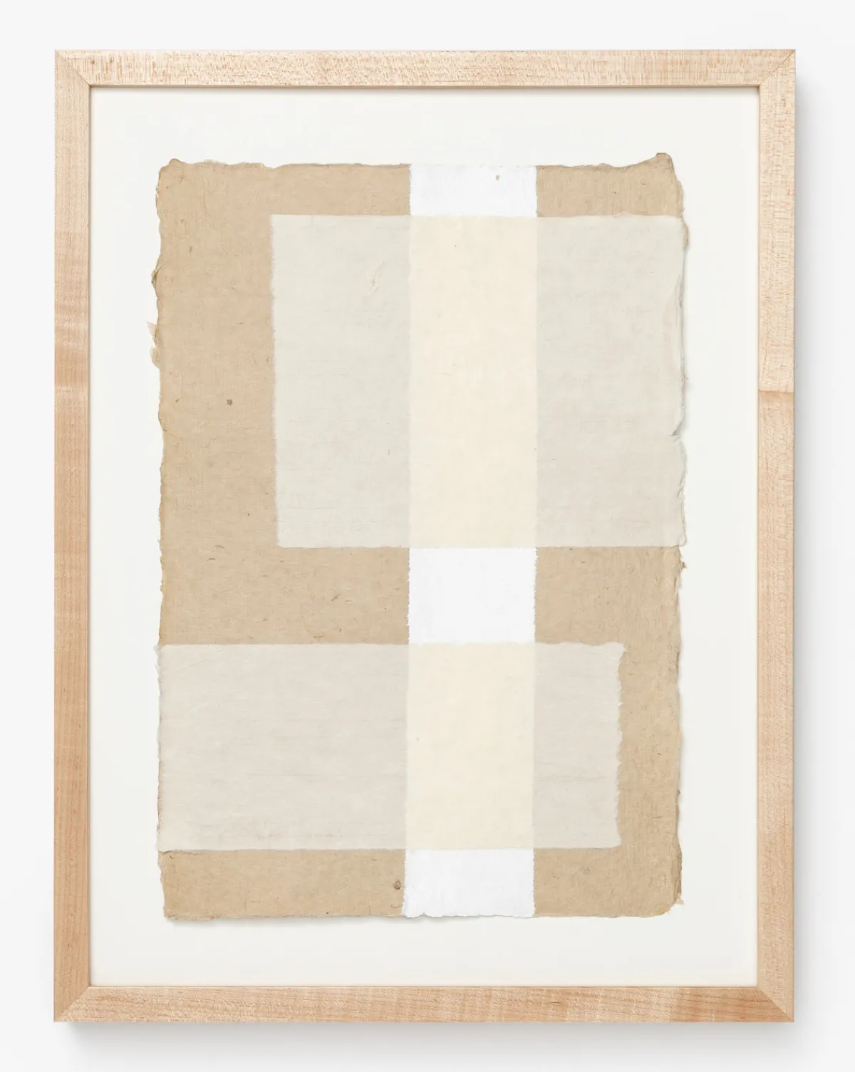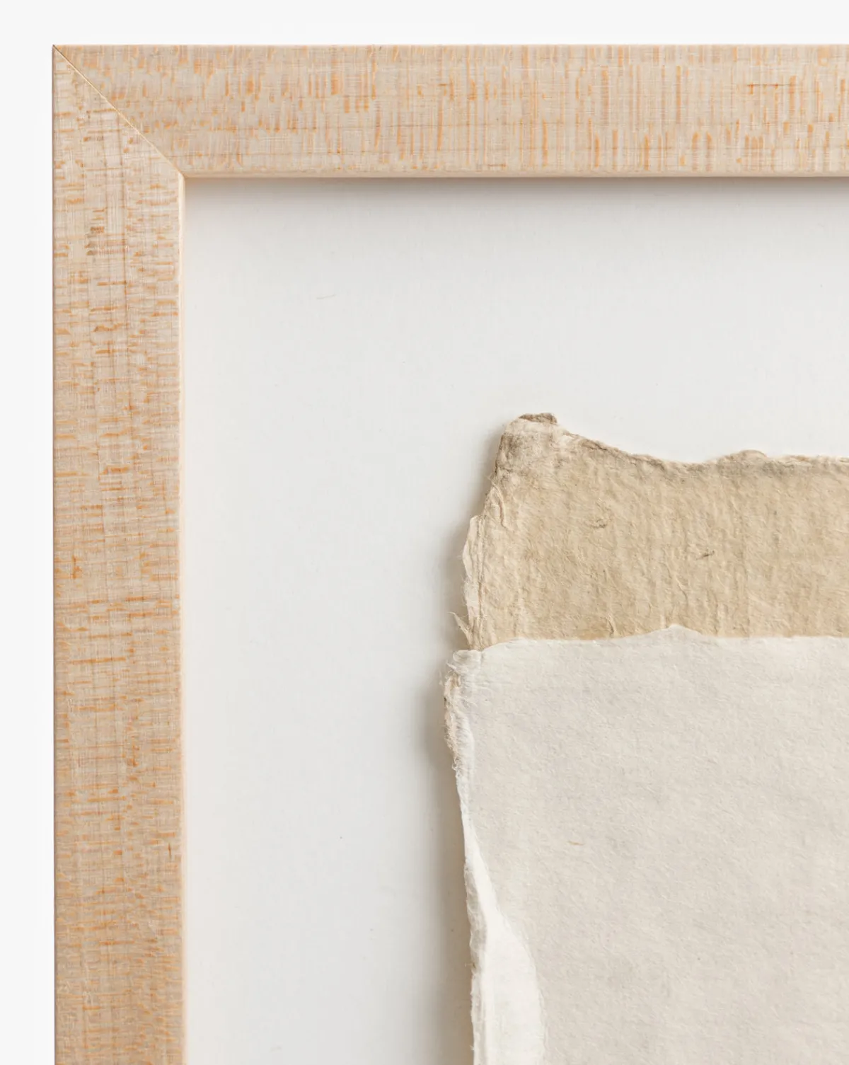 Neutral and textural, Collage 2 is a study in composition. Its simple palette allows the texture of the handmade paper to shine, while highlighting the creativity of the piece. Presented within a maple wood frame, this piece brings a uniquely dimensional feel to vignettes or wall treatments.