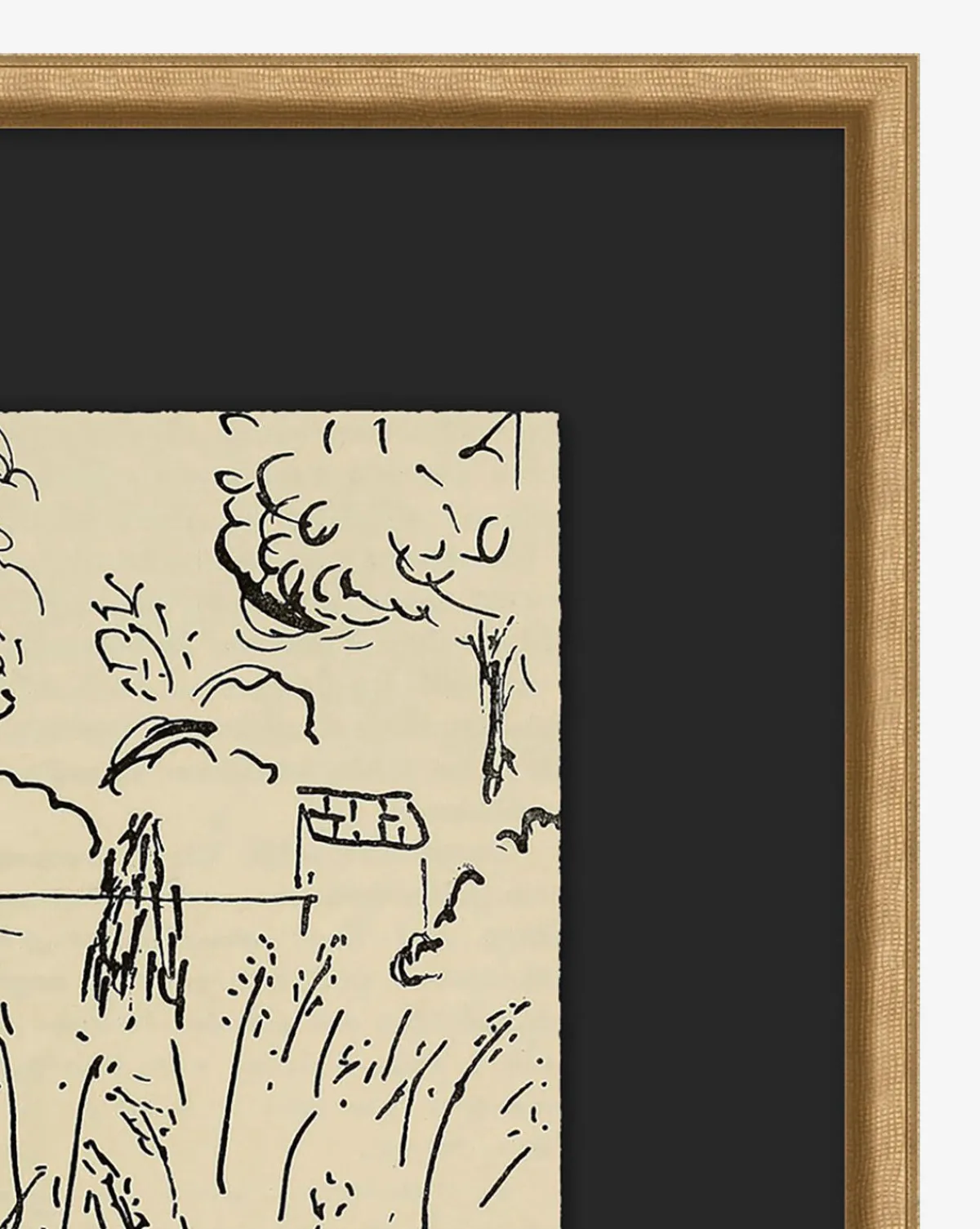 With the feel of a vintage illustration, Courtyard is simple yet captivating. The sketch depicts a plant-filled courtyard, that is warm and inviting in its spaciousness. Deckled and floated on a mat, the piece is framed by gold-finished wood.