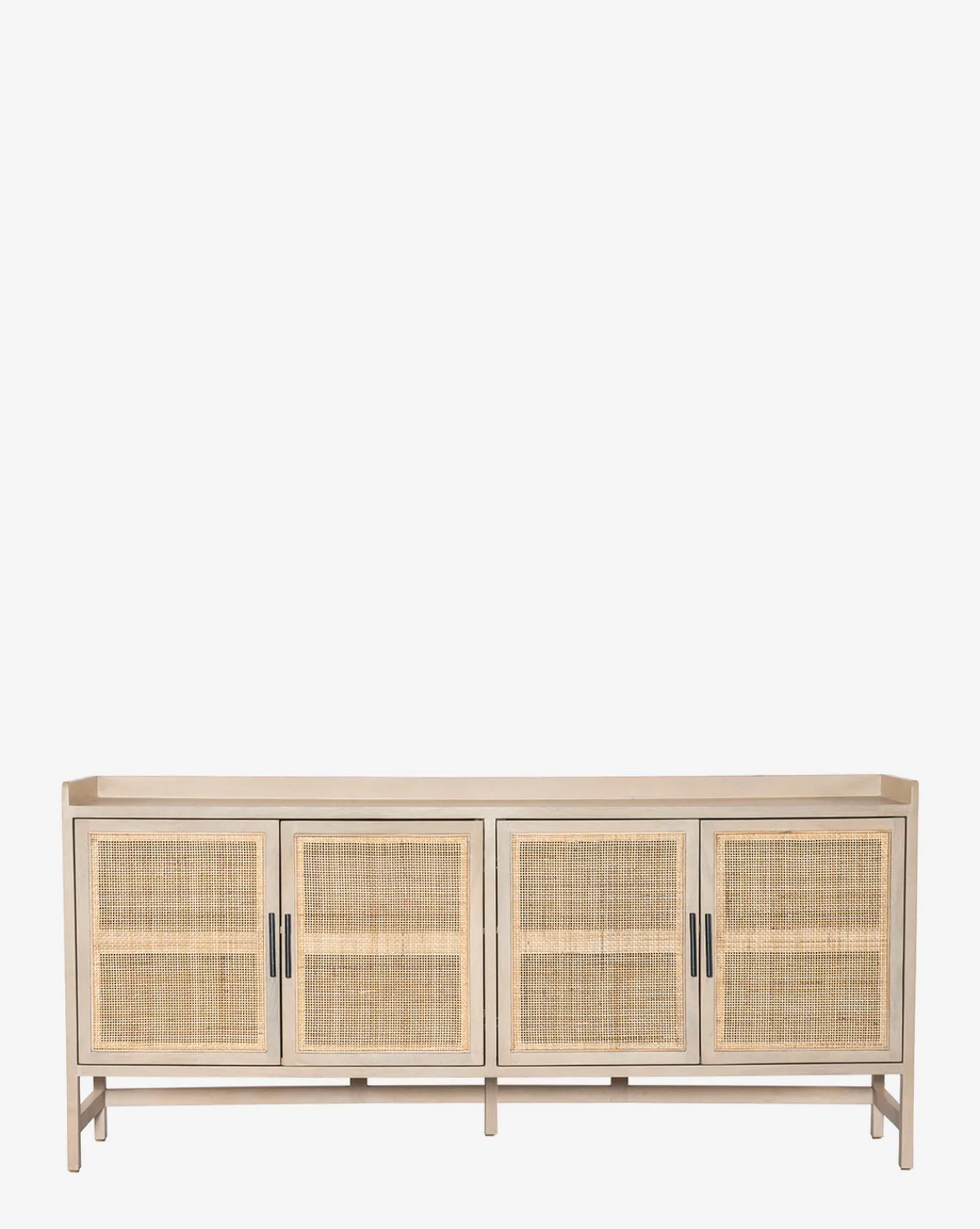 Set the mood with the high-contrast design of the Dahlia Sideboard. With textural woven cane fronts, and mango wood framing, this sideboard features spacious shelving for dinnerware and more, all finished with sleek black iron hardware.