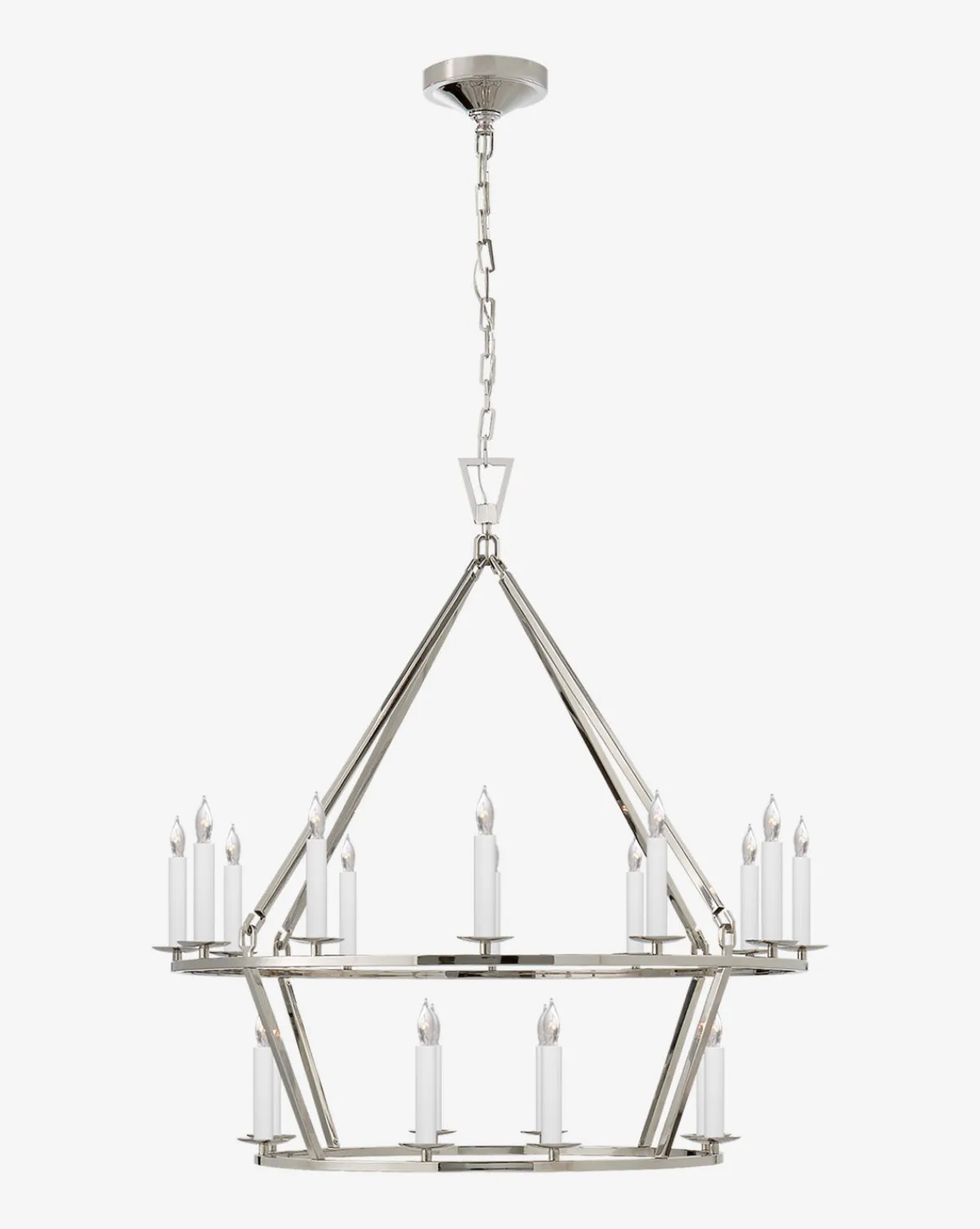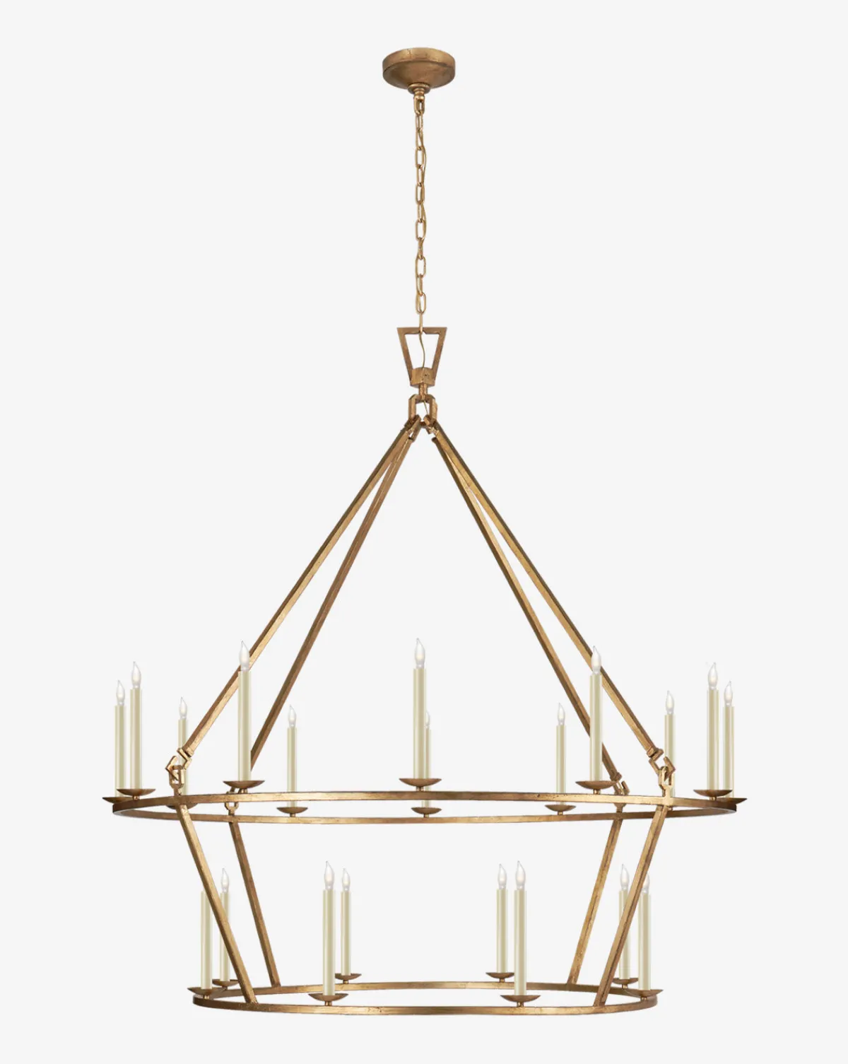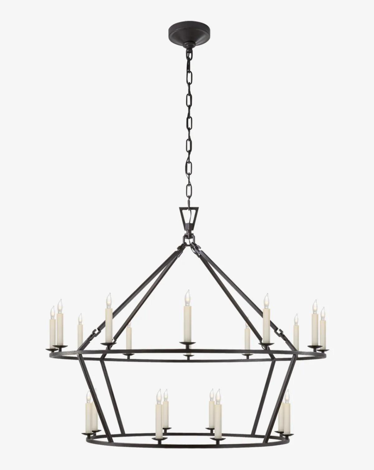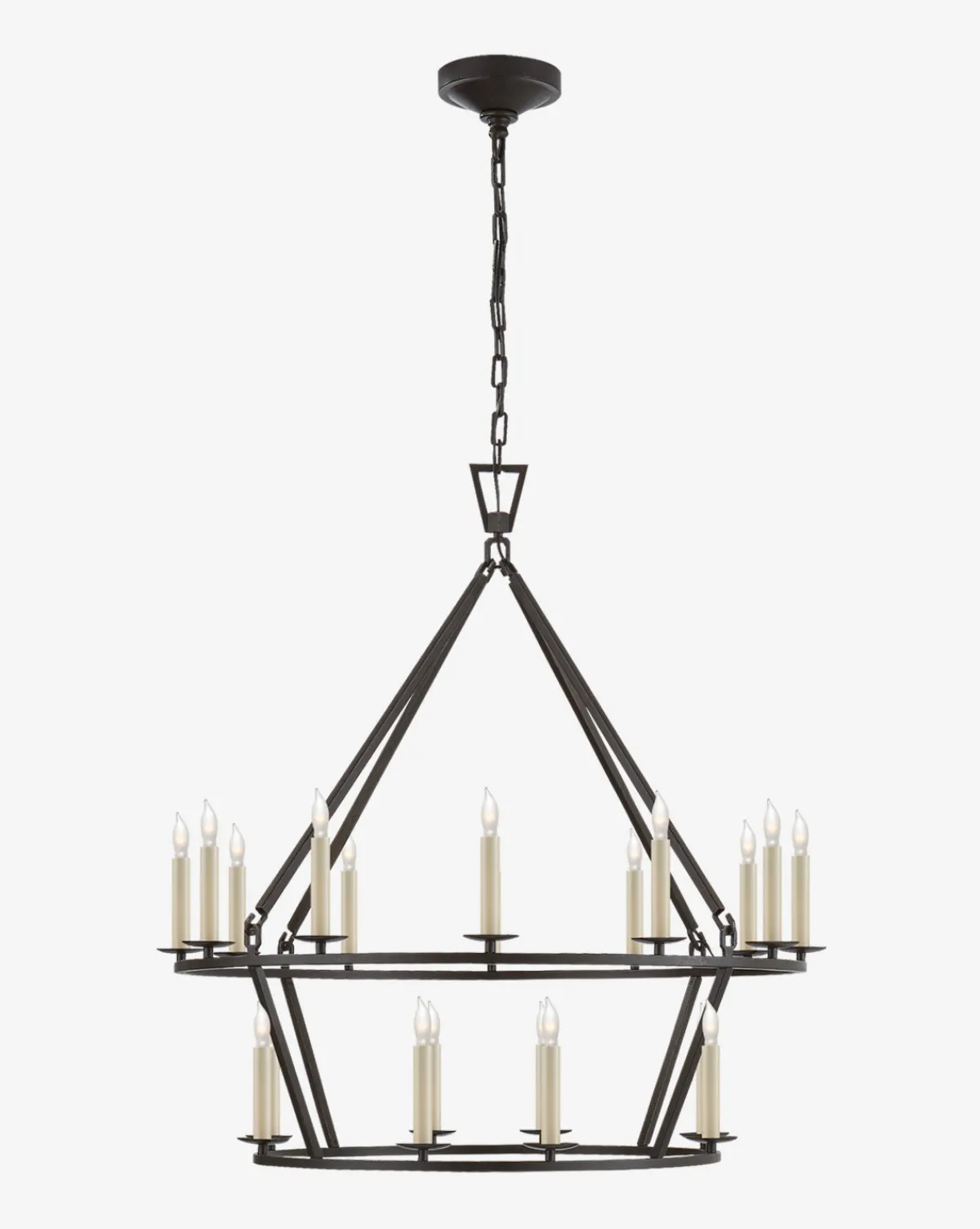 Two tiers surrounding a geometric shape create this industrial fixture that lights up your space in more ways than one. Our Darlana chandelier pairs a modern base with classic candle style lamps, updating your lighting with eclectic style.
