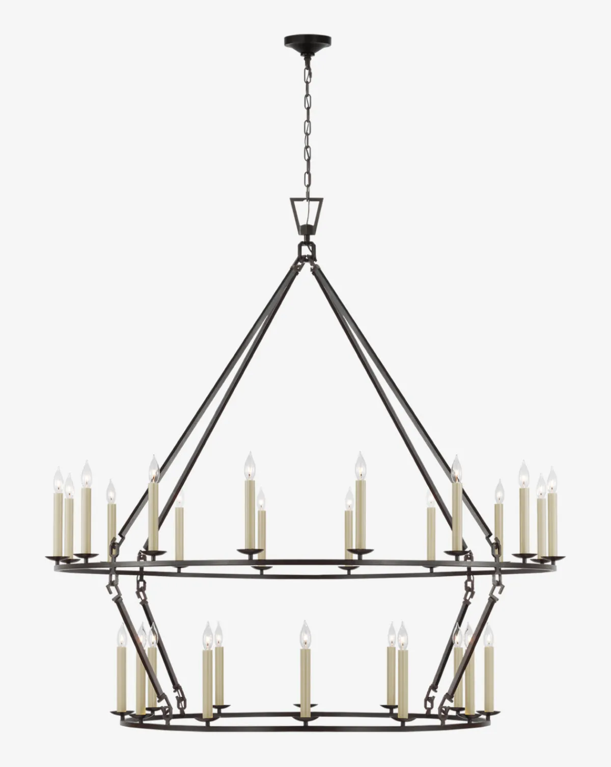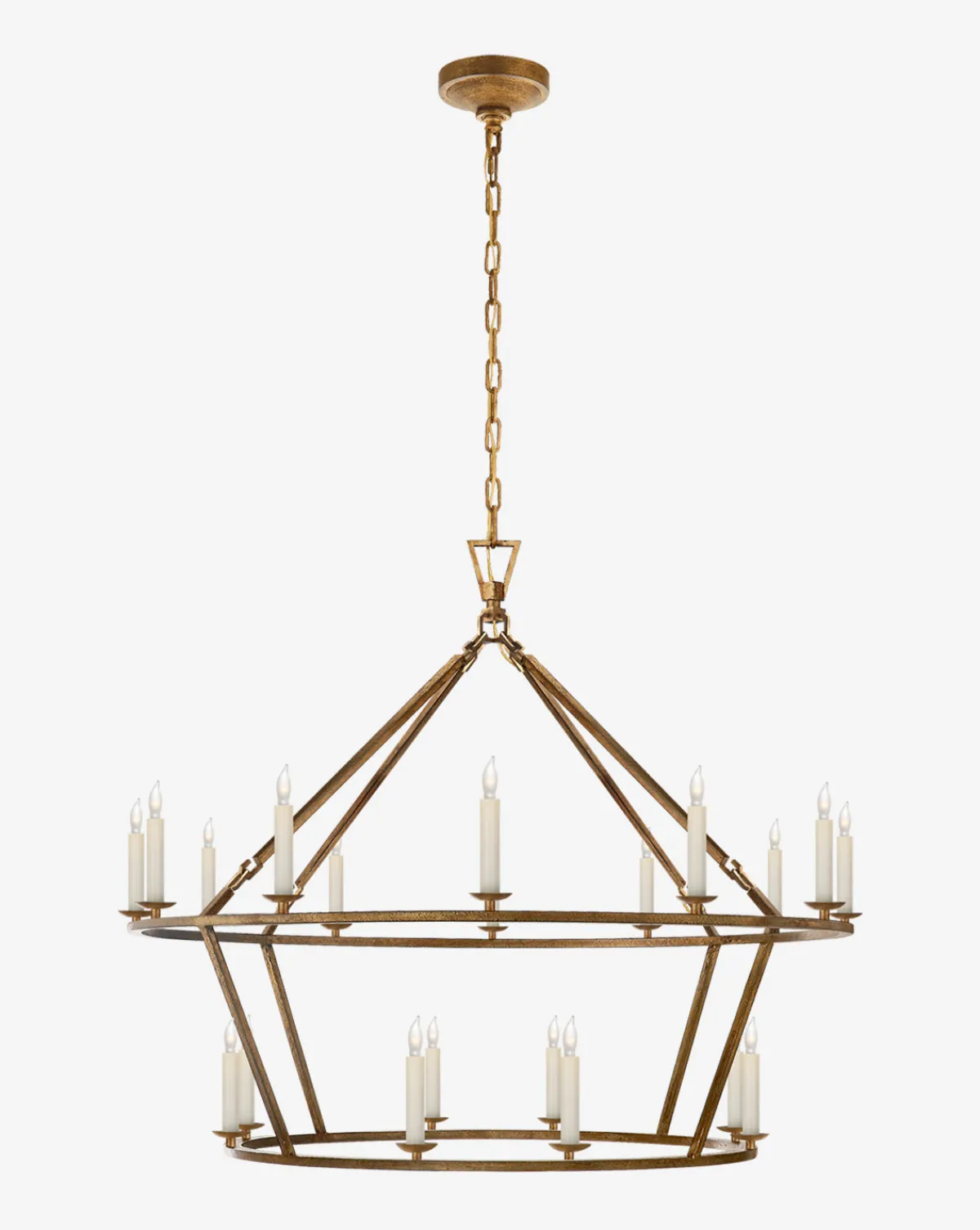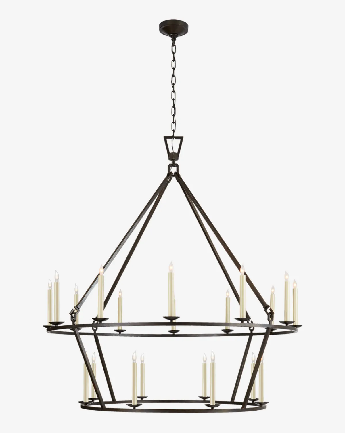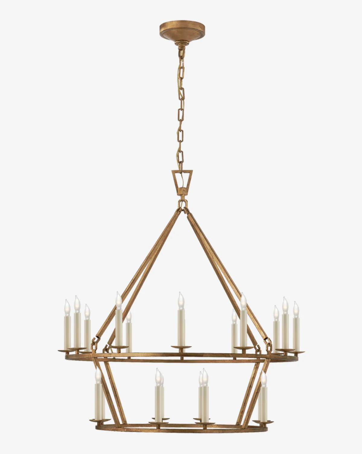 Two tiers surrounding a geometric shape create this industrial fixture that lights up your space in more ways than one. Our Darlana chandelier pairs a modern base with classic candle style lamps, updating your lighting with eclectic style.