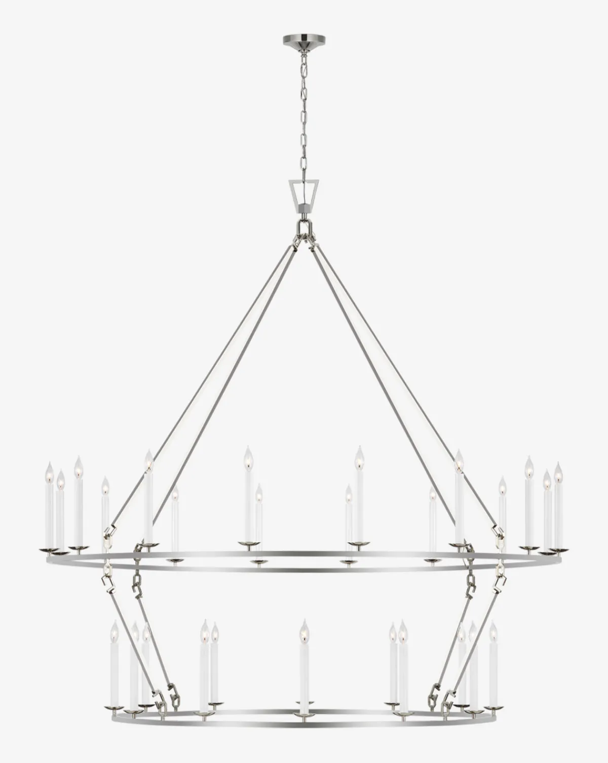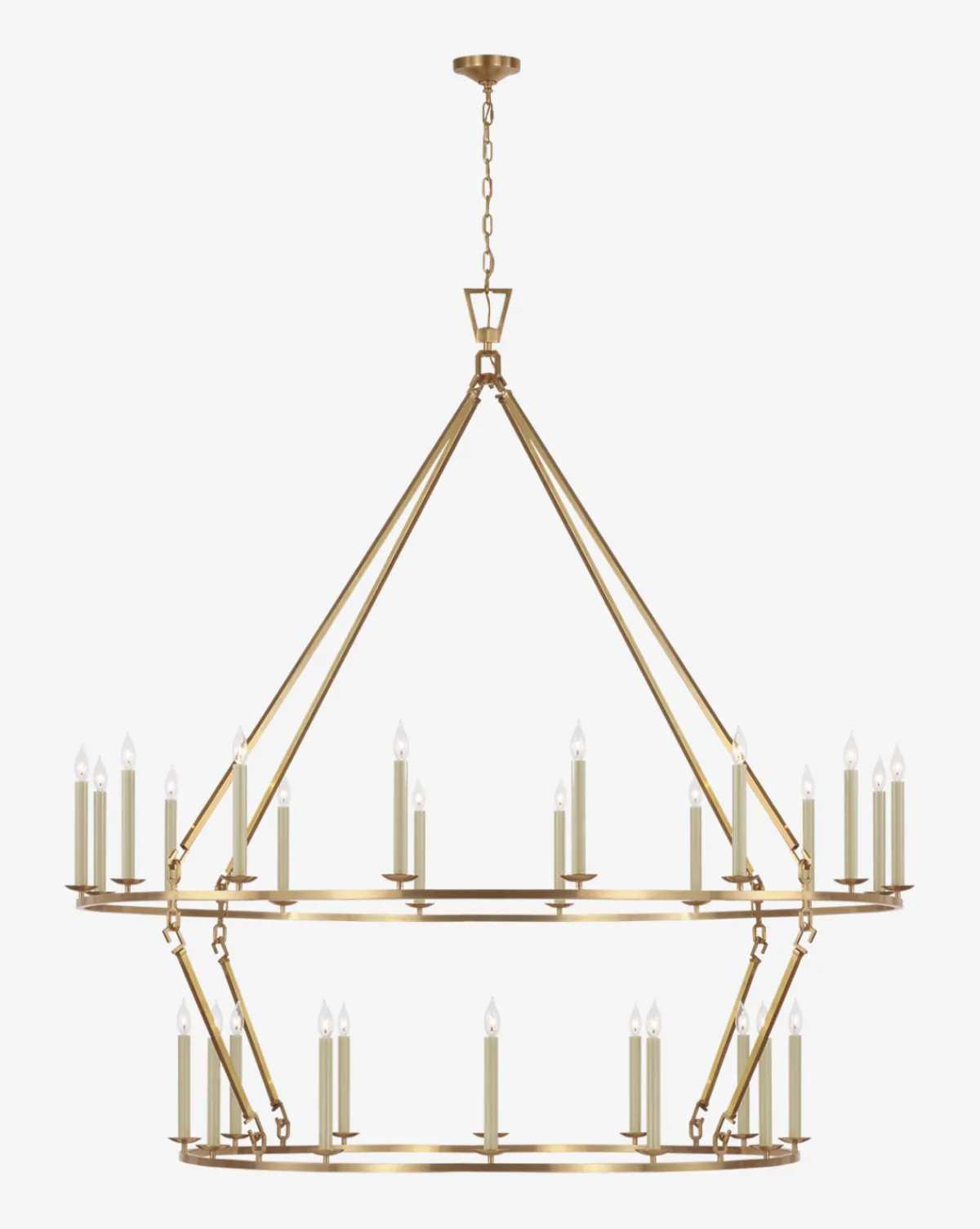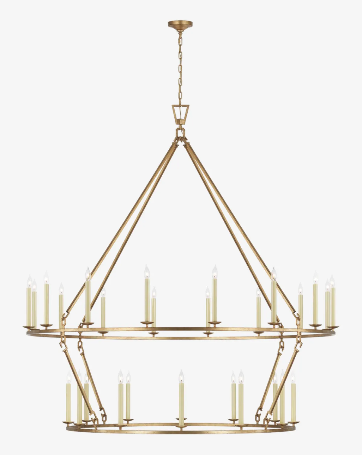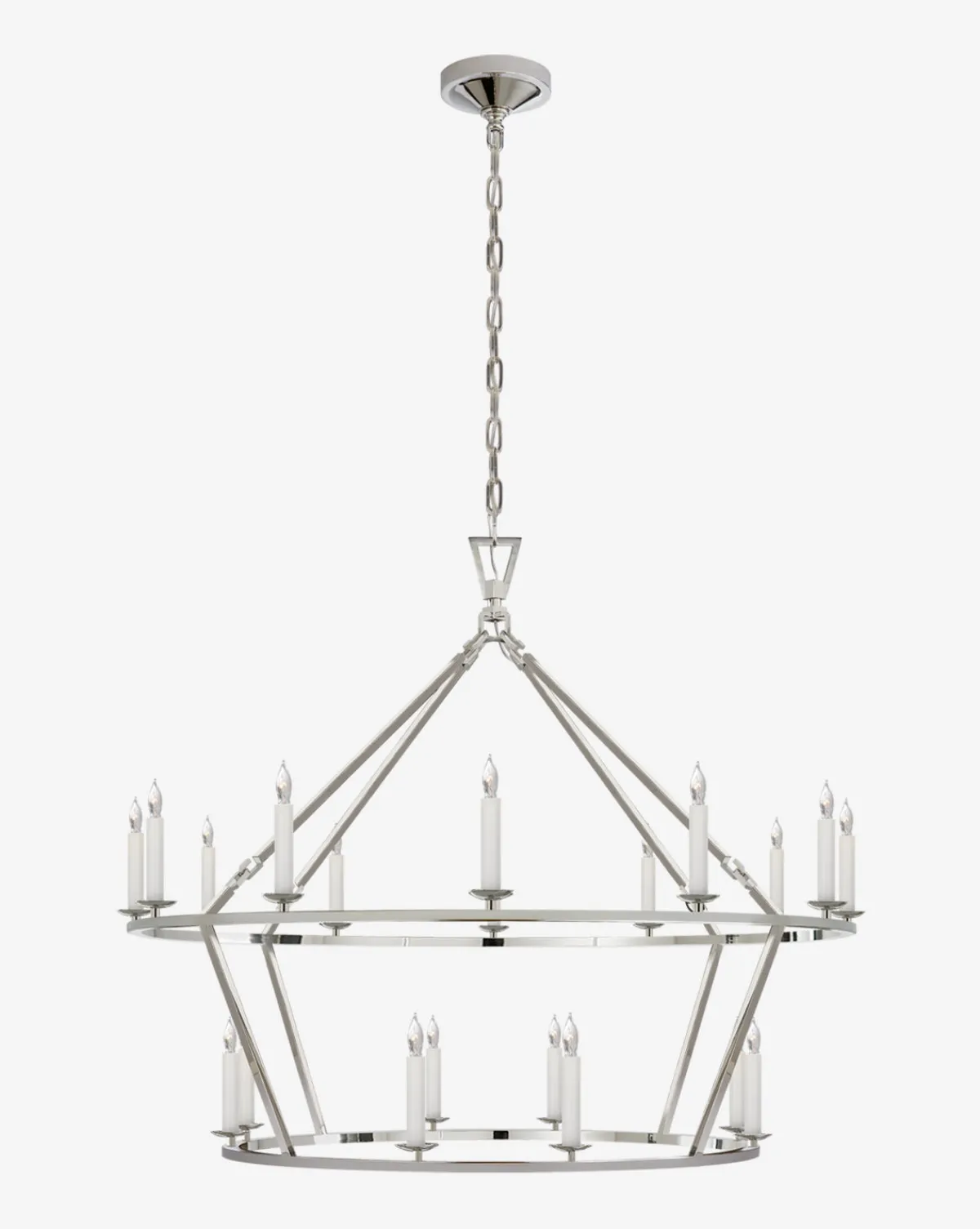 Two tiers surrounding a geometric shape create this industrial fixture that lights up your space in more ways than one. Our Darlana chandelier pairs a modern base with classic candle style lamps, updating your lighting with eclectic style.
