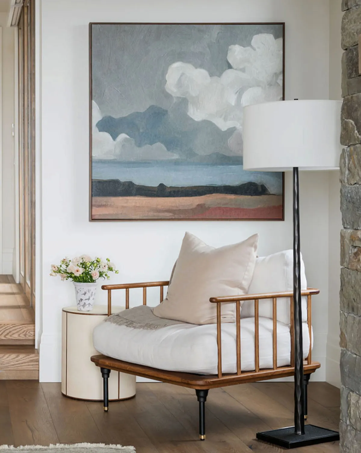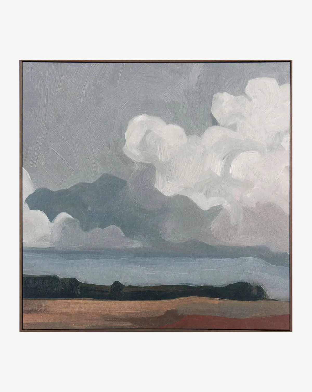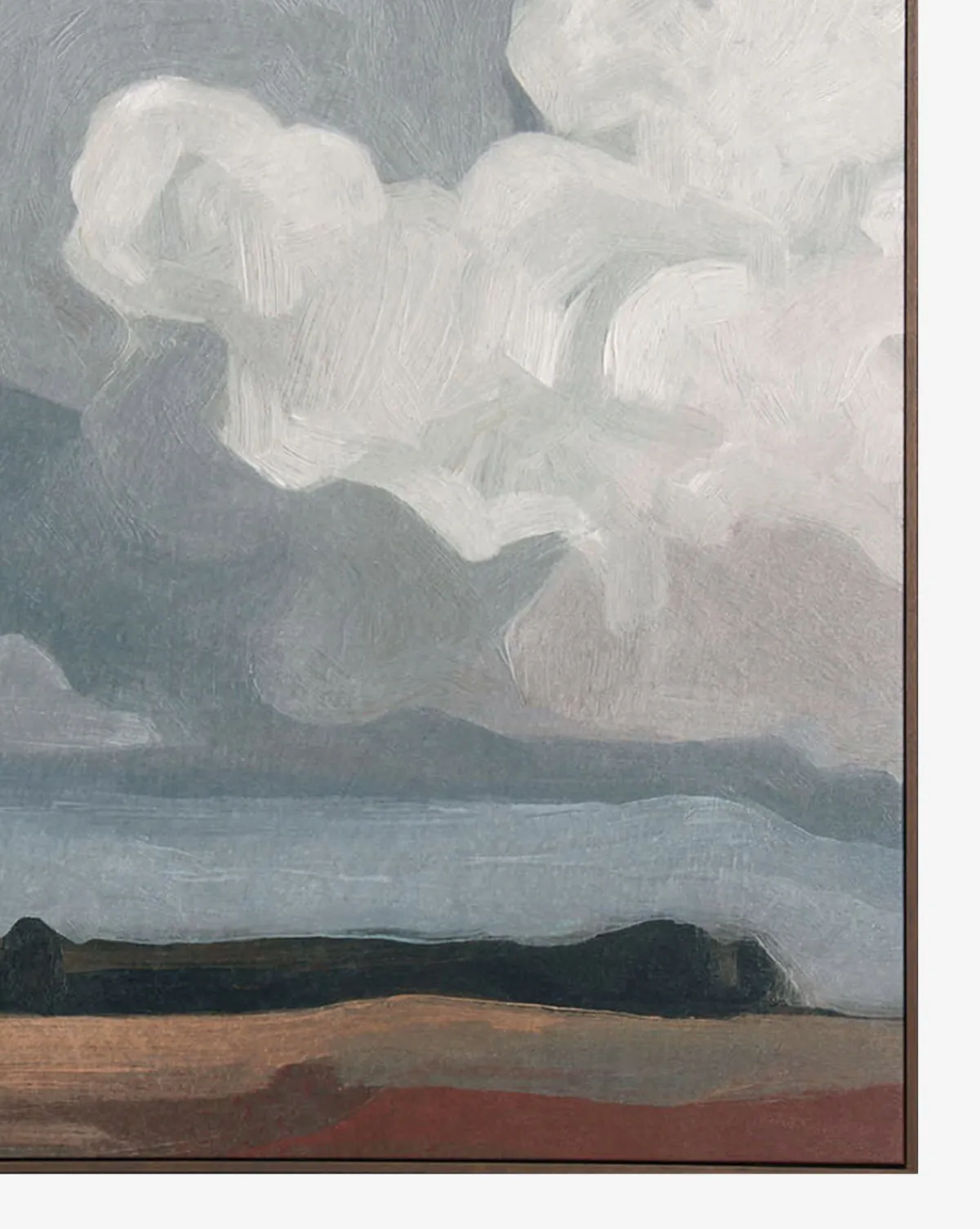 An ominous sky with textured clouds frame the landscape of this abstract landscape piece. With both warm and cool tones, this painting brings out the best palette in your home design.