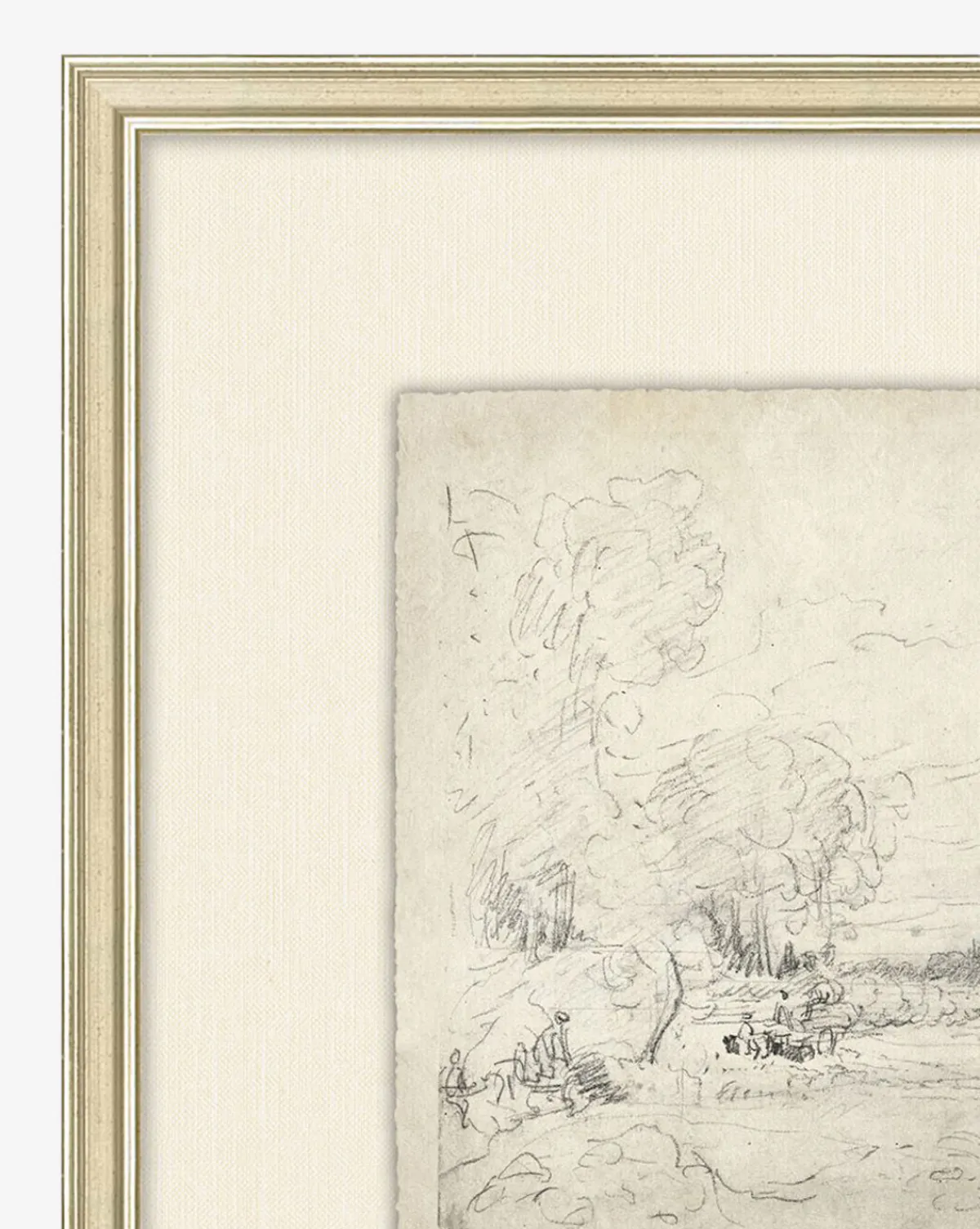 With a subtle composition, French Countryside III is inviting and intricate. The sketch depicts an expanse in nature before a quaint town, with intricate linework. Deckled and floated on a mat, the piece is framed by silver-finished wood.