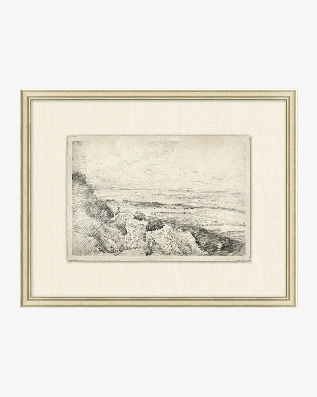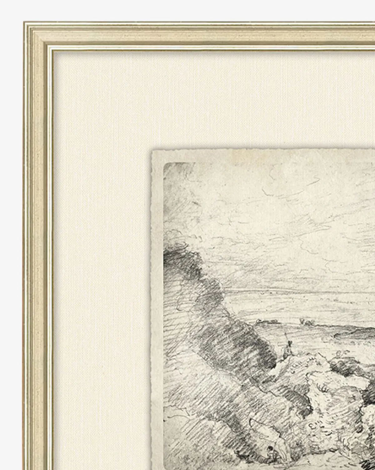 With a welcoming composition, French Countryside IV is subtle yet intricate. The black and white sketch depicts lush hills before an expansive valley with detailed linework. Deckled and floated on a mat, this piece is framed by silver-finished wood.