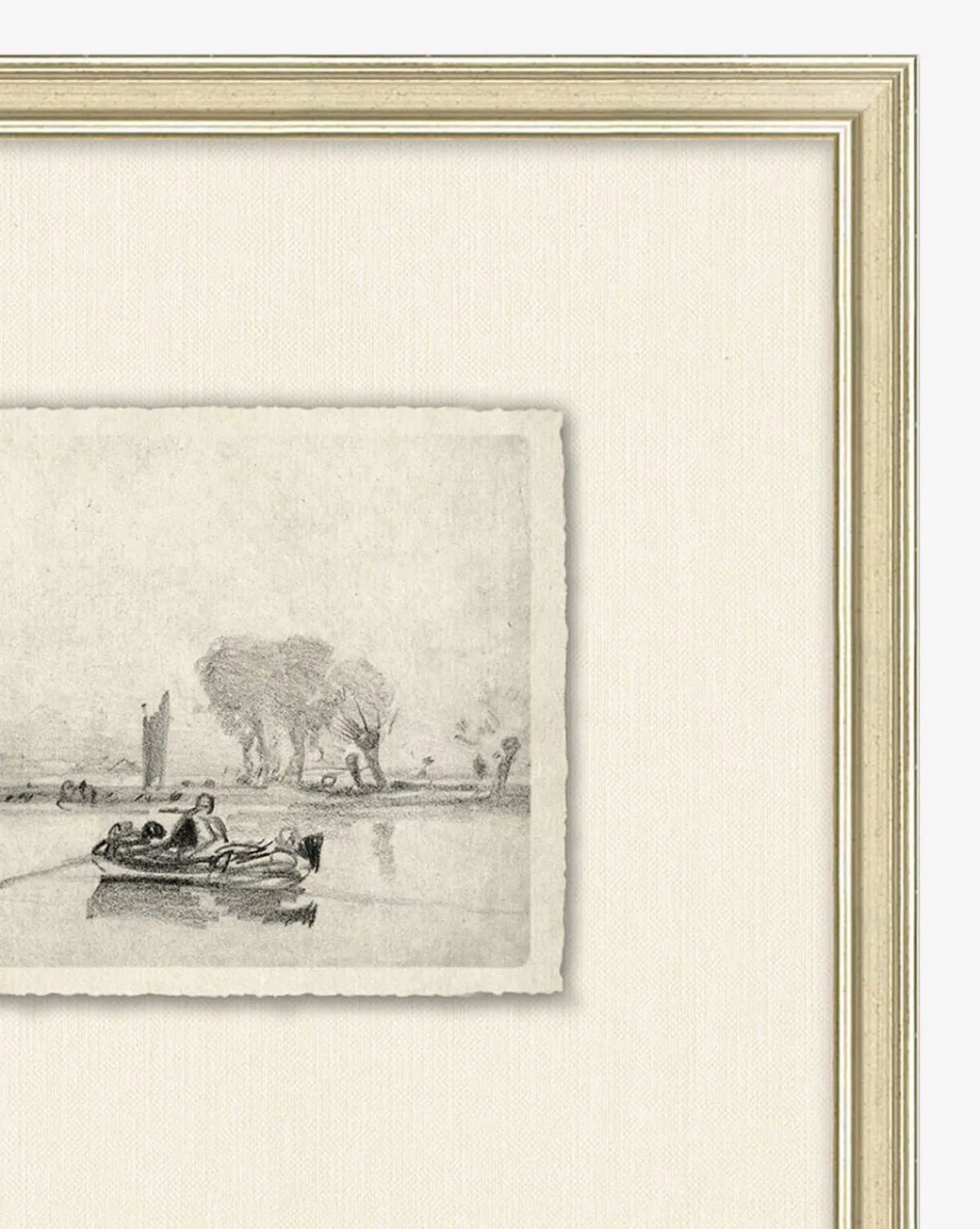 With a subtle composition, French Countryside V is inviting and intricate. The sketch depicts an expanse in nature before a quaint town, with intricate linework. Deckled and floated on a mat, the piece is framed by silver-finished wood.