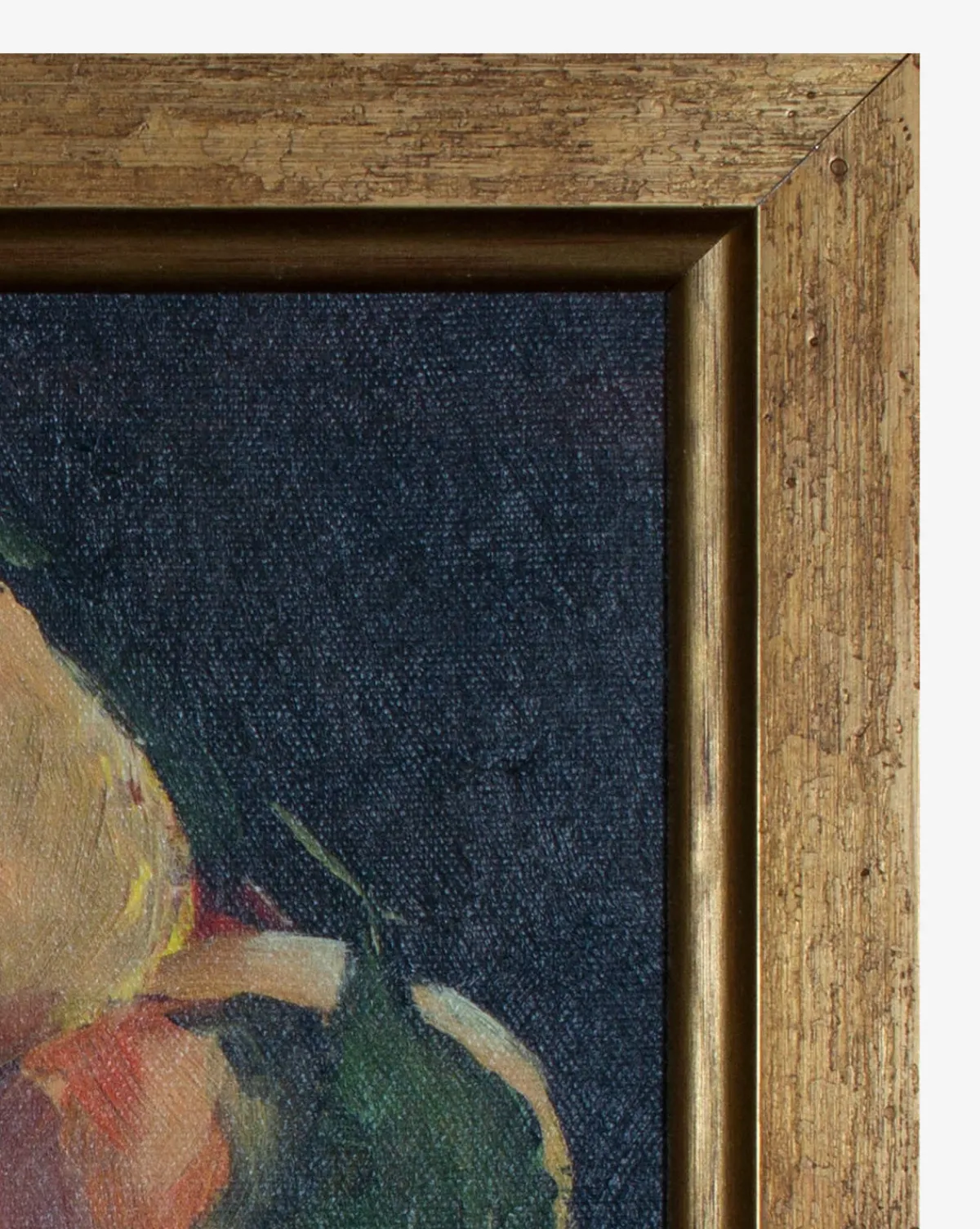 Playing with shadow and form, Fruit in a Blue Bowl is a dramatic yet inviting still life. The dark background allows the thick brushstrokes of the fruit to shine, complemented by the subtly intricate green leaves. With a gold wood frame and museum-quality materials, the piece brings sophisticated detail to your space.