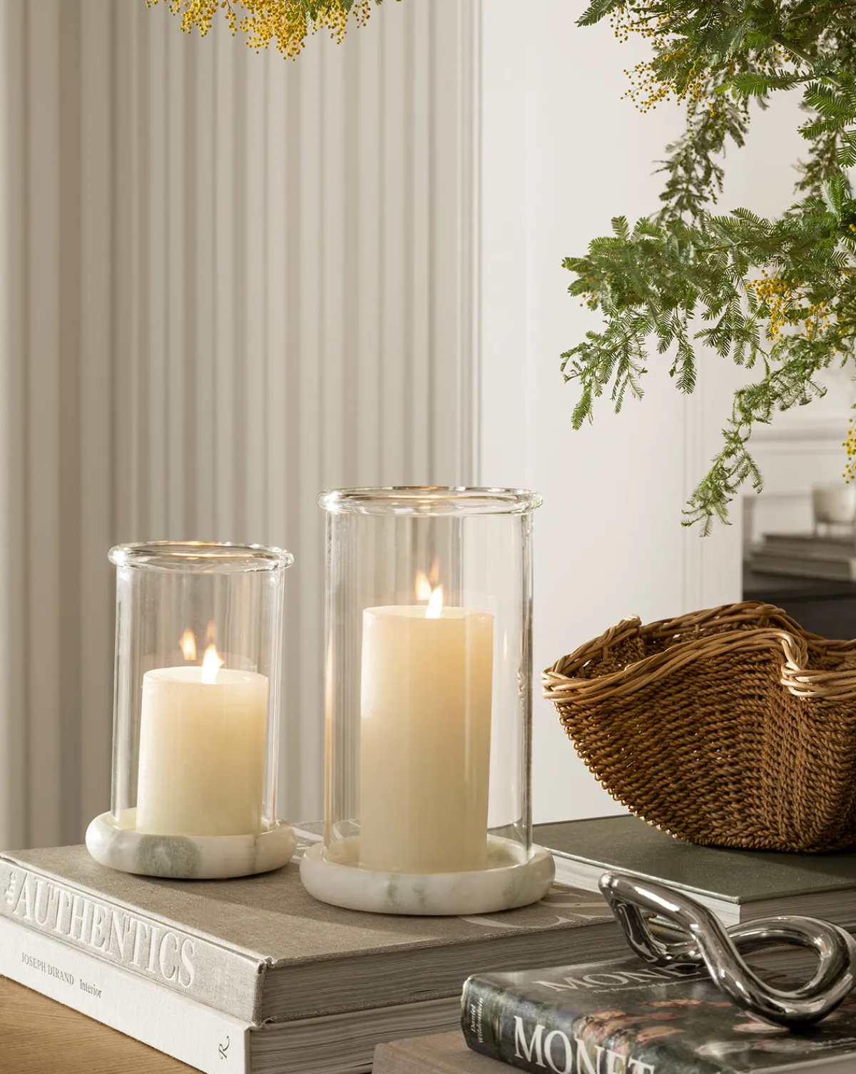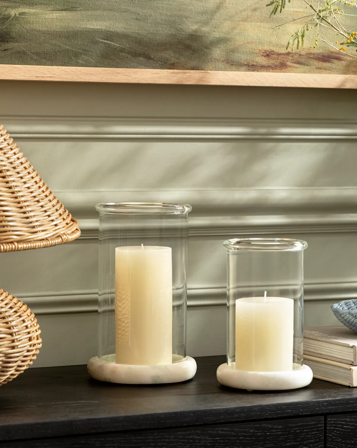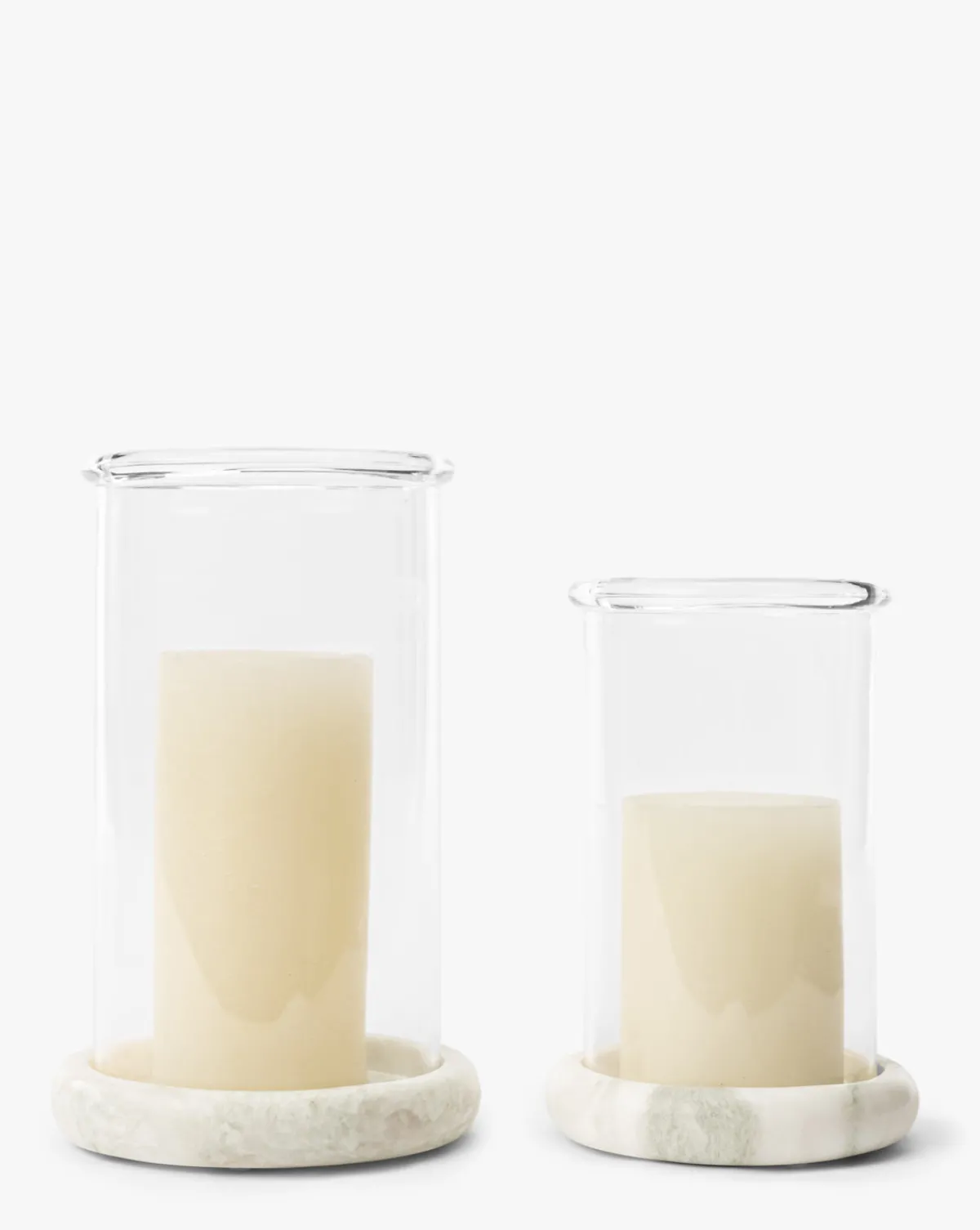 Crafted with a thoughtful mix of materials, our Greta Glass Hurricane exudes a unique and refined elegance. Made from recycled glass, the cylinder is topped with a rolled lip and set on a Lady Onyx marble base, offering a harmonious blend of natural beauty and luxury. The distinctive yet versatile design elevates your candle displays from countertops to console vignettes.