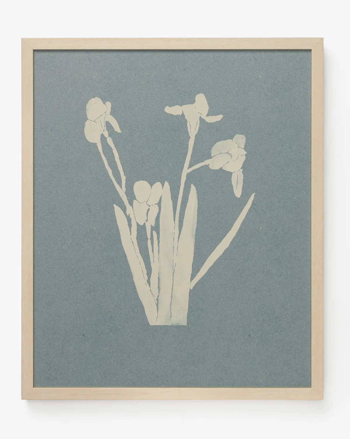 In a cool palette of blue and white, Iris Ink Block depicts a block print painting of iris flowers. The contrast and composition of the piece bring a playful simplicity to the walls of your children’s room.