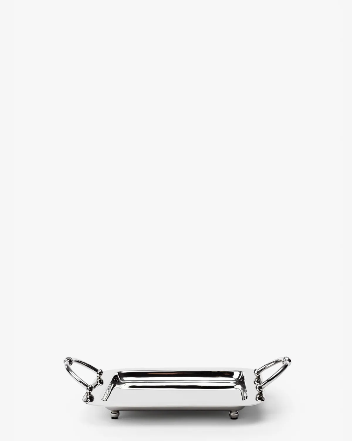A beautiful and bold accessory, the Lionel Tray adds modern detail to your decorative vignettes with its nickel finish. The shallow tray with large handles brings practical elegance to coffee tables or dressers.