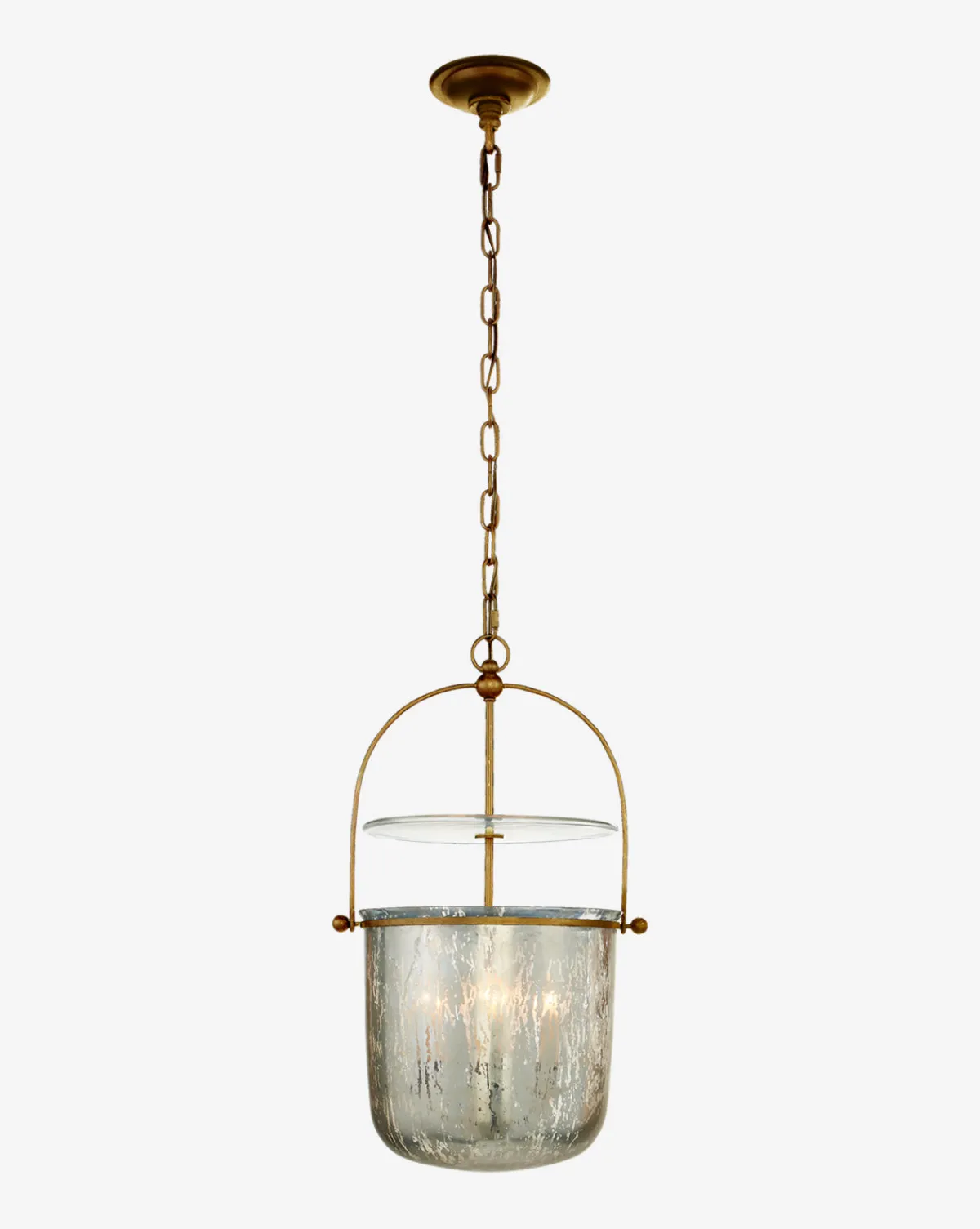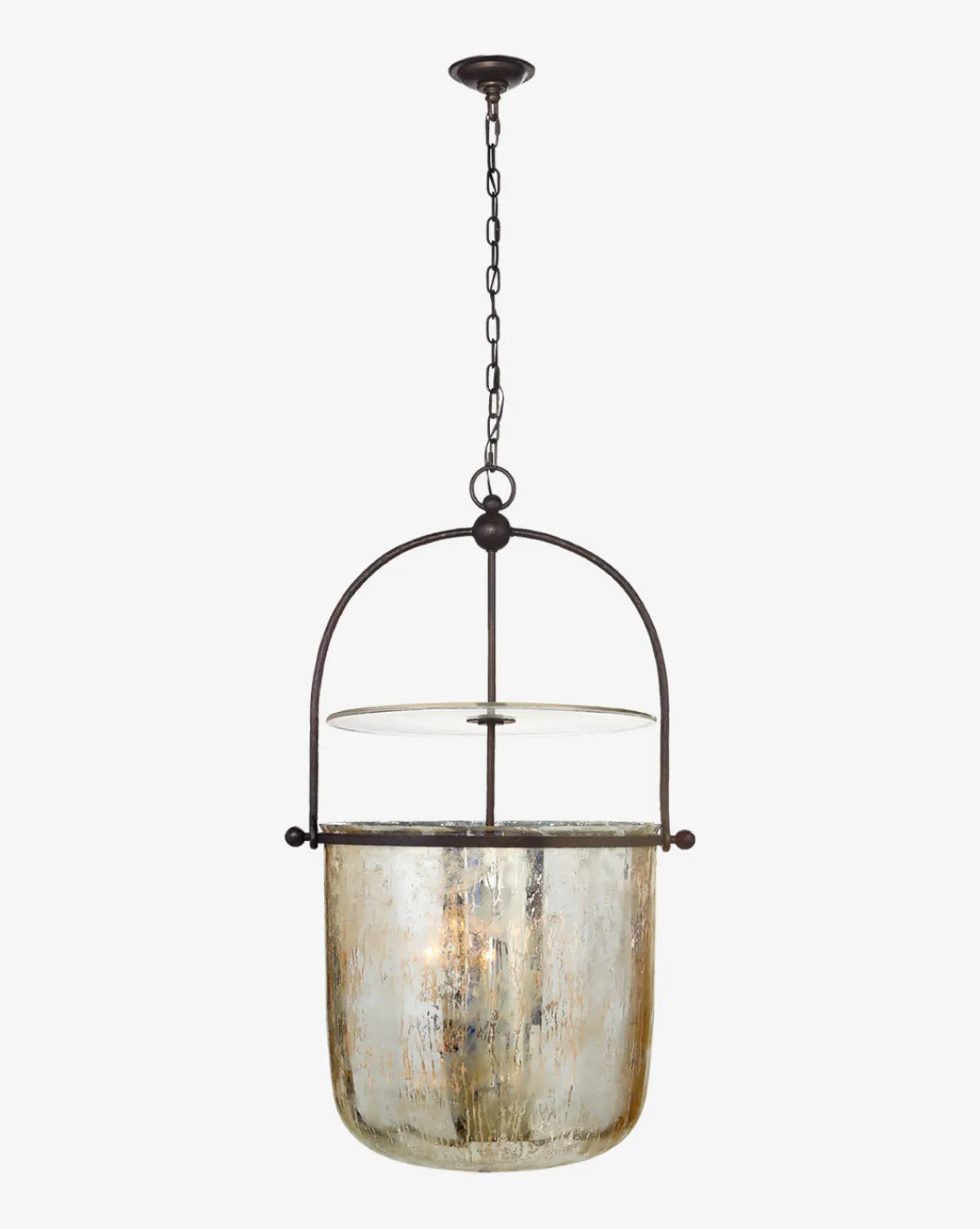 The Lorford Smoke Bell Lantern features the most unique and masterful use of mercury glass we’ve seen. Held by a structured, aged iron case, the glass brilliantly displays it enticing metal sheen when lit.