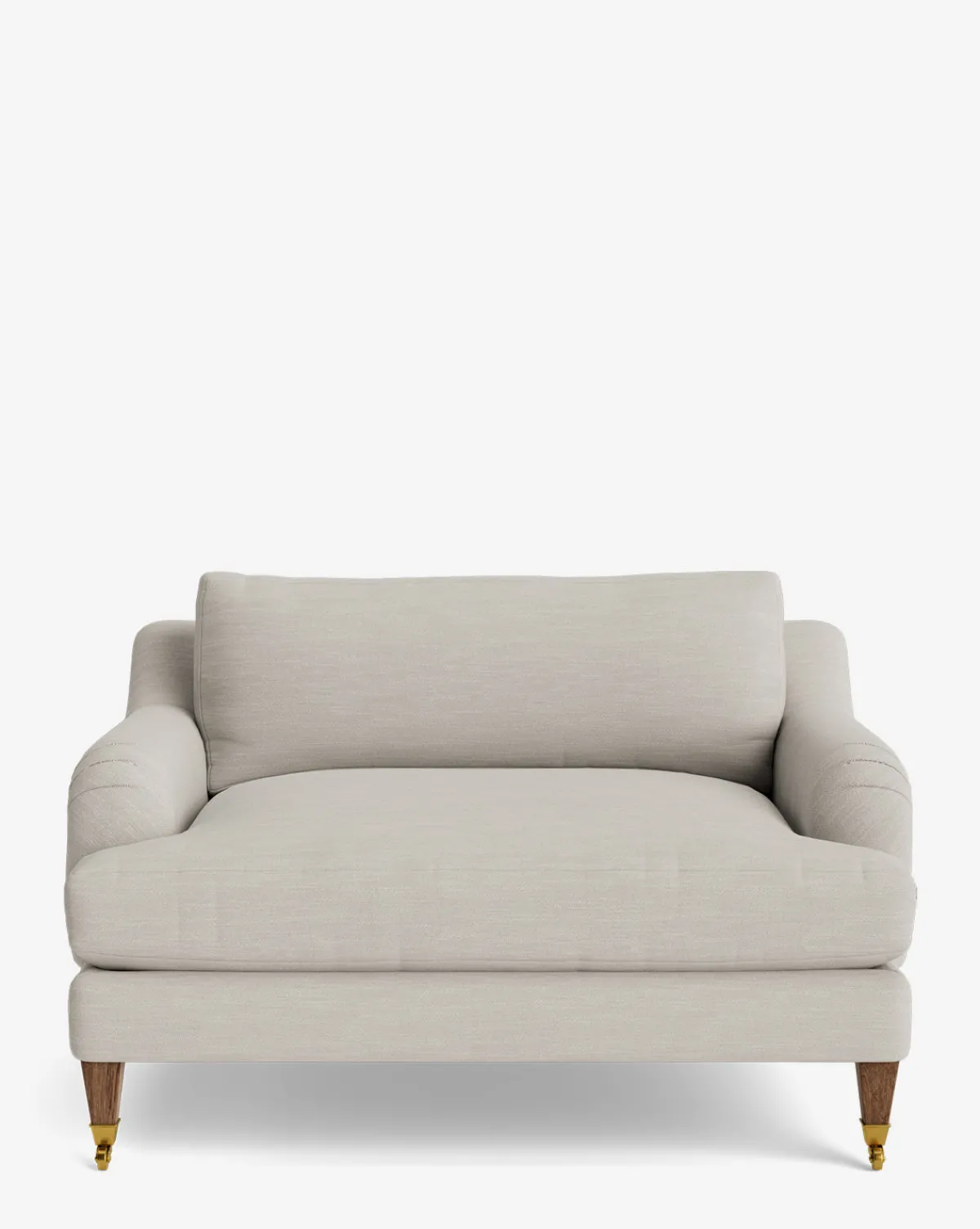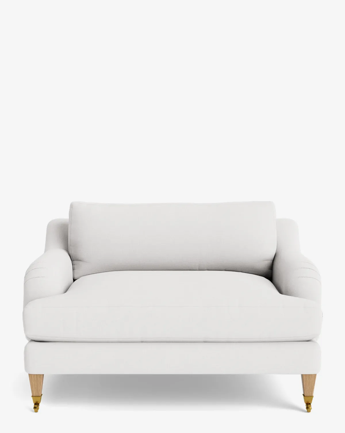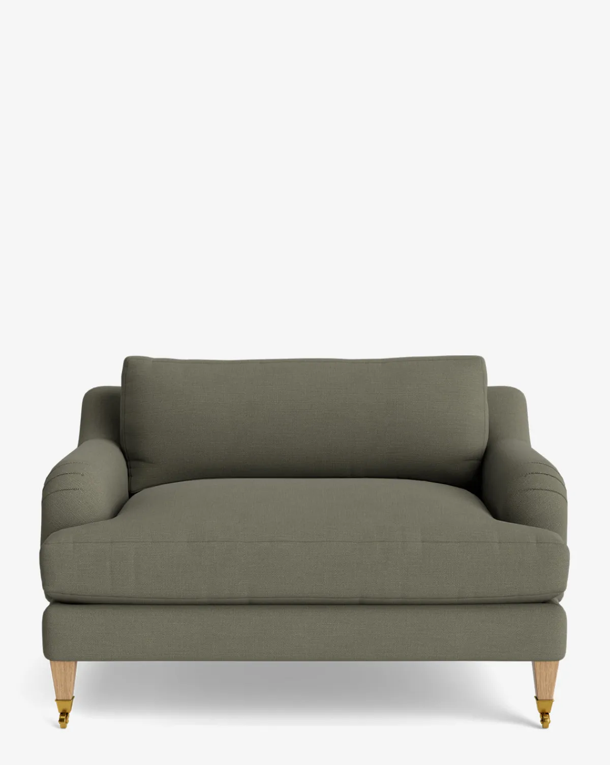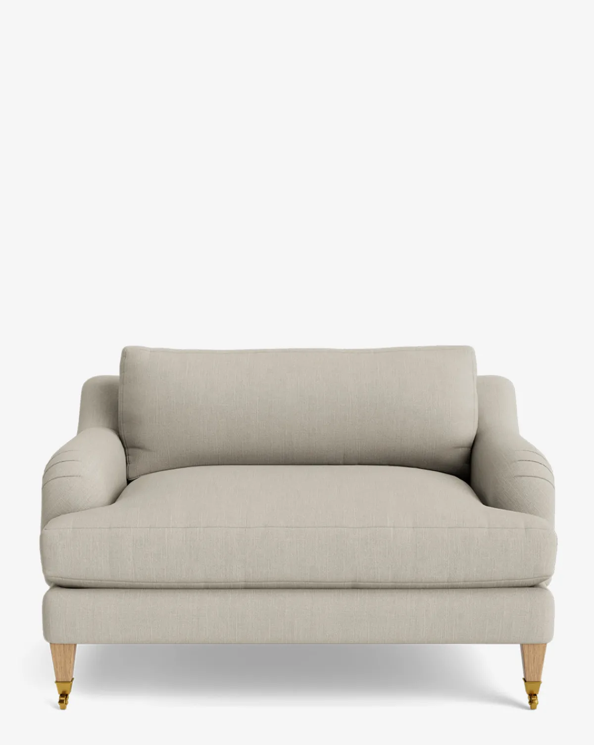 Our Lucille English Roll Arm Chair and a Half is a modern approach to a traditional design. Crafted with luxurious comfort in mind, its classic format features a down wrapped cushion for a perfectly stuffed look and feel. A bench-made alder wood frame adds durability to the design, as four oak wood tapered legs give this chair the ability to move around with ease. Completely customizable in a wide array of fabrics, make the chair your own with either a soft linen, or high performance crypton.