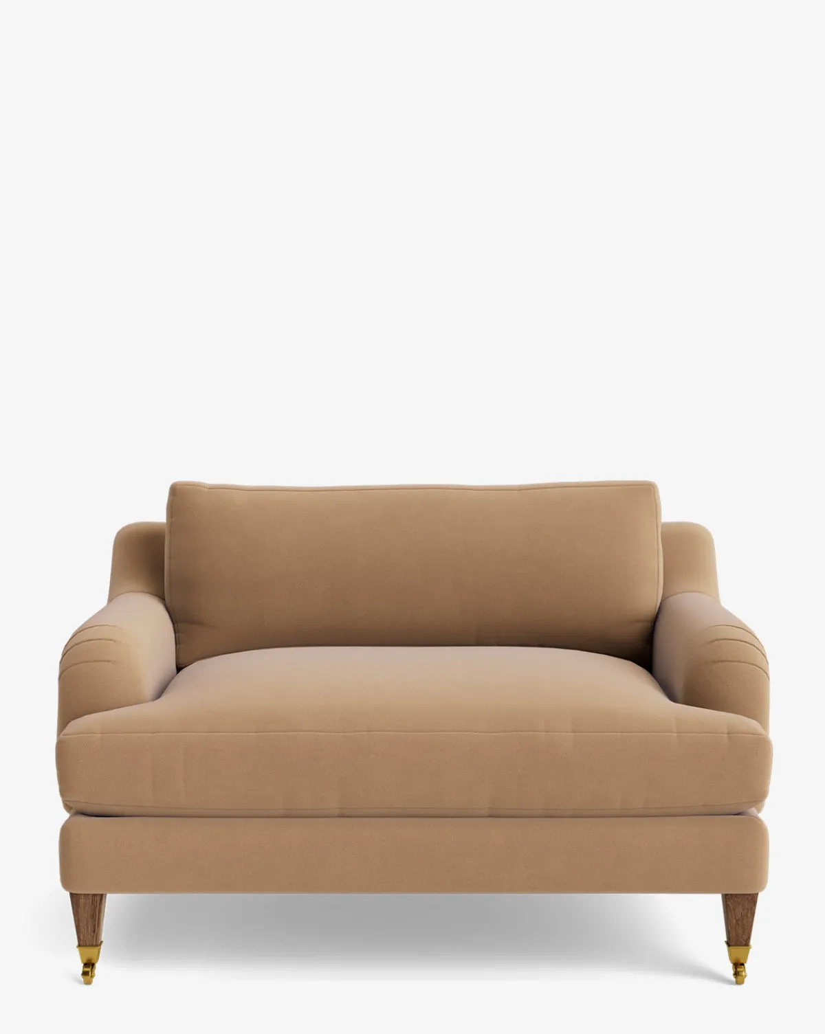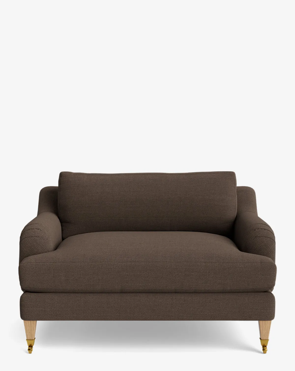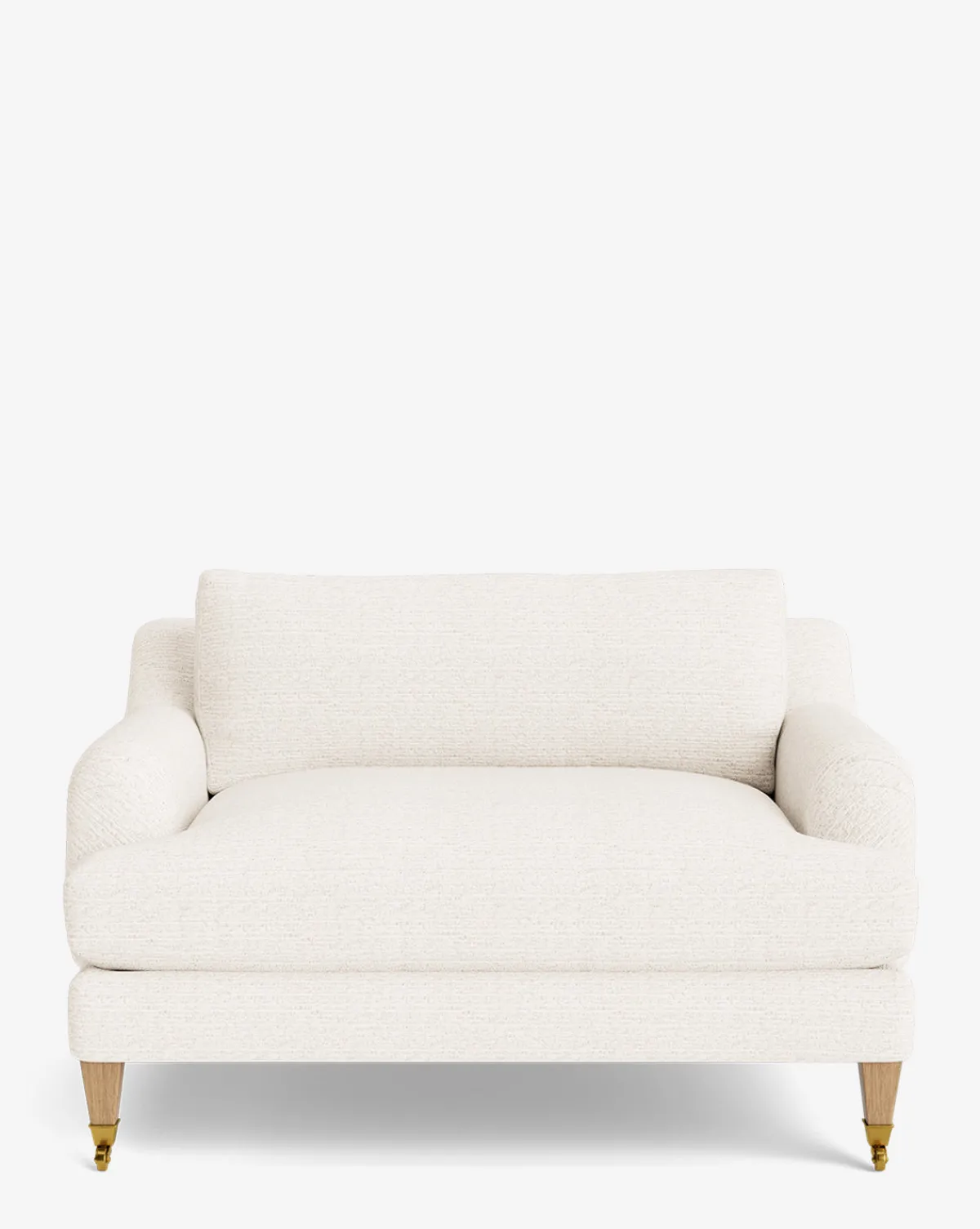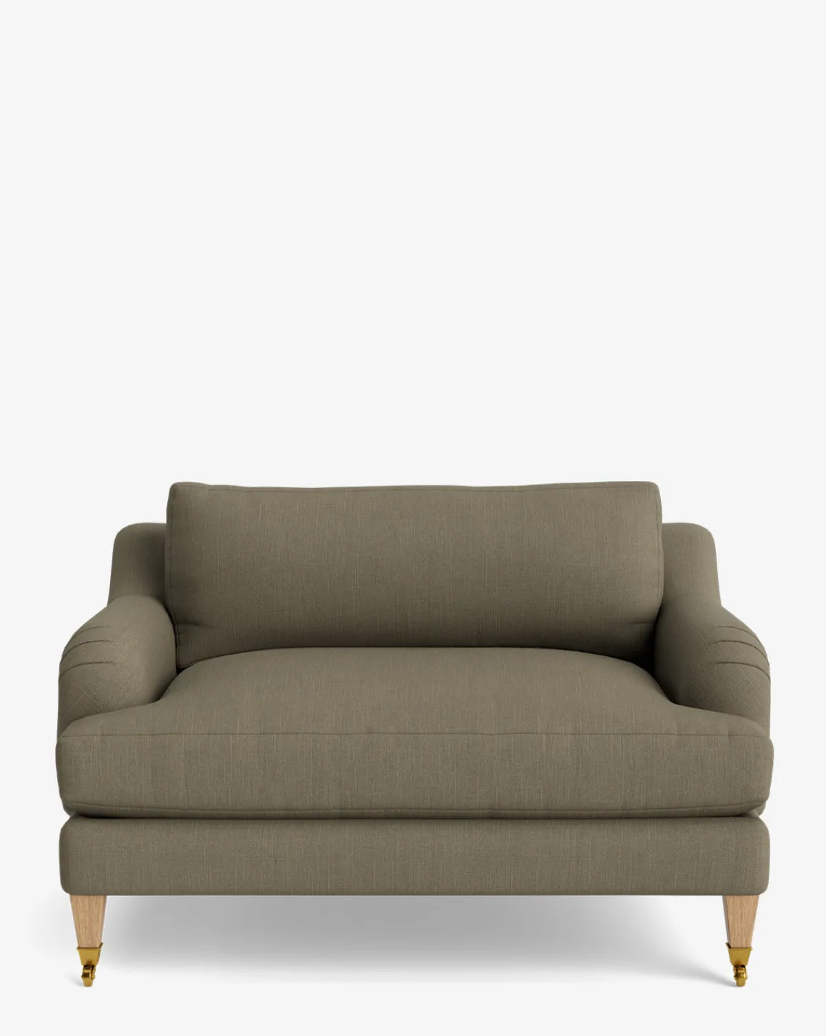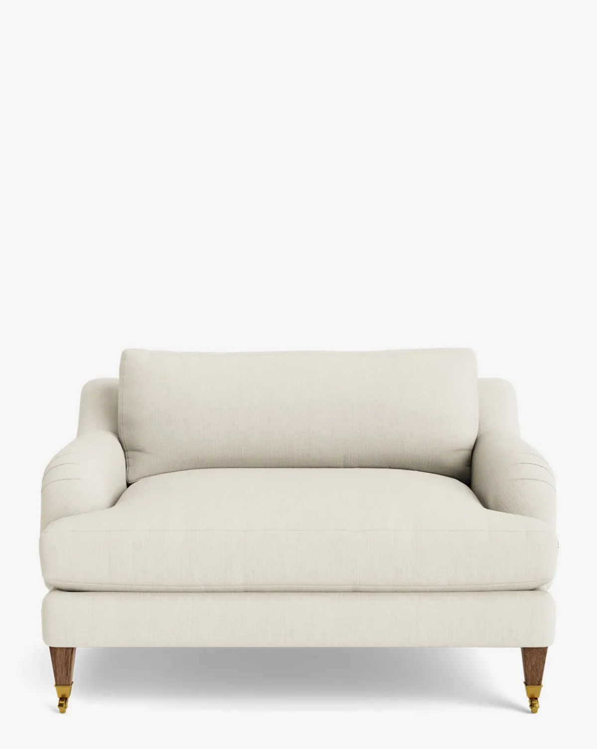 Our Lucille English Roll Arm Chair and a Half is a modern approach to a traditional design. Crafted with luxurious comfort in mind, its classic format features a down wrapped cushion for a perfectly stuffed look and feel. A bench-made alder wood frame adds durability to the design, as four oak wood tapered legs give this chair the ability to move around with ease. Completely customizable in a wide array of fabrics, make the chair your own with either a soft linen, or high performance crypton.