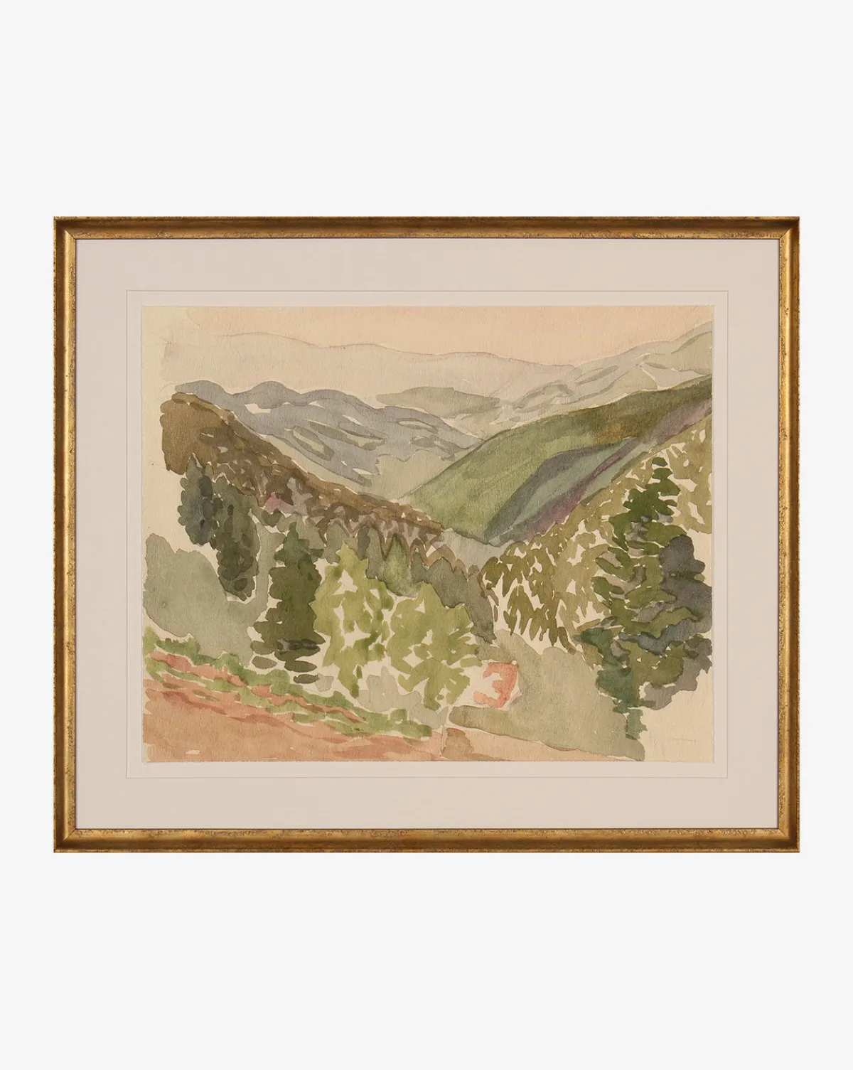 In a calming, earthy palette, Lush Hillside is whimsical and inviting with soft details and full composition. The giclee print is framed with a gold-finished wood and picture framing glass, for a museum-quality treatment.