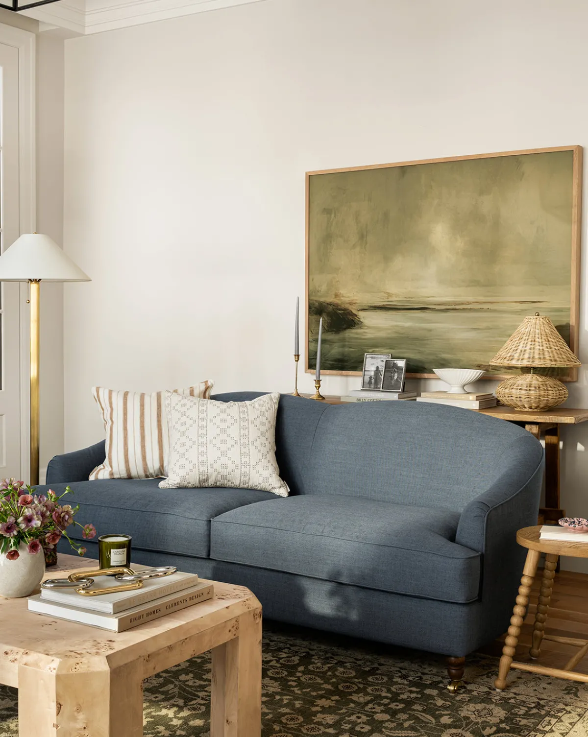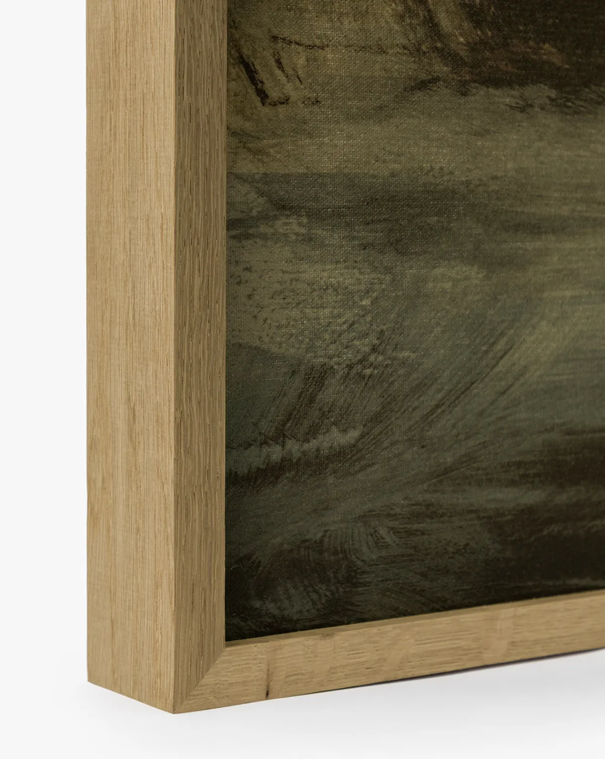 A dramatic coastline comes to life with each brush stroke in Misty Blue Headland. Presented as a giclee print on gallery-wrapped canvas within a white oak frame, the piece brings a gallery quality feel to your home.