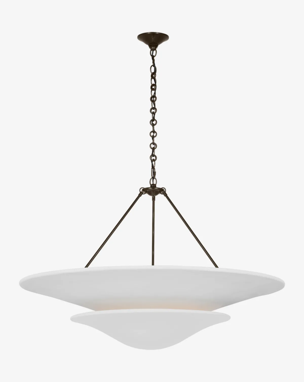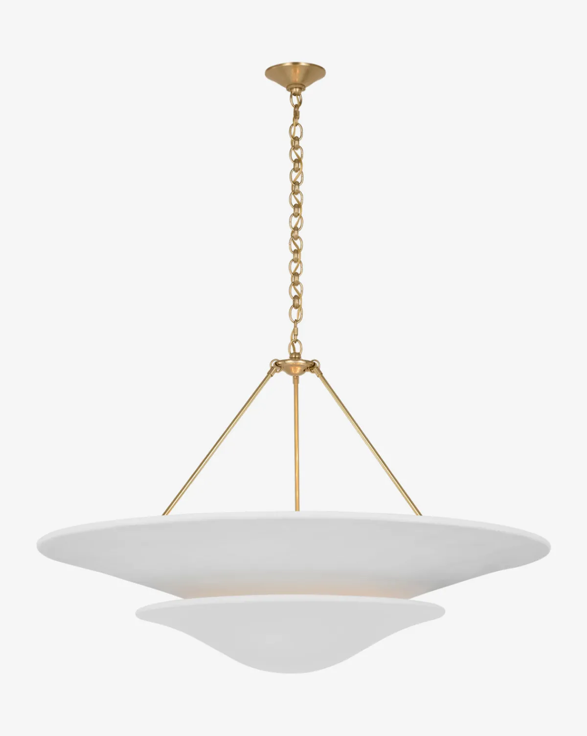 With a bold and contemporary design, the Mollino 40″ Chandelier is crafted from polyresin with a white plaster finish. Its hand-rubbed antique brass chain lends a subtle contrast to the shades, adding beauty to lighting designs throughout the home.