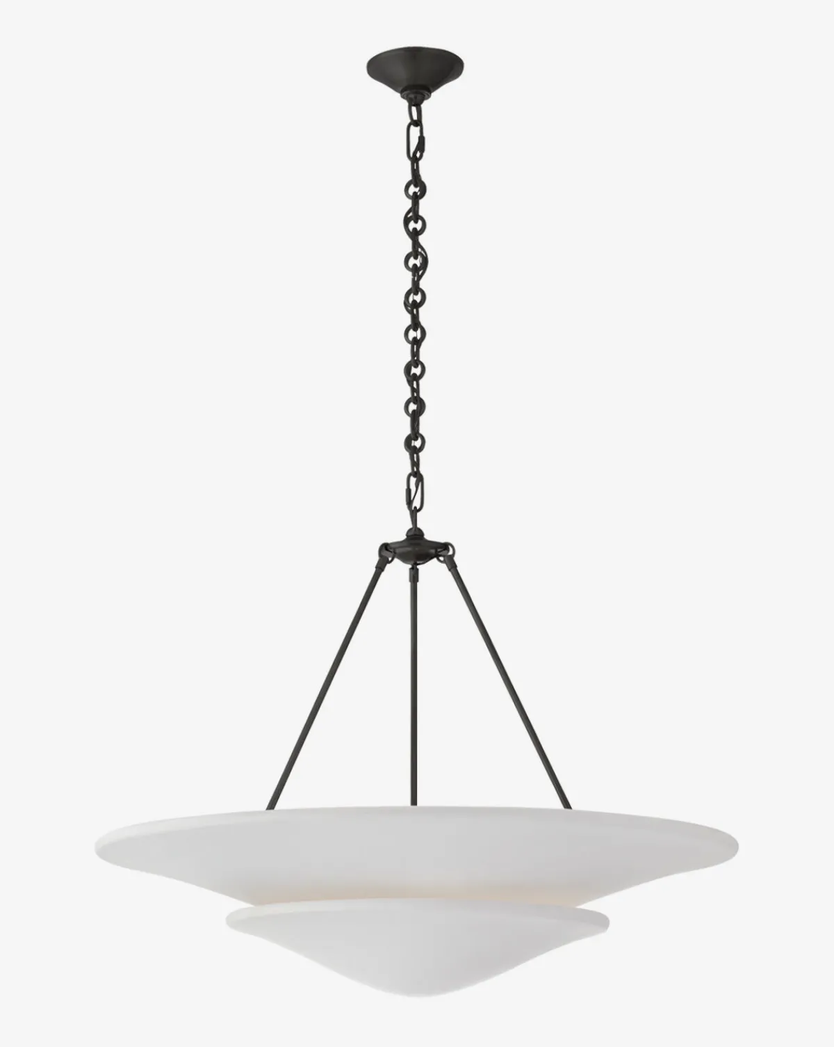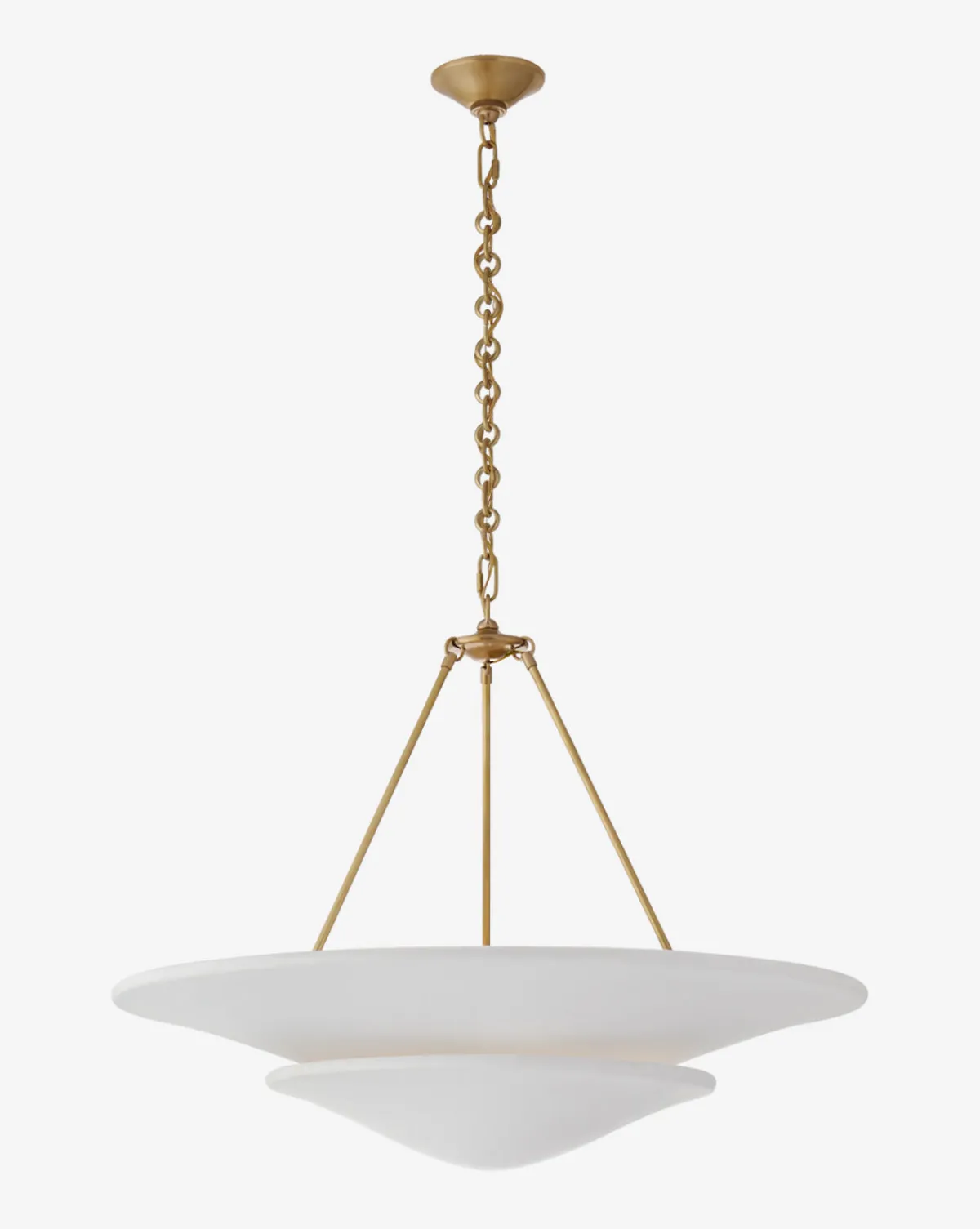 With a bold and contemporary design, the Mollino Chandelier is crafted from polyresin with a white plaster finish. Its hand-rubbed antique brass chain lends a subtle contrast to the shades, adding beauty to lighting designs throughout the home.
