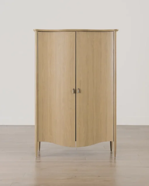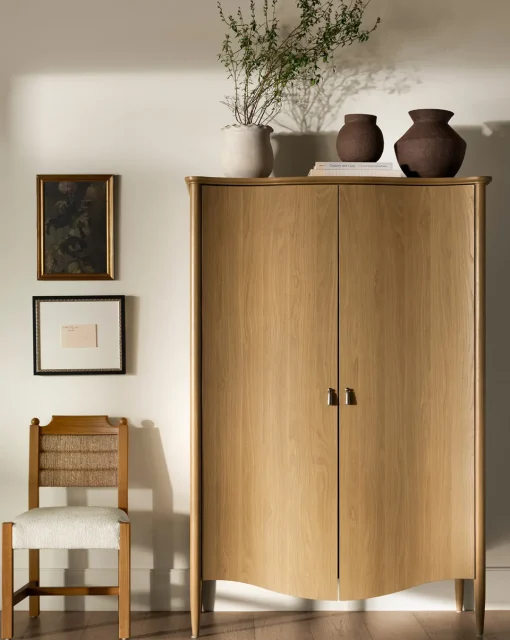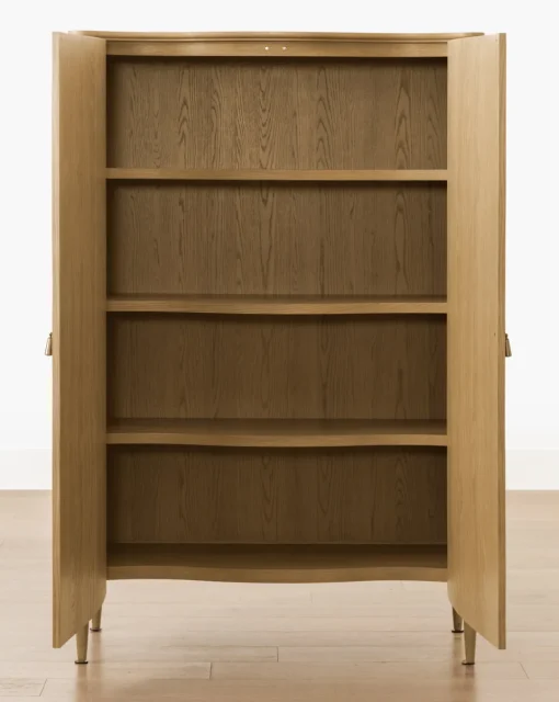Made from Heritage Oak with details that speak to its craftsmanship, our Moorland Cabinet is stately and intriguing. With a curved form and solid brass pulls, our wood cabinet is timeless with a natural feel. Featuring three adjustable interior shelves and soft closed doors, it is a functional and beautiful addition to your living room or bedroom styling.