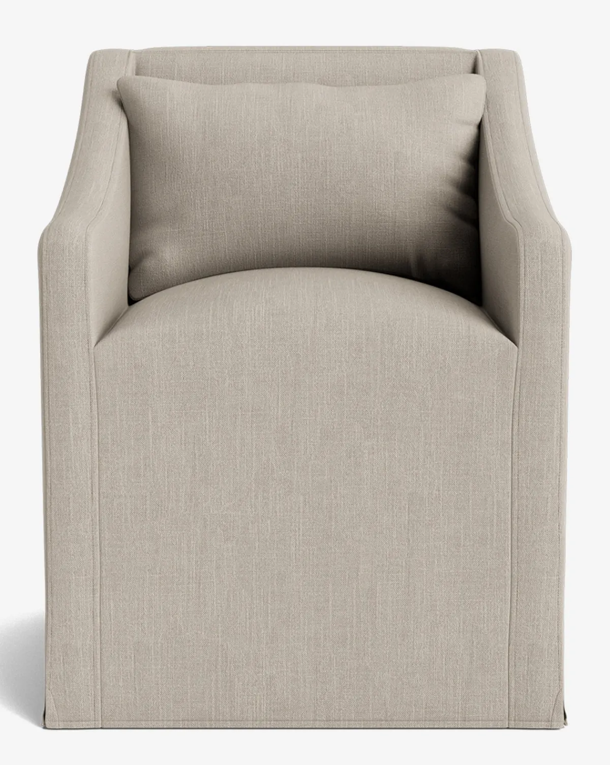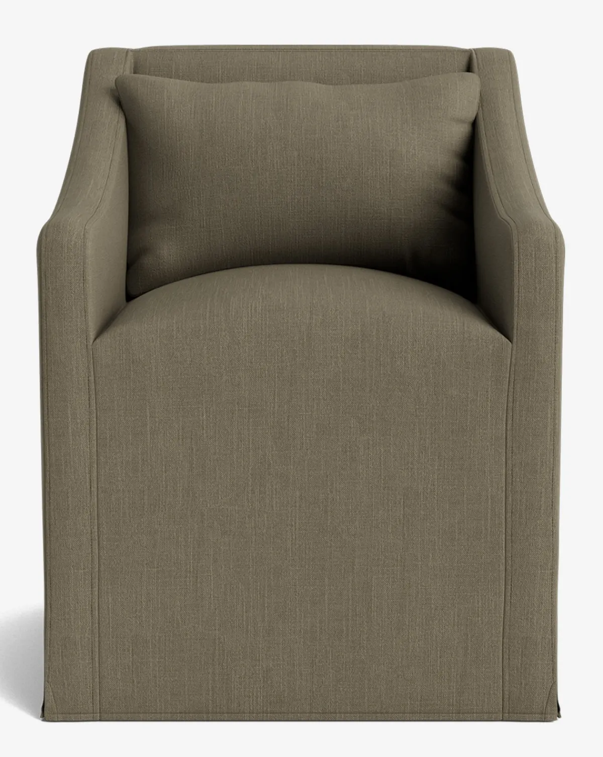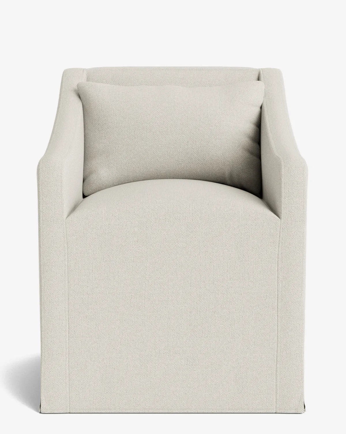 Classic and subtly dramatic, the Olivier Slipcover Dining Arm Chair is upholstered in your choice of beautiful high-quality fabric. Its back fluidly extends into its sloped armrests, creating an elongated look and elegant feel. With a cushion filled with a feather and down blend, this dining chair provides both comfort and elevated style.