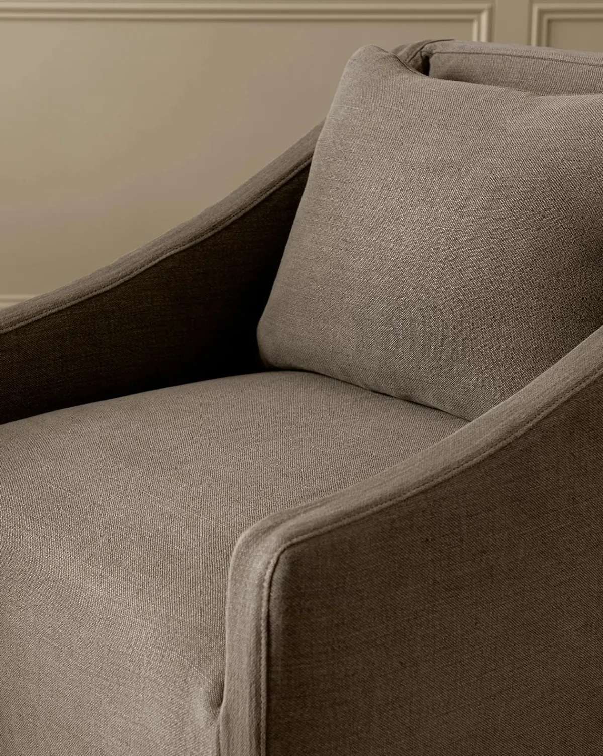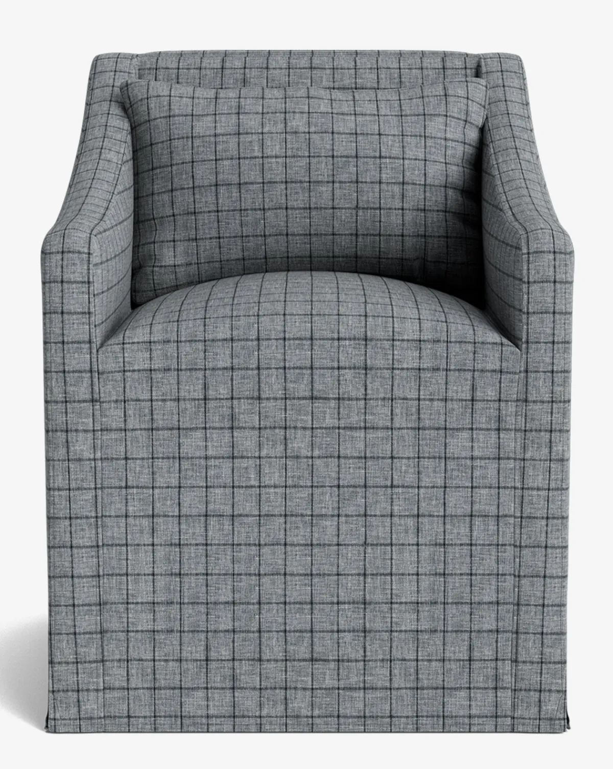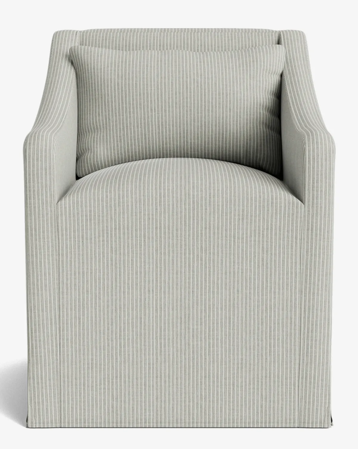 Classic and subtly dramatic, the Olivier Slipcover Dining Arm Chair is upholstered in your choice of beautiful high-quality fabric. Its back fluidly extends into its sloped armrests, creating an elongated look and elegant feel. With a cushion filled with a feather and down blend, this dining chair provides both comfort and elevated style.