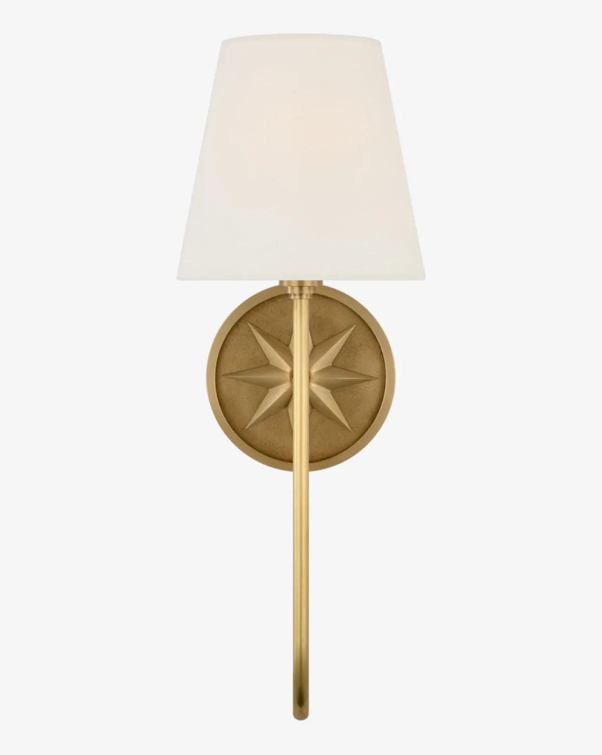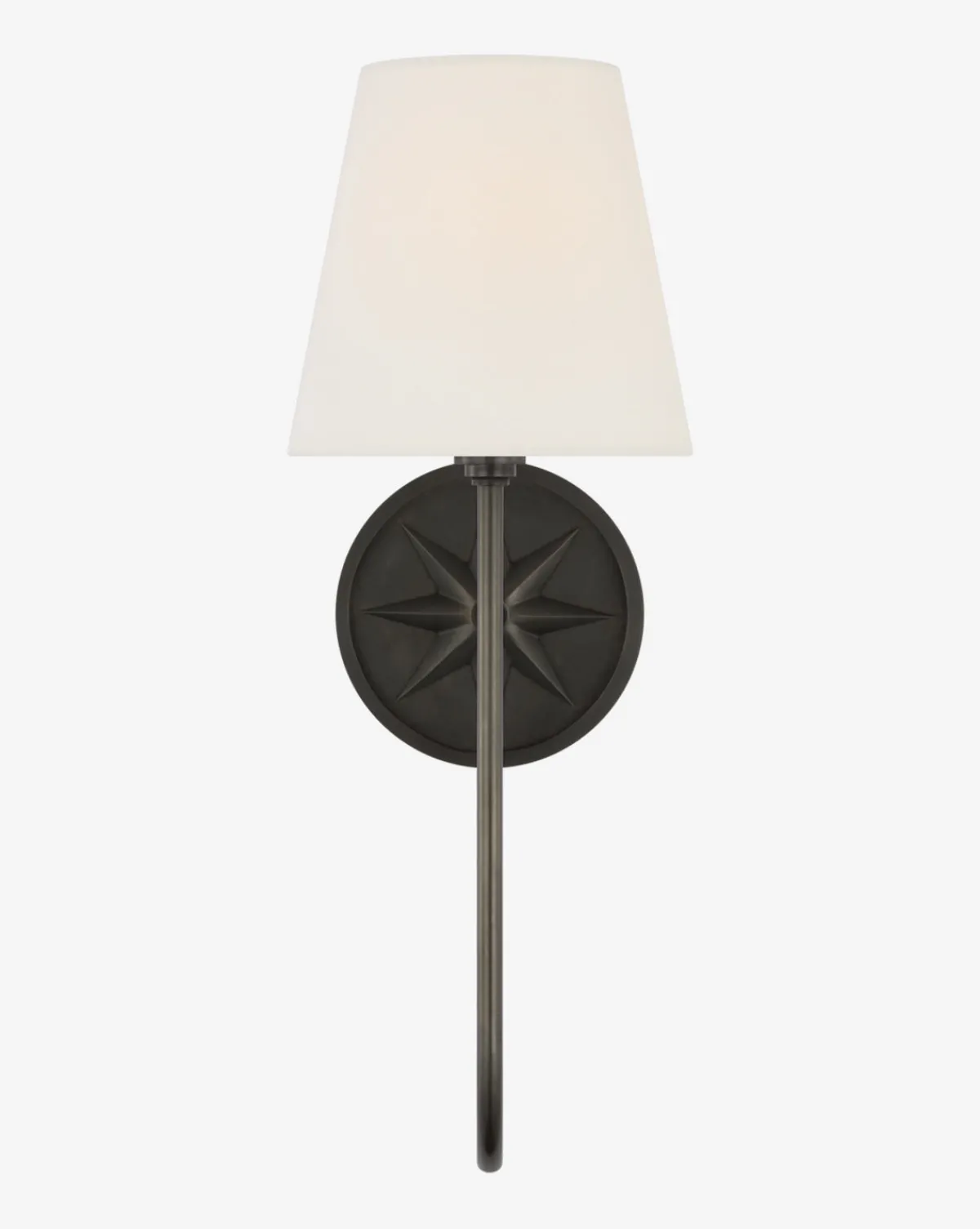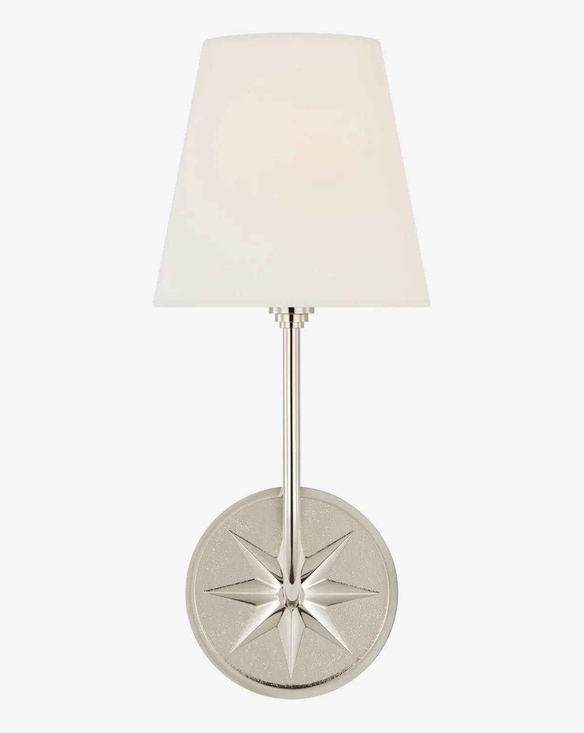 In your choice of finish, the Polaris Sconce is simple yet elevated. Its swooped arm brings an inviting feel to your space and complements the tapered white linen shade.