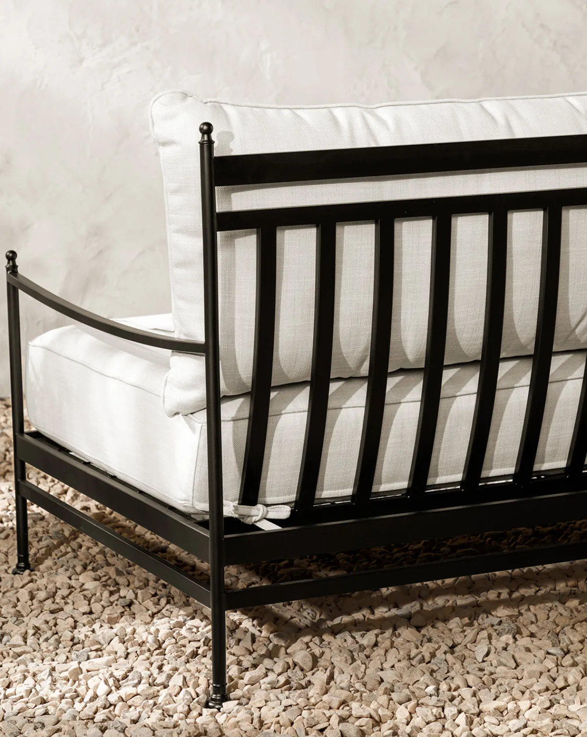 Exuding a sense of refined luxury, we designed our Pomeroy Outdoor Sofa with style, materiality, and craftsmanship in mind. The intricately detailed powder-coated steel frame has a curved slatted back with sloped arms, a decorative yet sturdy leg base, and ball finials on the back. Upholstered in our Pasadena White indoor/outdoor performance fabric, it features knife edge cushions, a double button tufted back, and a box cushion seat with piping details. Offering timeless style, comfort, and durability, it elevates your indoor or outdoor lounging with an enduring elegance.