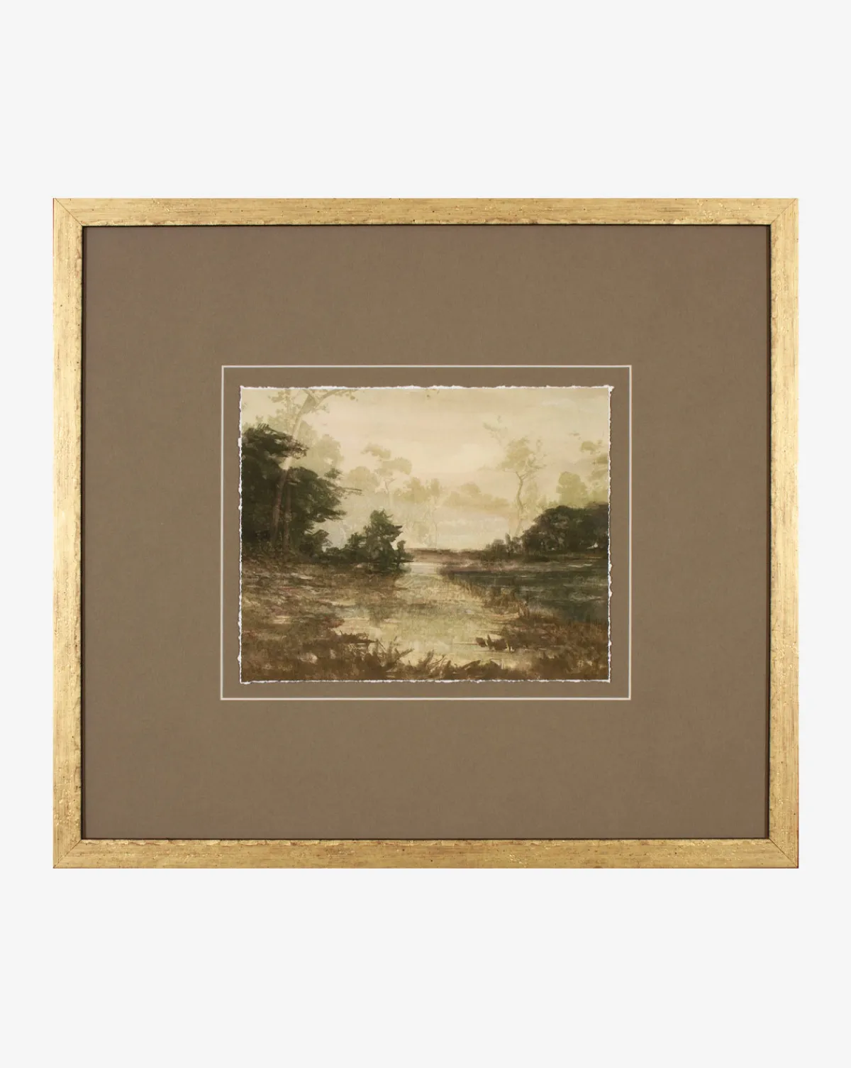 A serene landscape, Pond at Sunset uses tone and texture to tell its story. A wood frame allows for versatile styling in your home, elevating wall treatments or dresser vignettes.