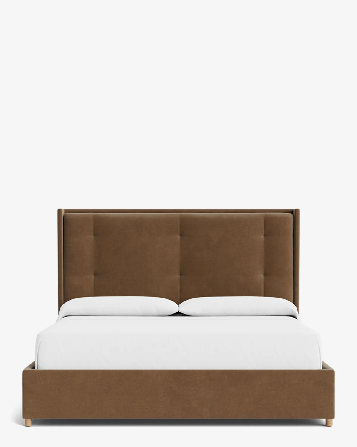 With a bench-made frame, the Ria Upholstered Bed is customizable in a selection of our favorite high-quality fabrics. The tufted headboard brings both simplicity and elegance to bedroom designs in each of the colorways. With a low frame and subtle wood block feet, this upholstered bed elevates your bedroom style with its detail and refinement.
