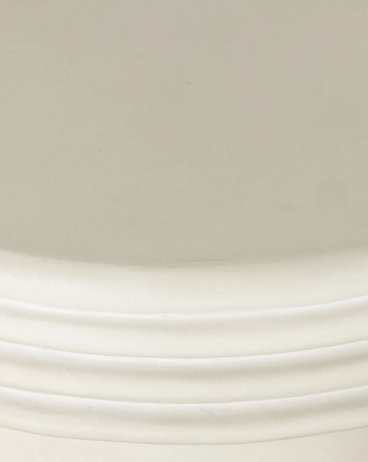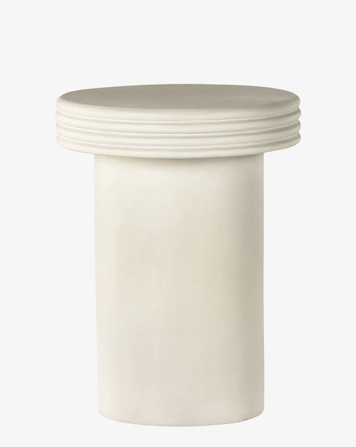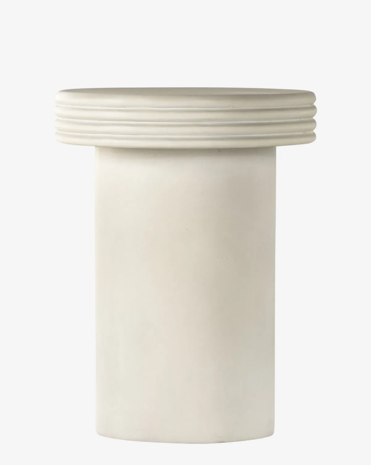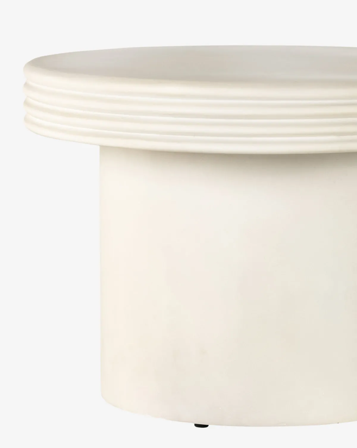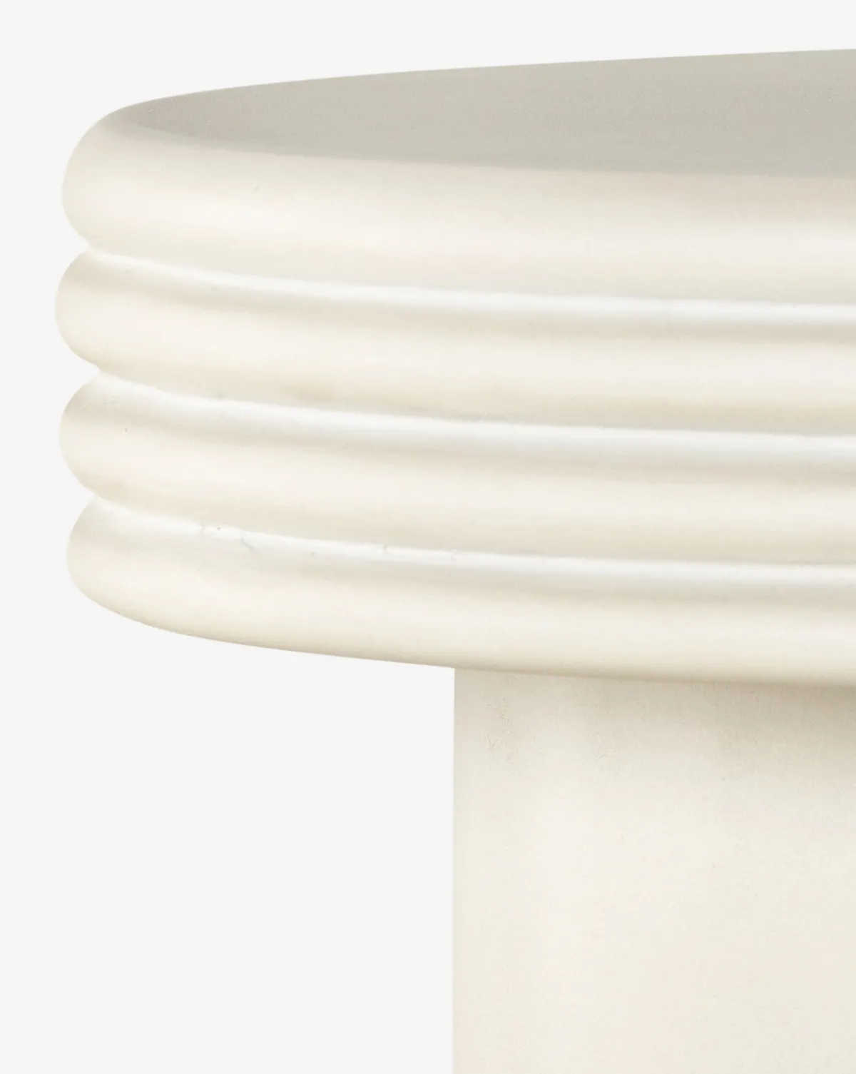 Sculptural and dramatic, the Riah End Table brings its simple structure and bold features to your styling, whether indoors or outdoors. Made from concrete in a white finish, the ribbed edging on the tabletop adds subtle dimension to the cylindrical base.