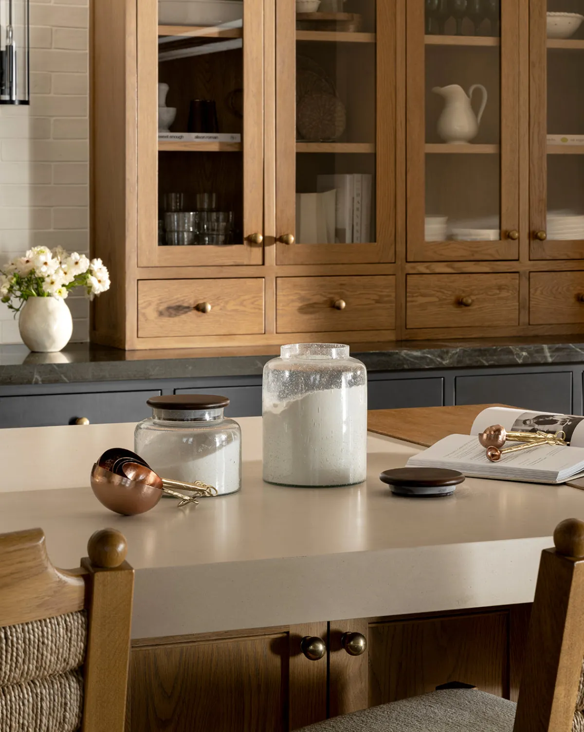 With a simple lid made from dark wood, the Seeded Glass Canister brings a refined element to your kitchen spaces. Styled on open shelving or a countertop, the clear seeded glass canisters allow for versatility of use.