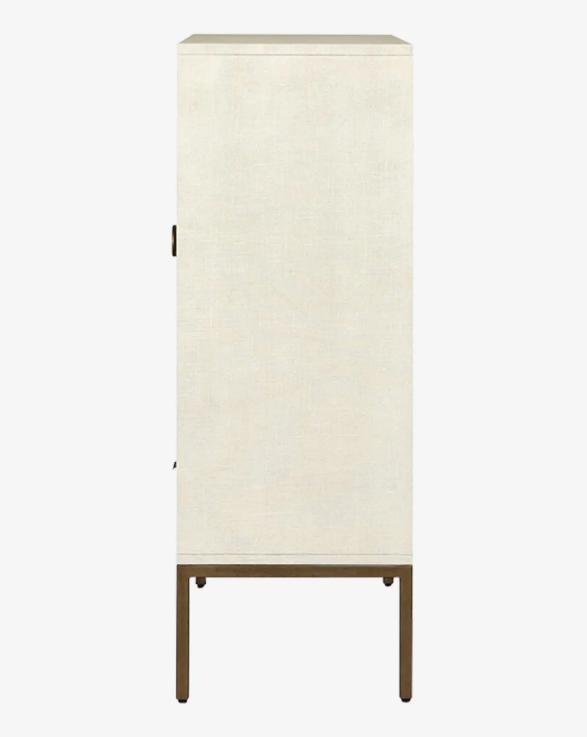 Refined beauty meets convenient utility. The Thaddeus Cabinet combines modern and classic design elements, pairing ivory painted linen with an airy mahogany base. Antique brass finished accents add a touch of elegant charm, while two spacious lower drawers provide extra storage for enhanced functionality.