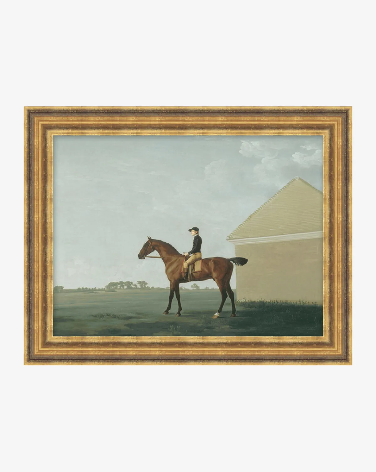 In the style of realism, The Little Jockey depicts a young boy atop his horse looking thoughtfully into the distance. The perspective of this piece creates an open feel that allows its cool-toned field to seemingly expand beyond the frame and is given an airy feel with its vast open sky. Embracing the felt experience of youth while likewise highlighting the passing of time towards the future, this piece adds a timeless touch to children’s rooms.