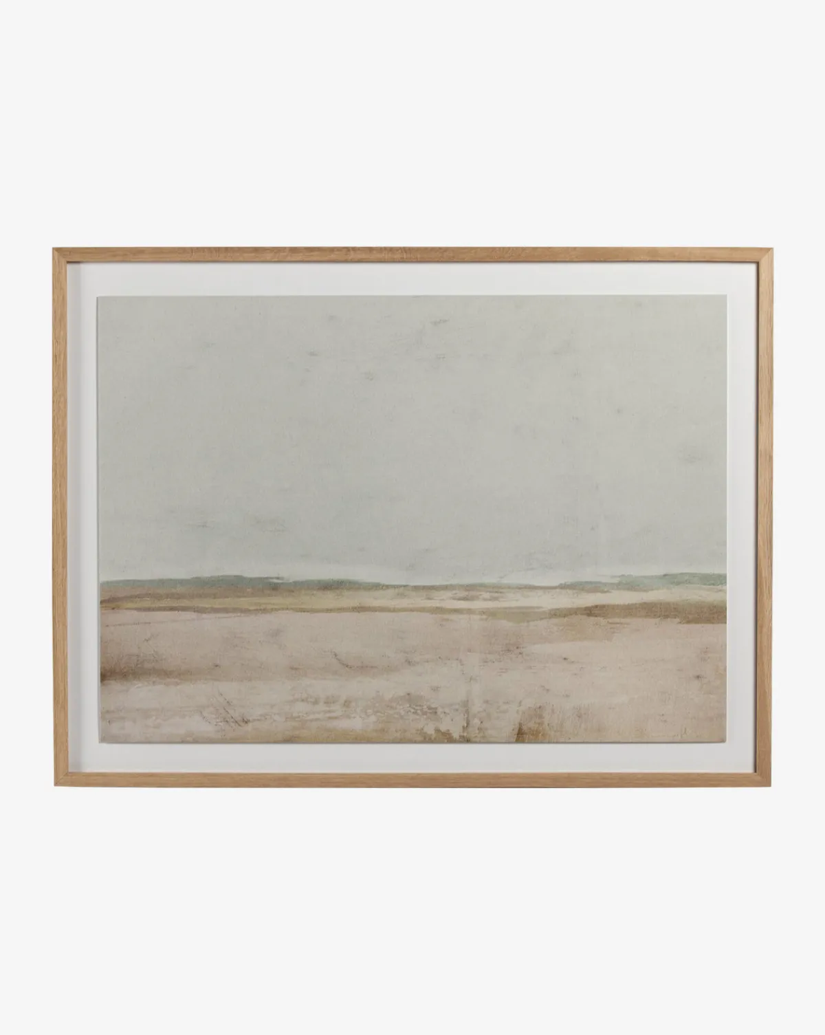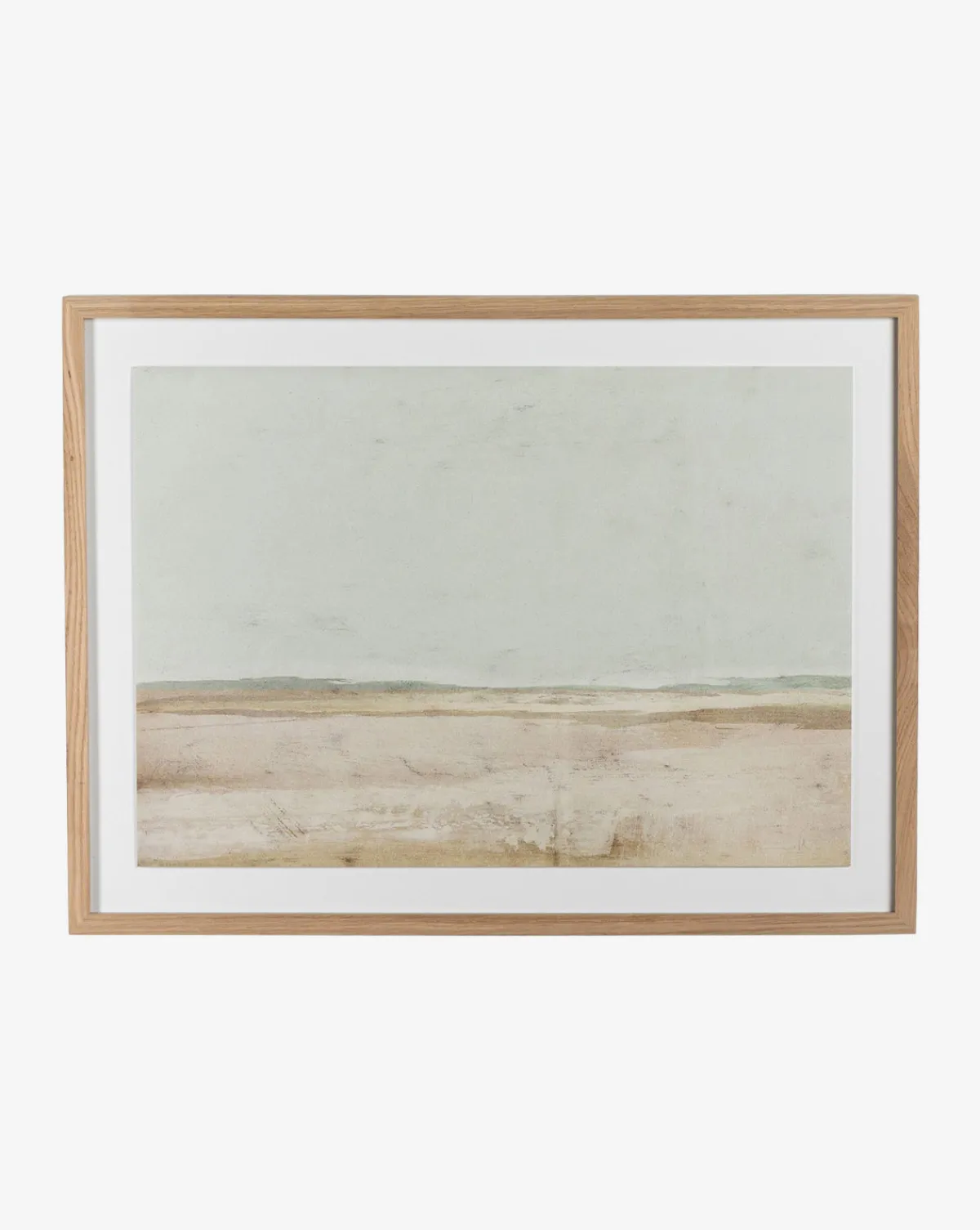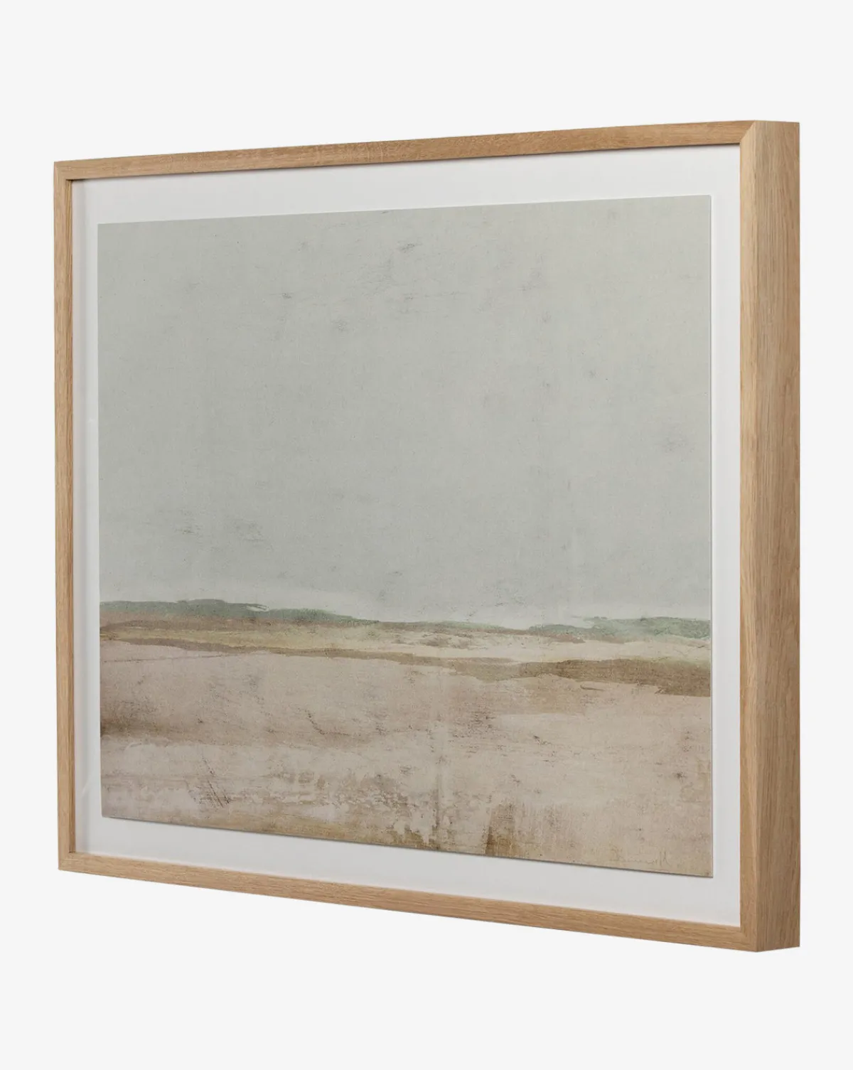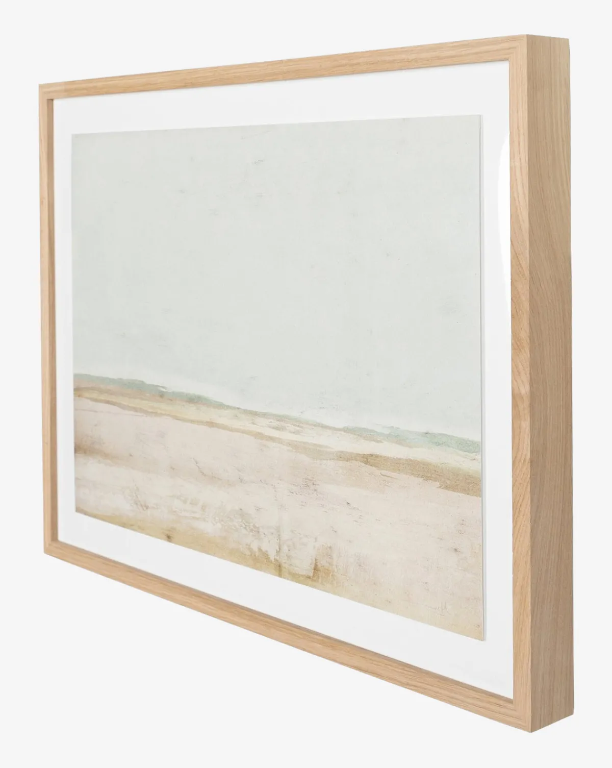 A simple yet impactful beach scene divides the composition of The Old Town. Its tonal palette and washes of color create a dimensional piece that revels in perspective. Framed in vertical grain white oak, Restful Shoreline has a museum-quality feel.