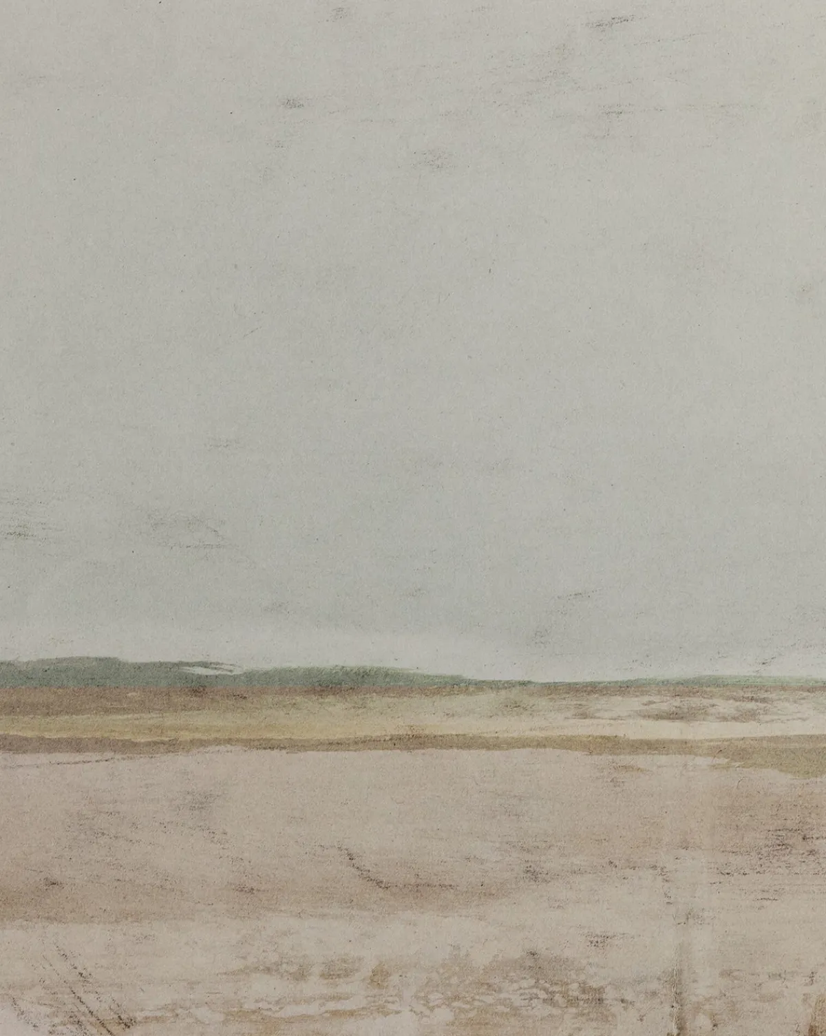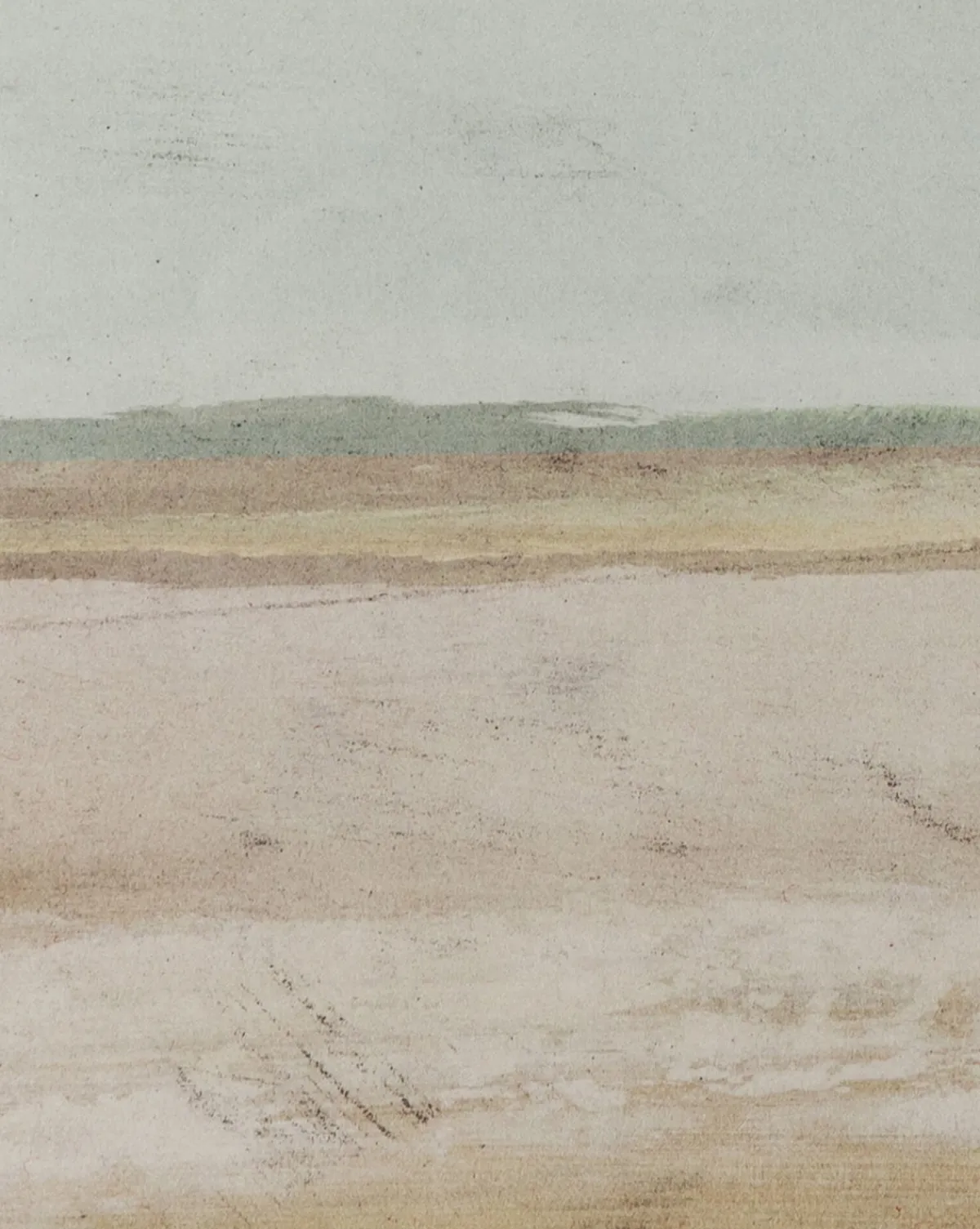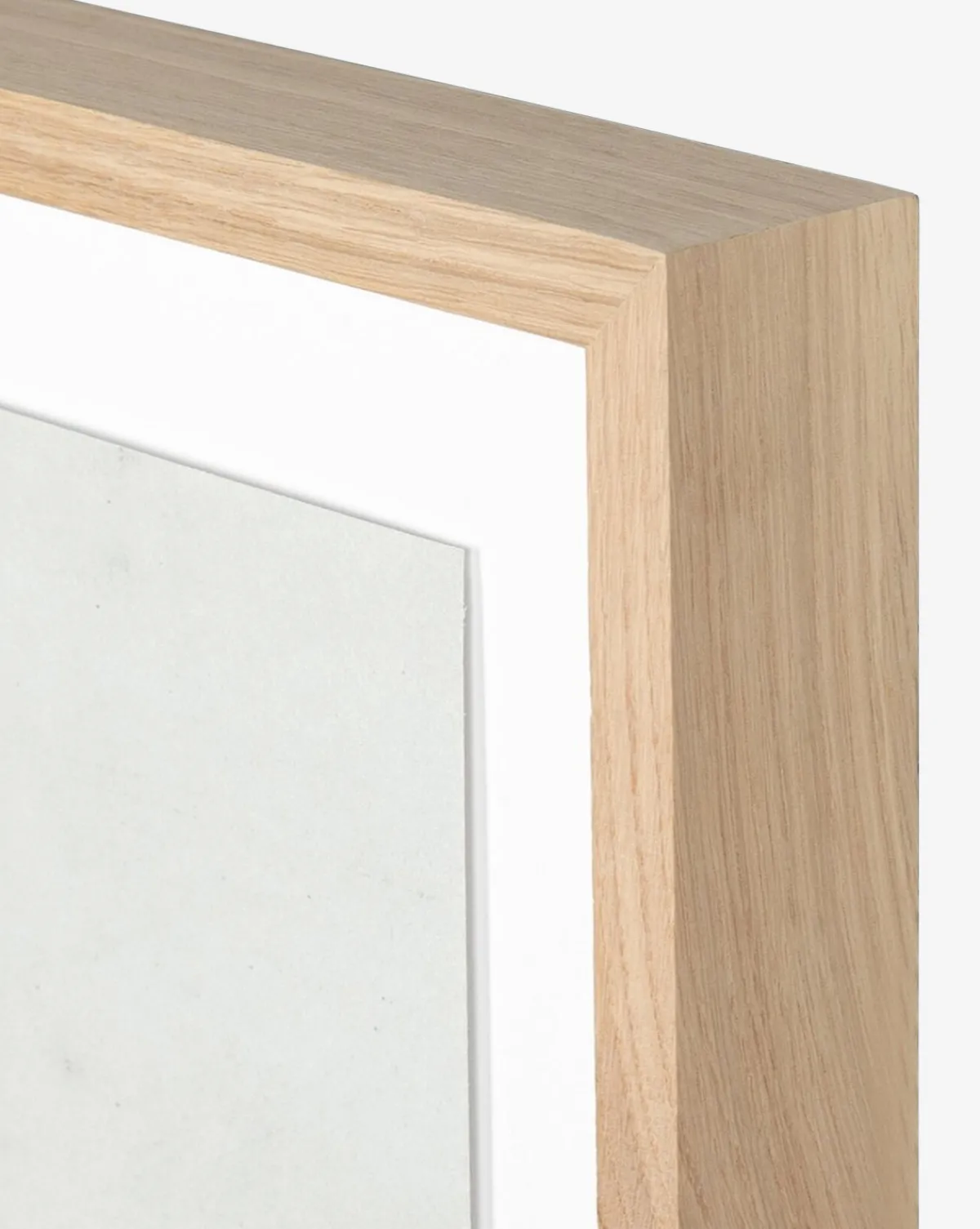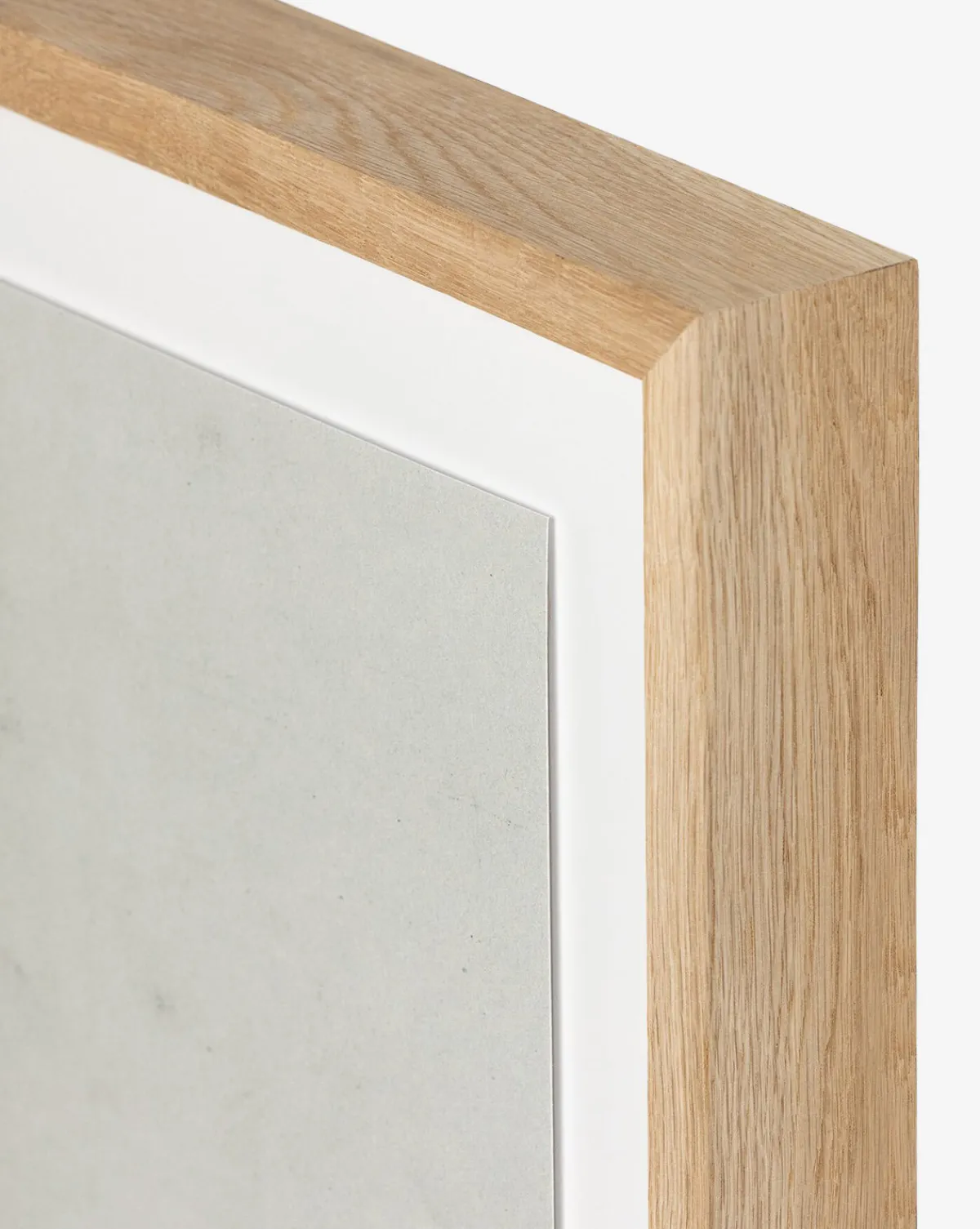 A simple yet impactful beach scene divides the composition of The Old Town. Its tonal palette and washes of color create a dimensional piece that revels in perspective. Framed in vertical grain white oak, Restful Shoreline has a museum-quality feel.