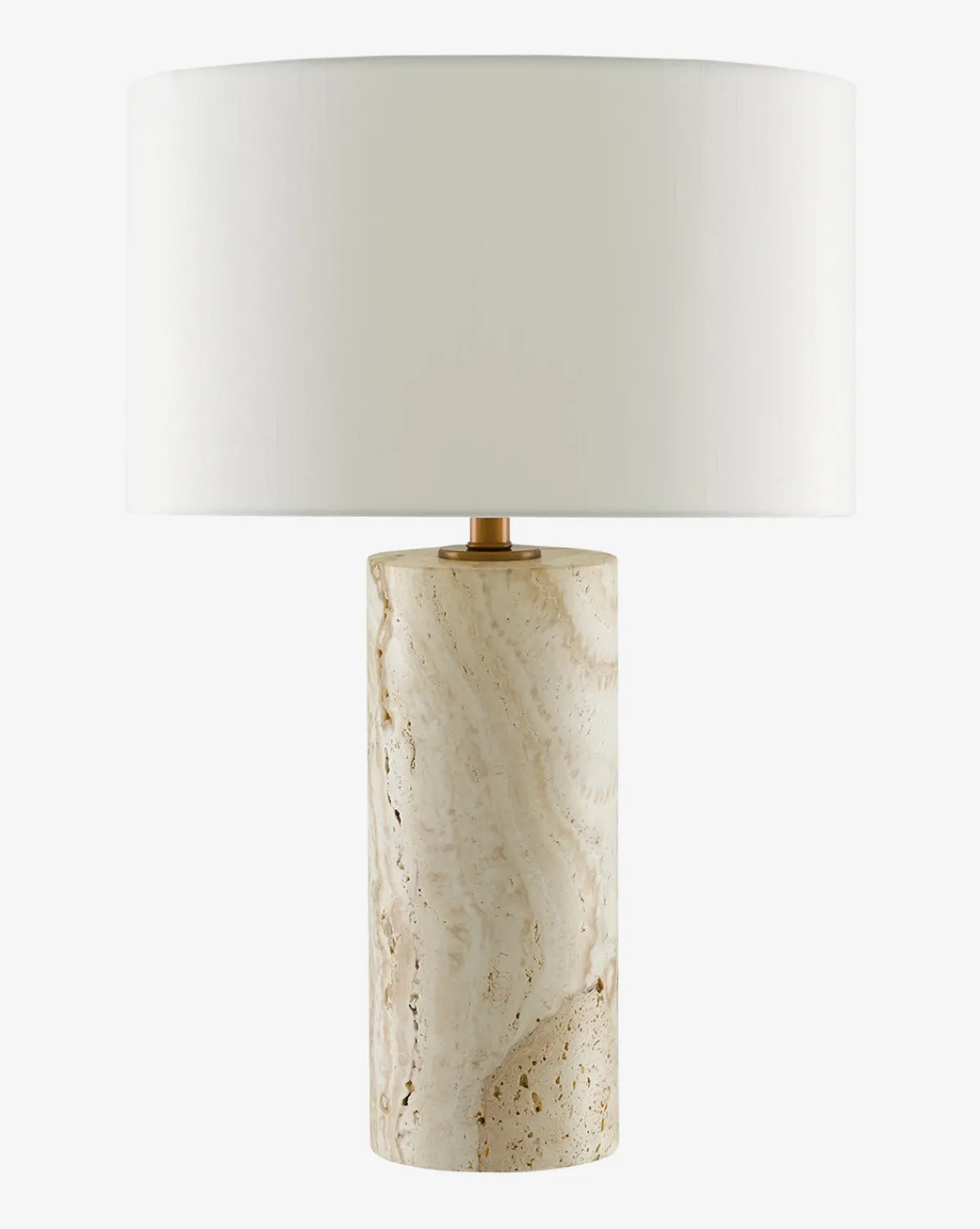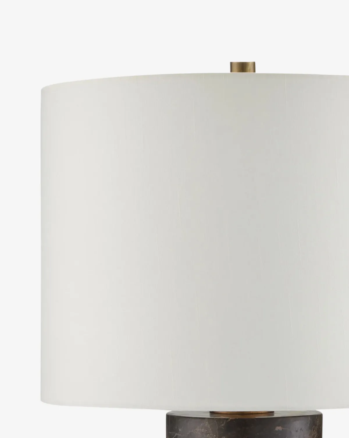 Featuring a streamlined silhouette and bold marble column base, the Vespera Table lamp brings a refined yet contemporary touch to your home styling. Antique brass accents offer subtle sophistication, while the off-white shantung shade provides a soft, elegant illumination.