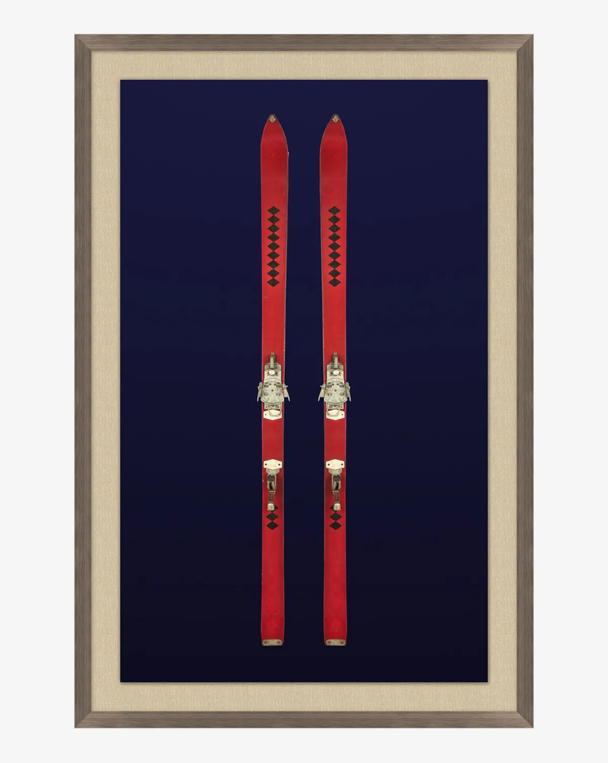 Intimately detailed and featuring bold contrast in hues, Antique Navy Skis II is a masterfully shot still life photograph. A giclee print on matte paper, the work is straight cut and floated on a mat. A dark walnut woodgrain frame complements the photograph and brings gallery-quality materials to your decor.
