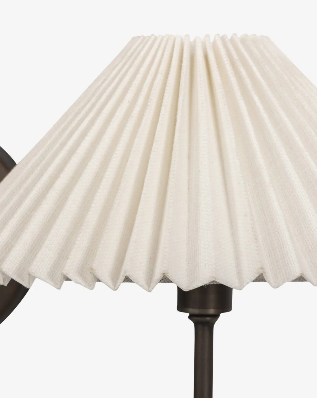 French-inspired, the Ashby Single Sconce brings a classic warmth and traditional charm to your home lighting. A curved, light oil-rubbed bronze arm extends from an iron backplate, creating an elegant silhouette that pairs beautifully with the cream-toned pleated linen shades. It brings a refined sense of coziness wherever it is styled.