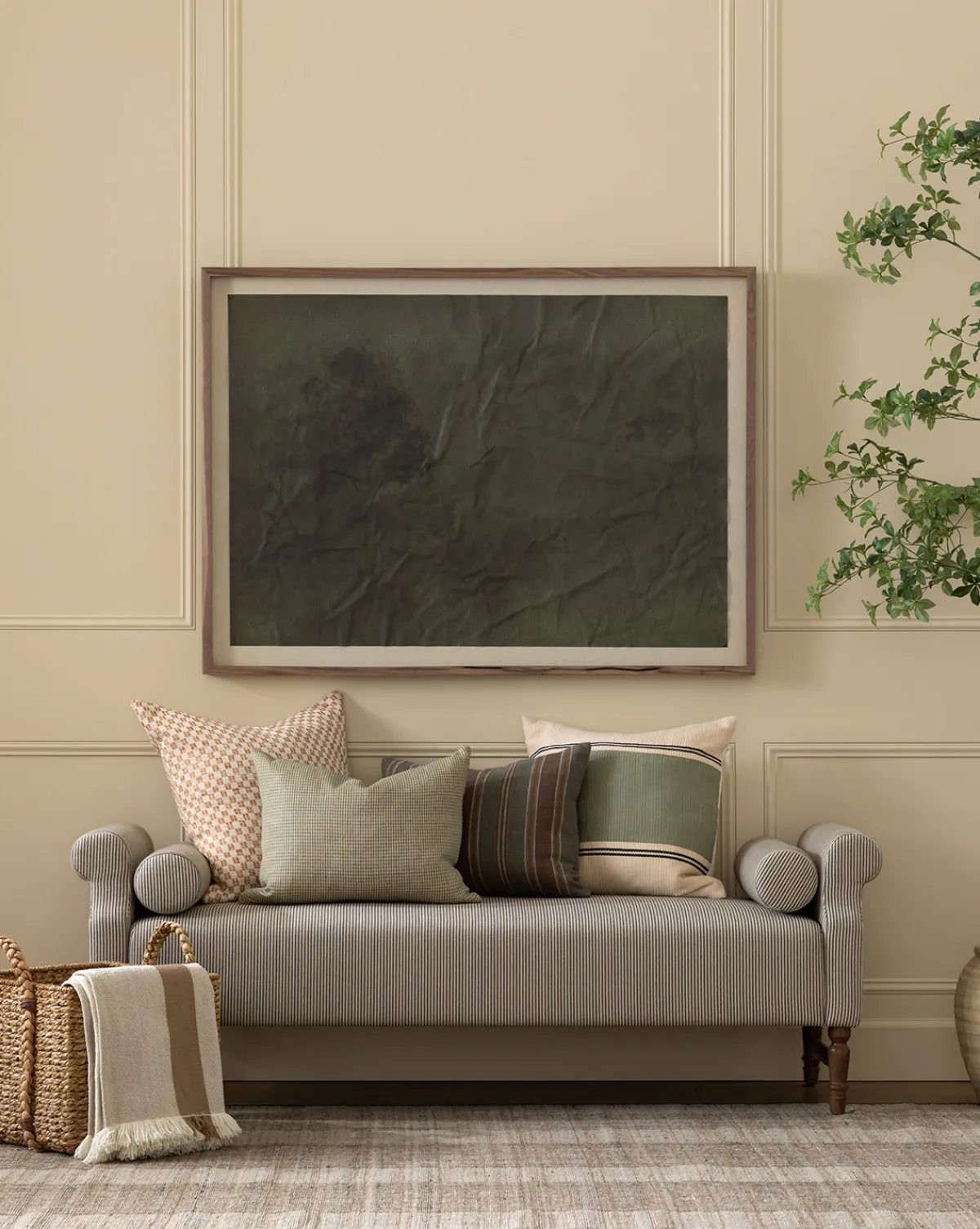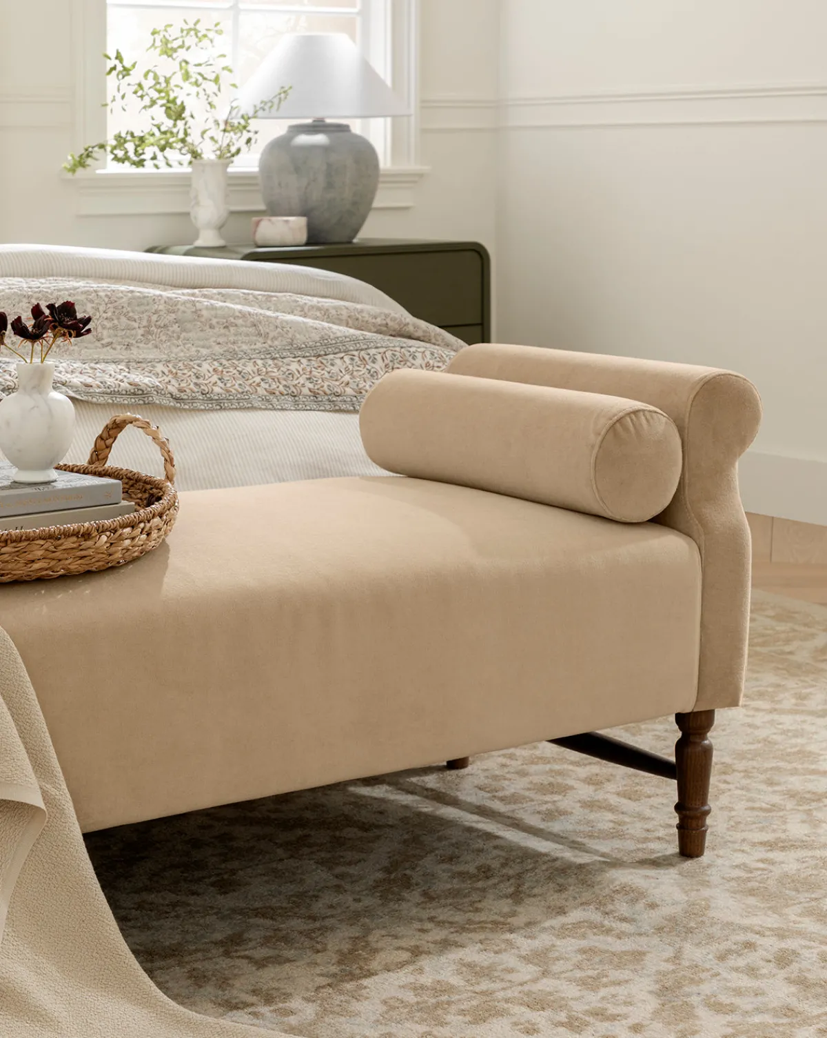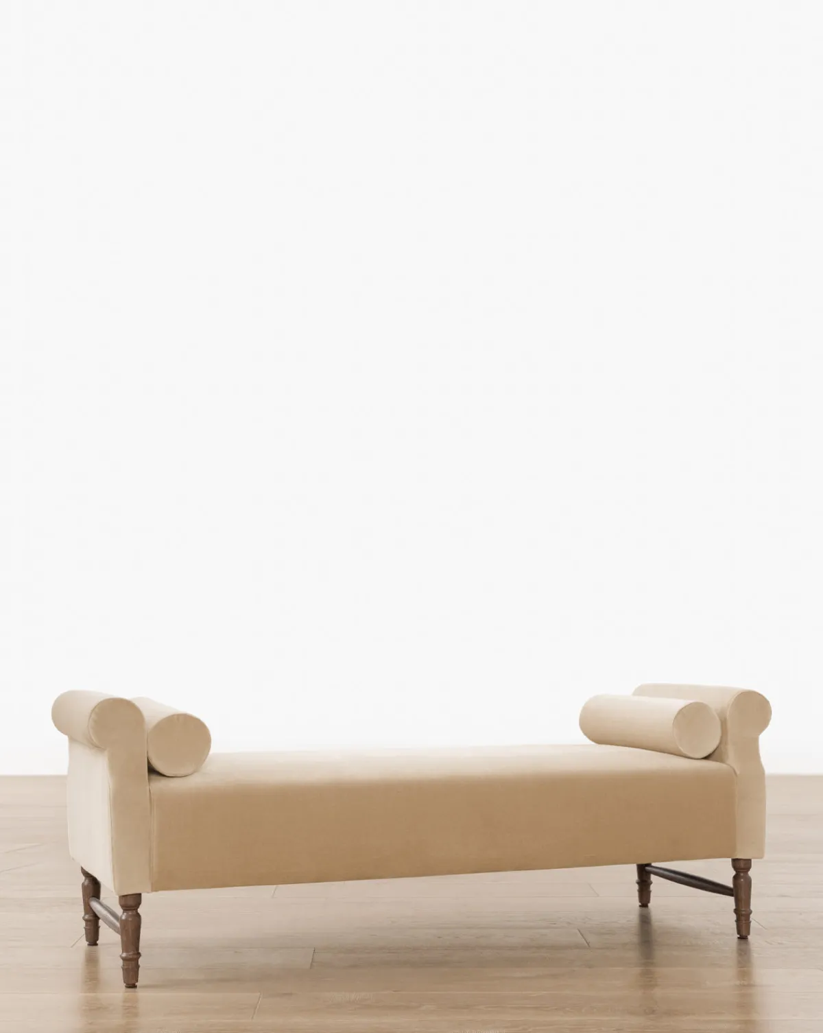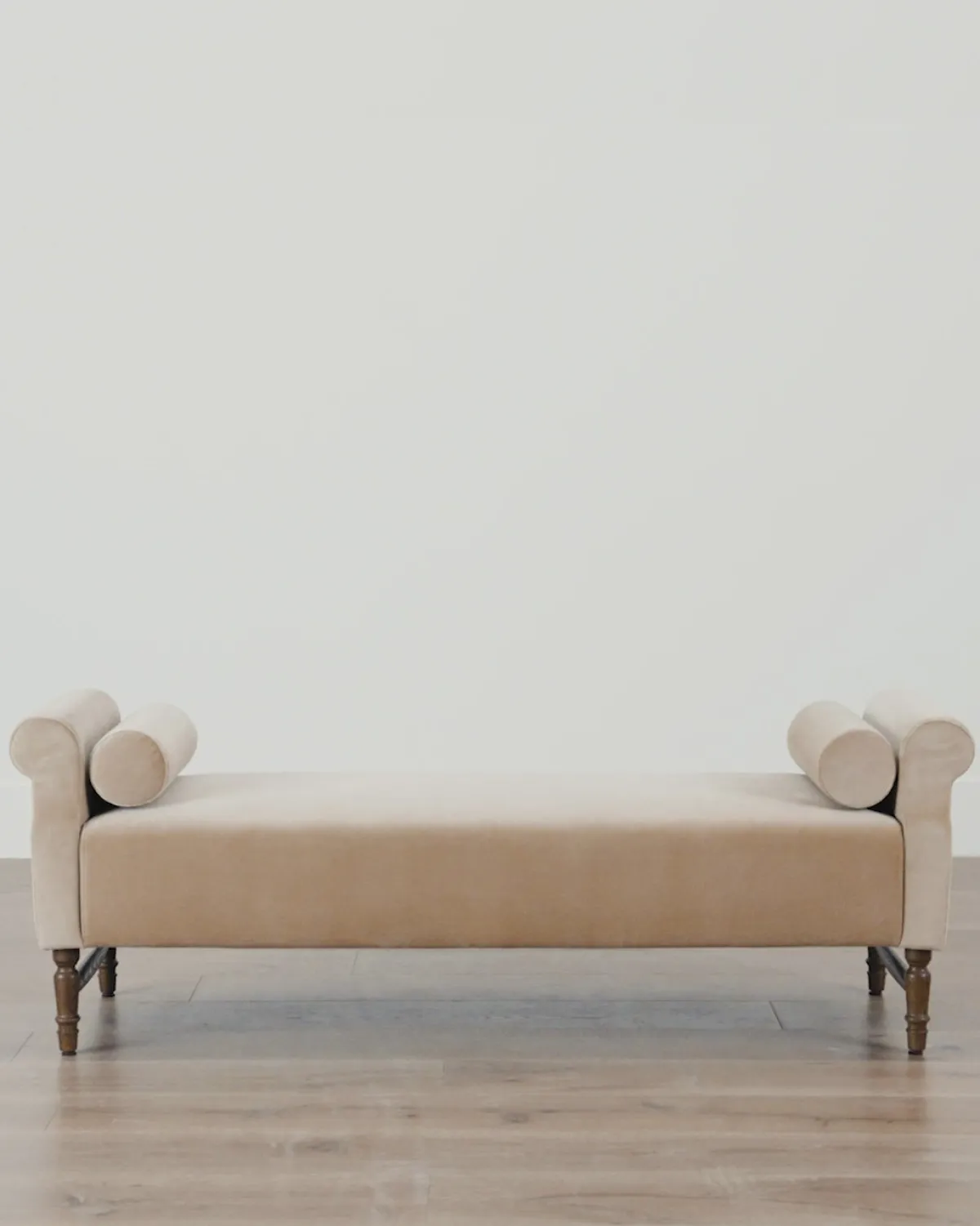 An updated take on a classic design, the Asher Bench welcomes rest while seamlessly lending a playful feel to the home with its pair of bolster pillows. A wide, welcoming seat cushion rests on an elegantly crafted base and is available in either a charcoal & ivory striped linen or a fawn cotton velvet.