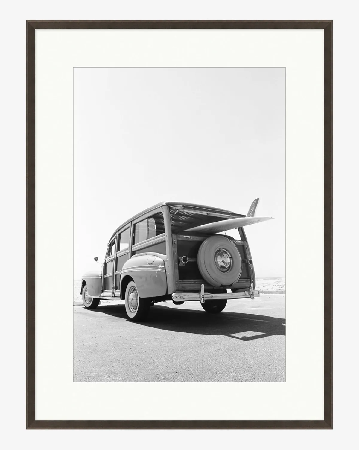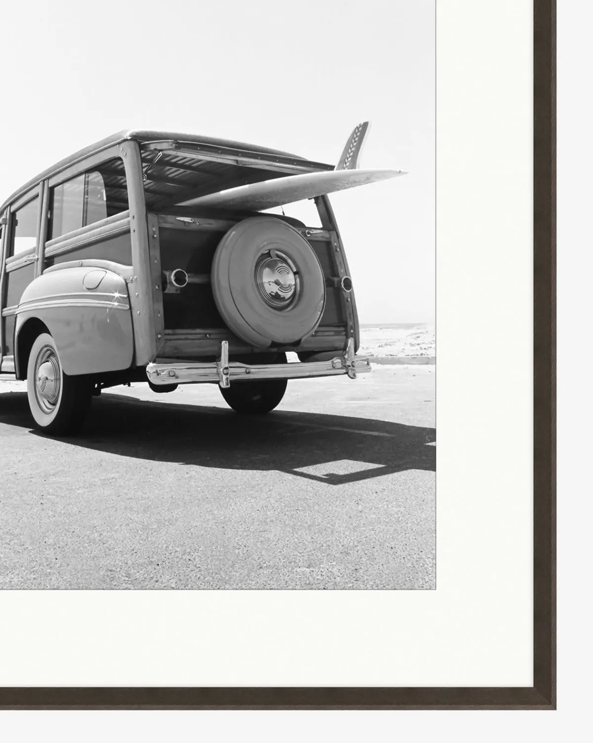 A black and white giclee print on paper, Classic Surf is nostalgic and charming. The photograph plays with line and shadow, creating movement within the piece. Mounted on a single mat and finished with reverse bevels, Classic Surf is a museum-quality piece with timeless personality.