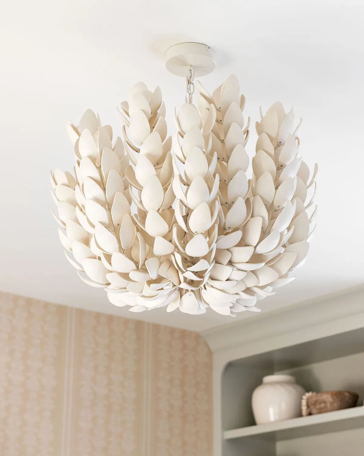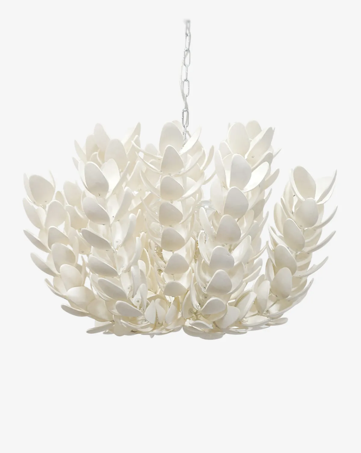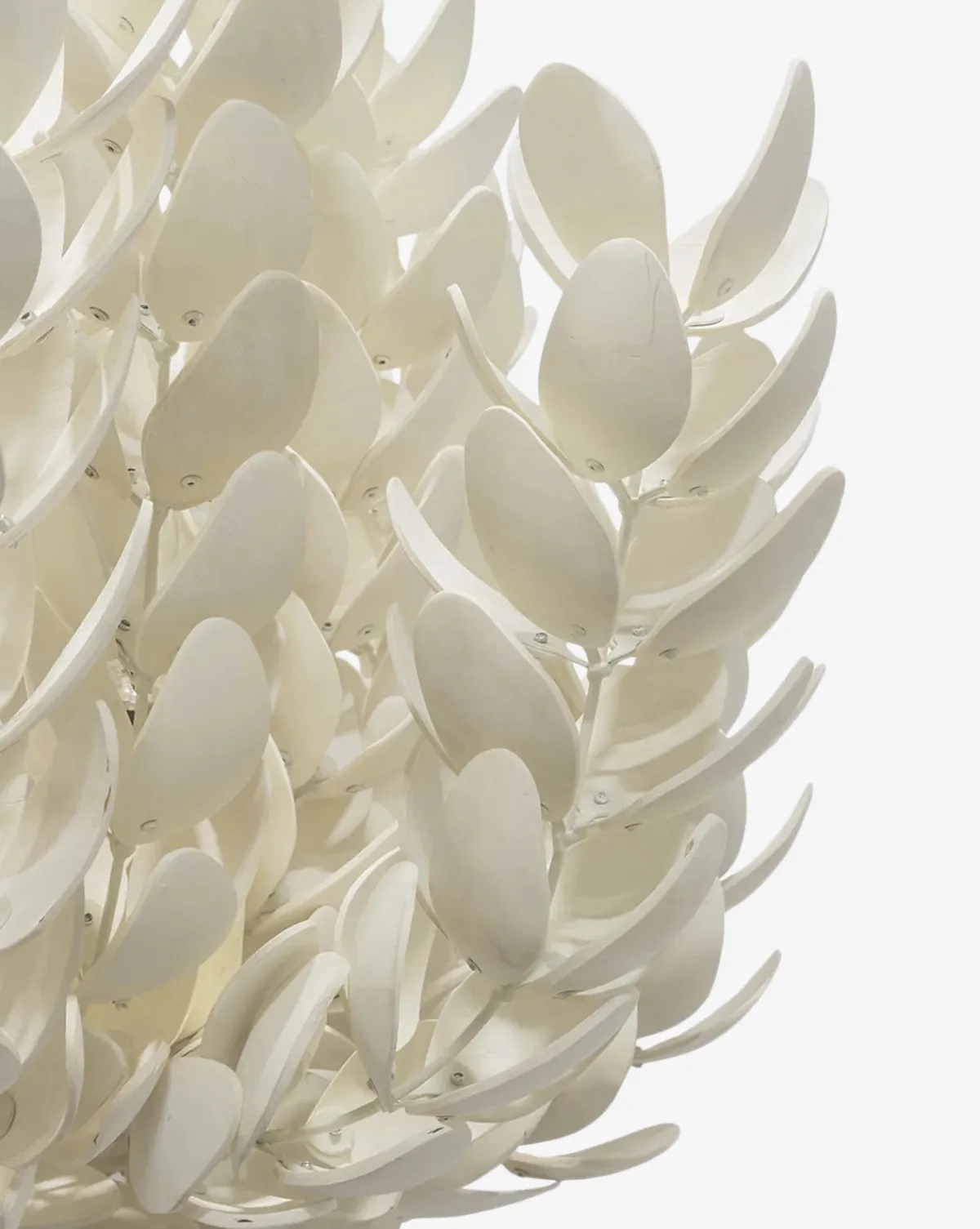 Hand-cut coco shells create the unique and beautiful shape of the Coco Magnolia Hanging Pendant. While providing ambient lighting, this piece also adds dimension and texture.