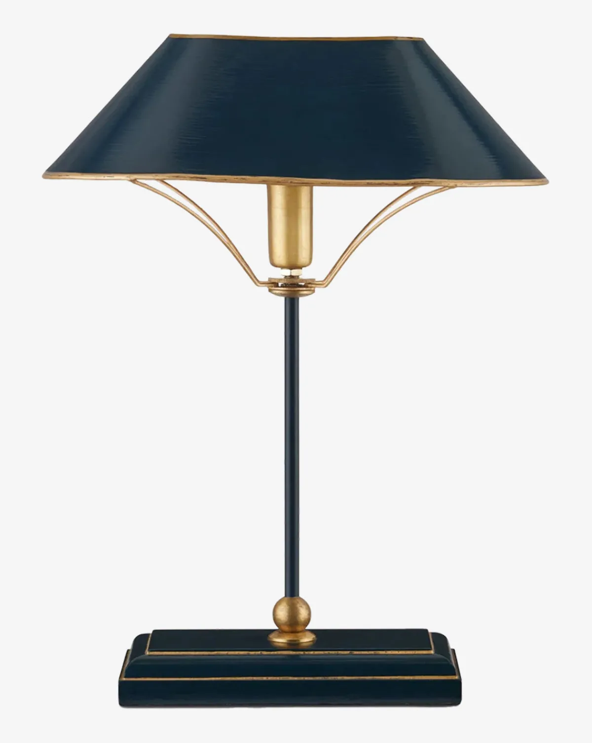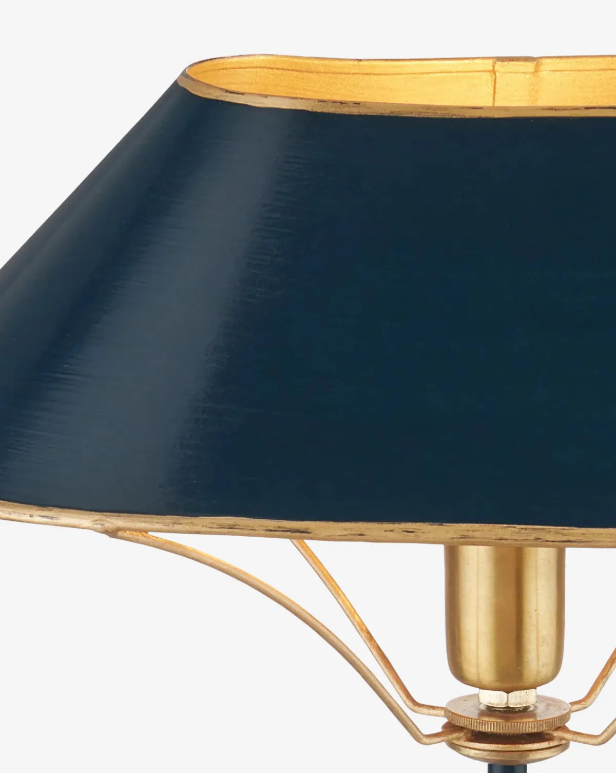 With a bold design, the Daphne Navy Table Lamp makes a statement anywhere it is styled. Its navy and gold hues and geometric forms bring both elegance and practical light to your space.
