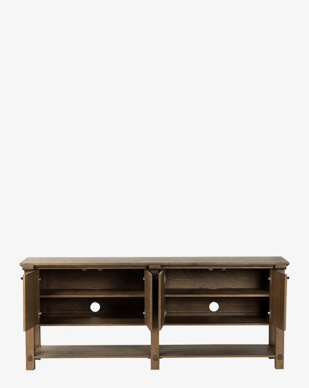 Crafted from tan solid oak and oak veneer, the Evaline Sideboard balances warmth and functionality. Black iron hardware adds a refined contrast, making it a versatile piece for both classic and modern interiors.