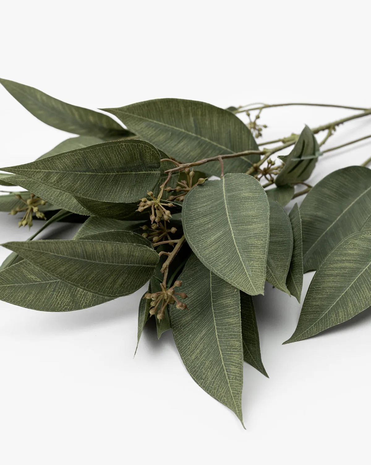 Realistically capturing the artful form and palette of a eucalyptus branch, the Faux Eucalyptus Branch is ideal for styling alone or as part of an arrangement in a vase. Between the rich green hue and the stem full of textural leaves, the faux stem brings interest and dimension to your vignettes.