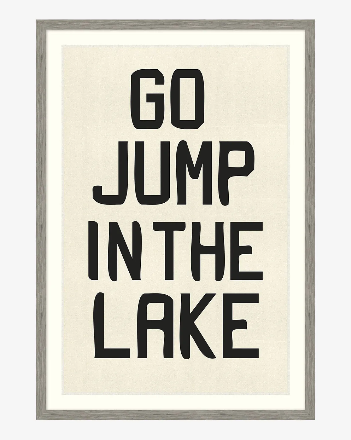 With the feel of a vintage camp flag, Go Jump in the Lake brings power and simplicity to your decor. The giclee print on raw canvas has frayed edges and is mounted on a mat in a shadowbox, for extra textural display and a refined gallery feel.