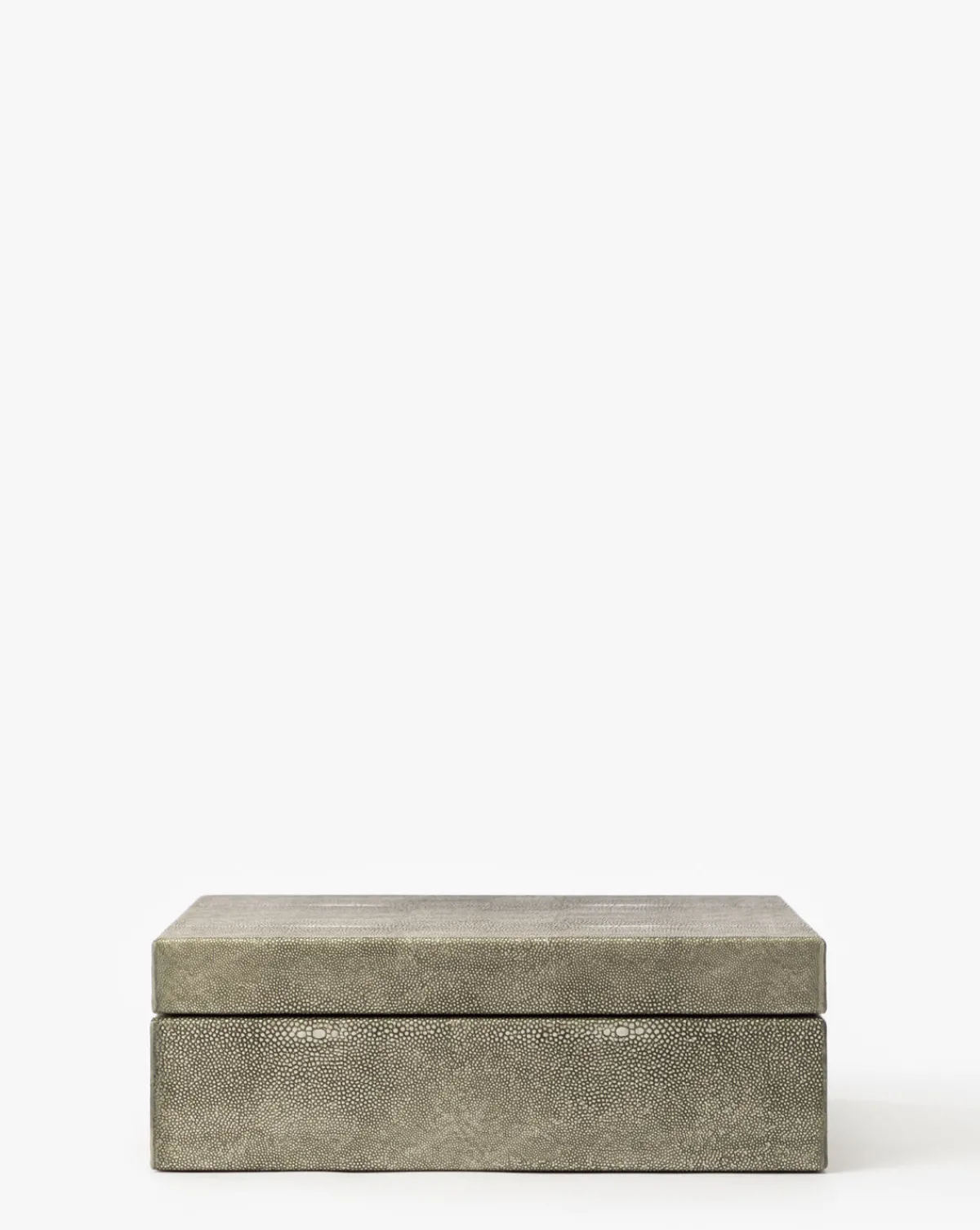Finished in gray leather with a practical, low-profile form, the Gregory Shagreen Leather Box is perfect for adding interest to styling while also providing functional storage. Styled on a desk or console table, the box gives soft visual appeal to your space.
