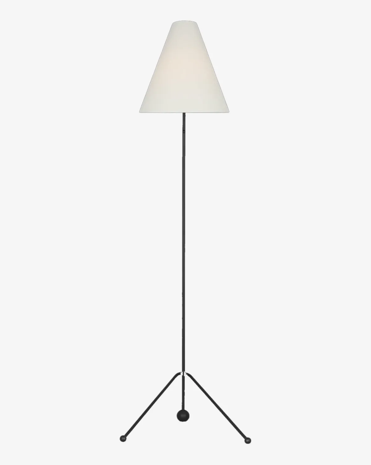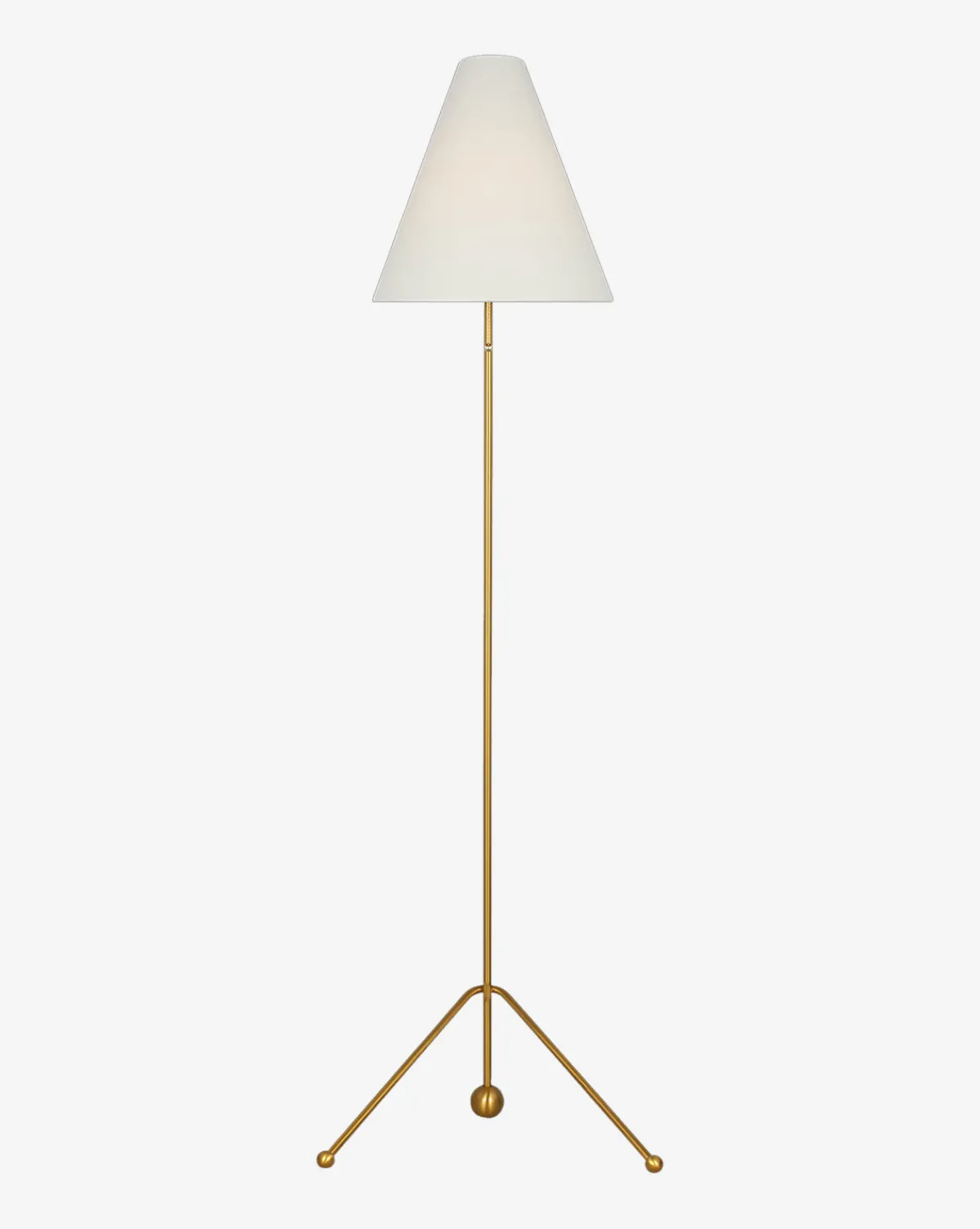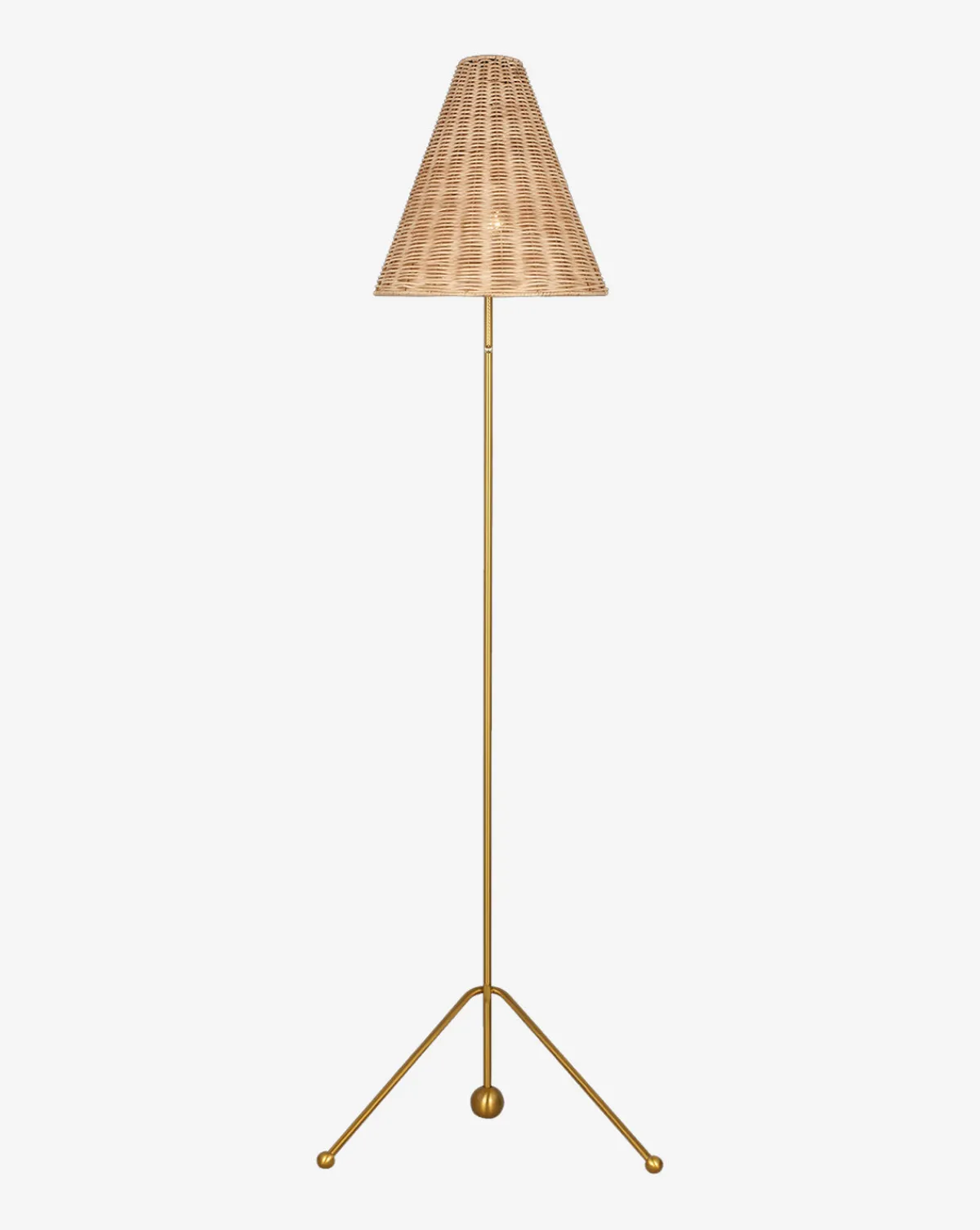 Featuring a streamlined yet organic tapered shade woven from rattan, the Gustav Floor Lamp is made from steel in either an aged iron or burnished brass finish. Seamlessly blending modern shapes with textural materials, this floor lamp brings an airy tone to your rooms.