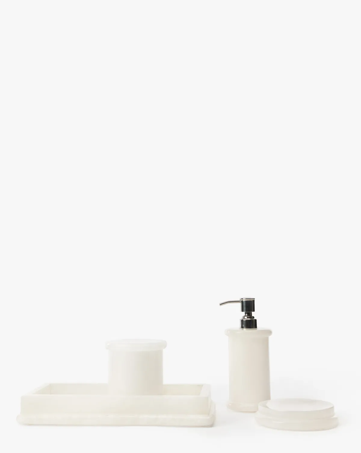The Jennings Bath Collection brings the simple elegance of white alabaster to your bathroom decor. With subtle natural detail, each piece is a functional and beautiful addition to your space.