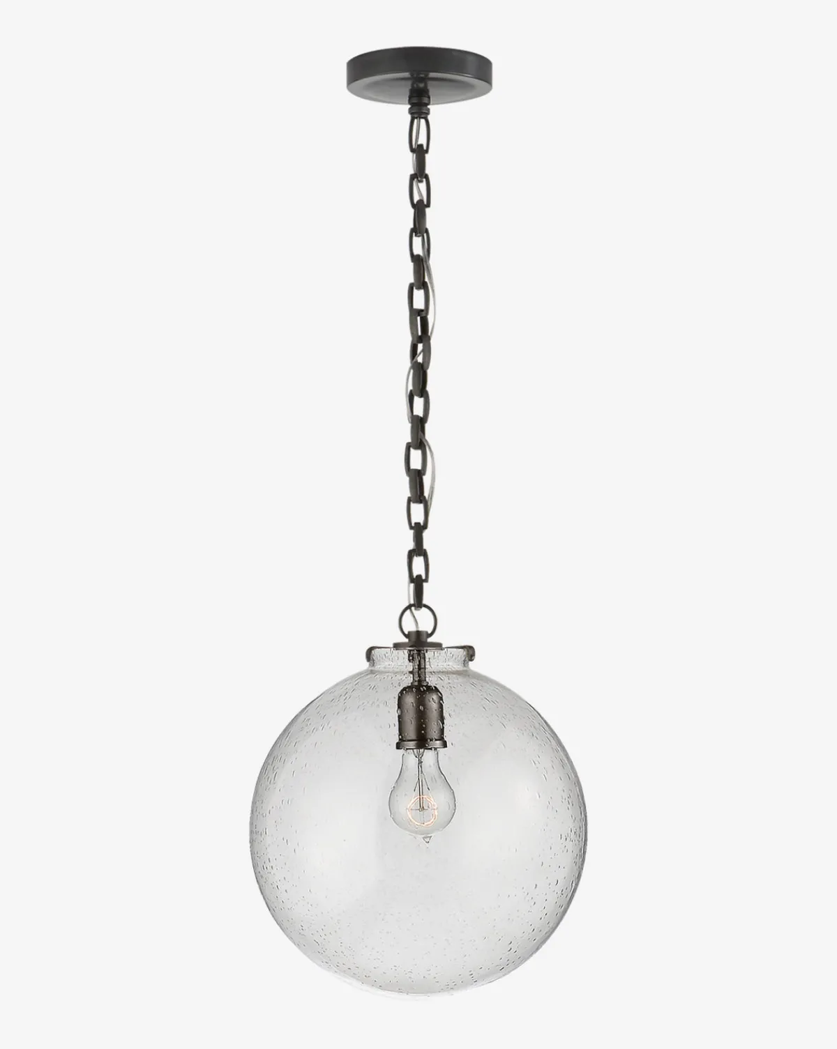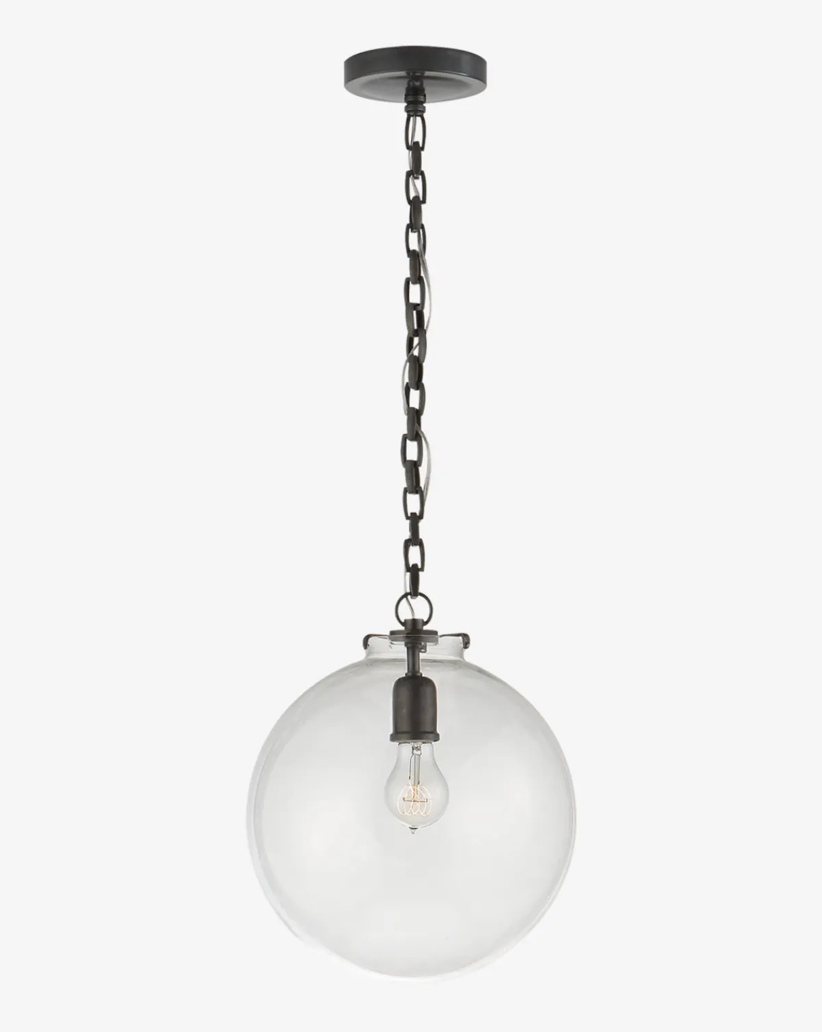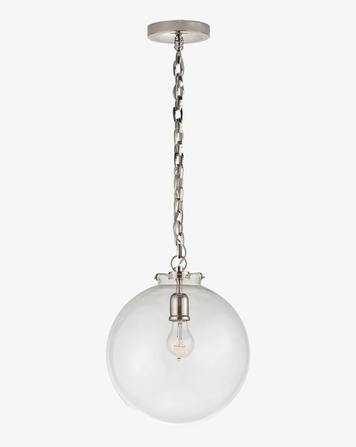 This traditional round glass globe pendant will illuminate your space with its stunning glow. We love that the chain link gives just enough edge to the shine of the glass.