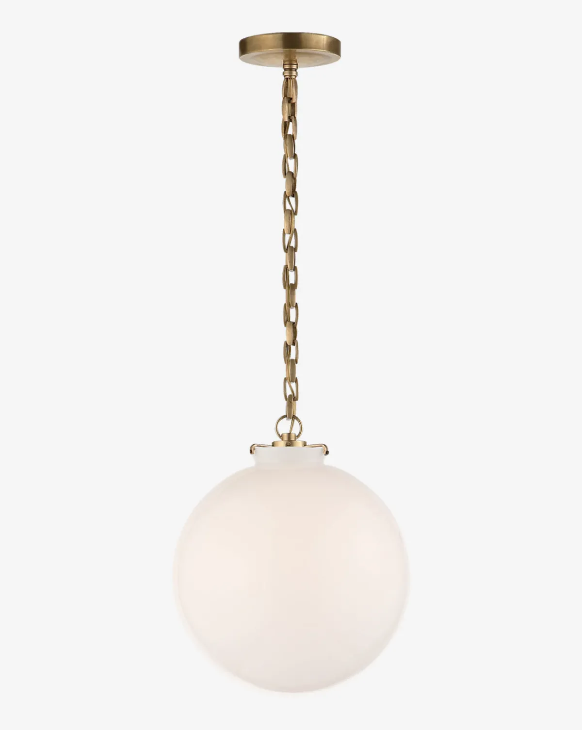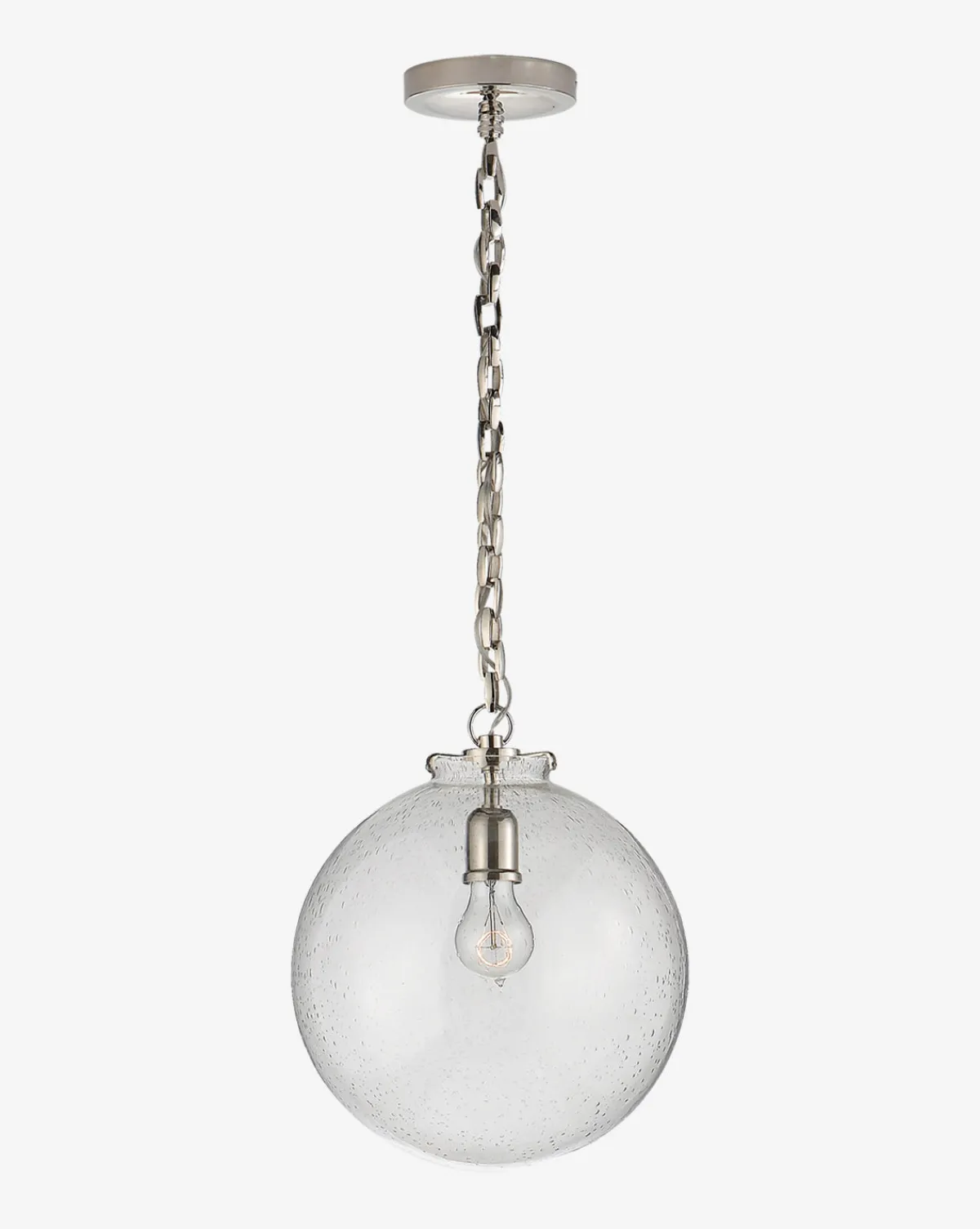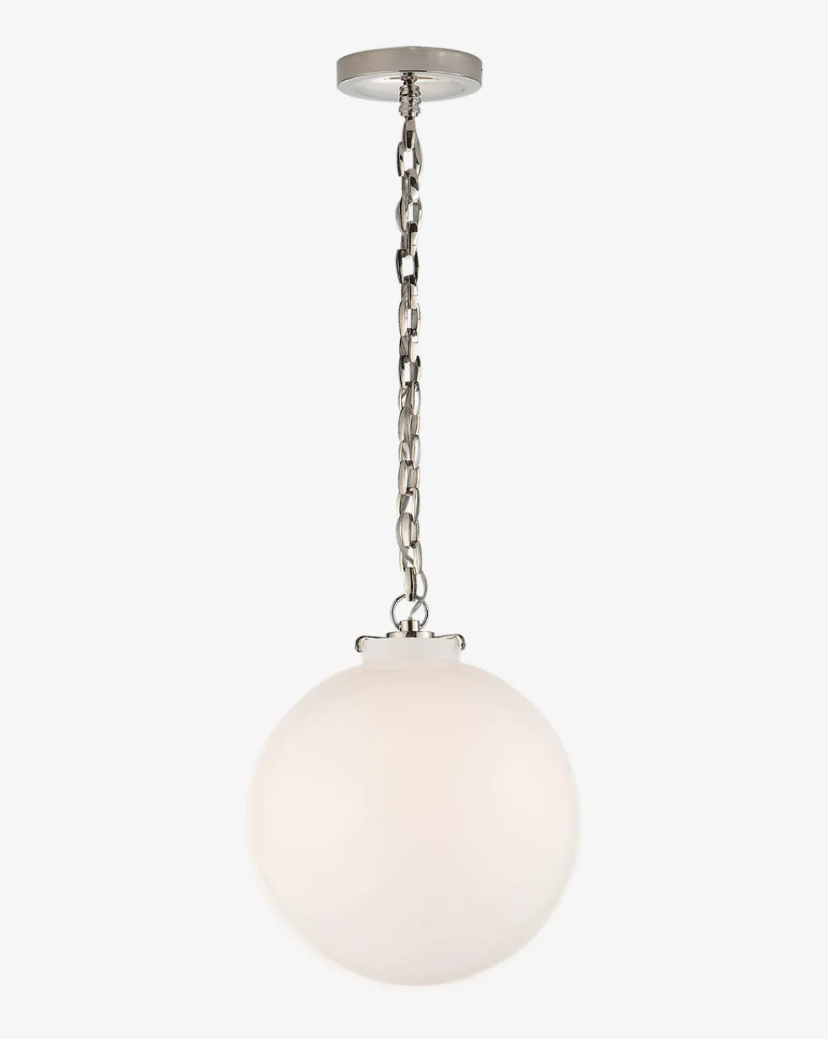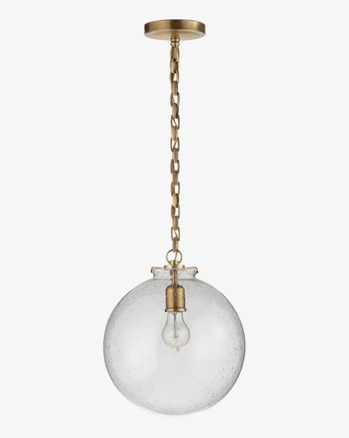 This traditional round glass globe pendant will illuminate your space with its stunning glow. We love that the chain link gives just enough edge to the shine of the glass.