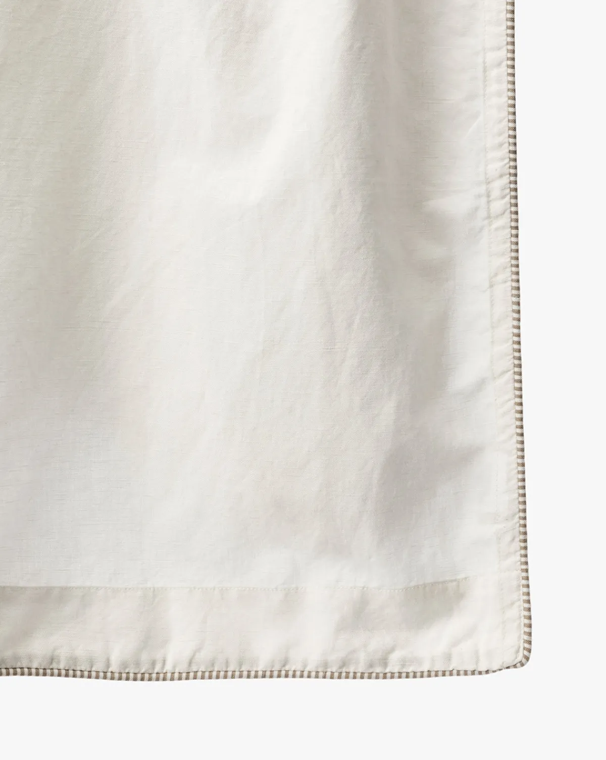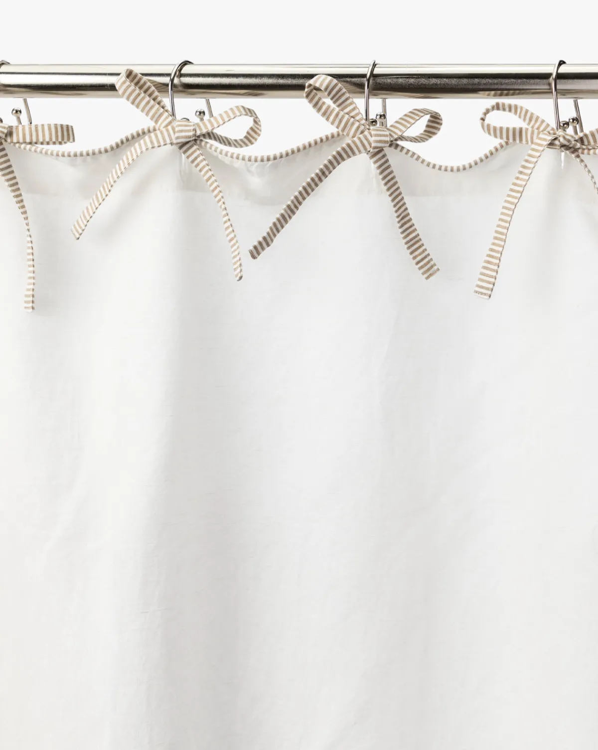 A lightweight shower curtain with loose ties at its top hem, our Lillian Linen Shower Curtain is both elegant and simple. The brown ticking stripe piping and tie details are a natural accent to the white linen-cotton blend, highlighting the subtle beauty of this shower curtain within your bathroom space.